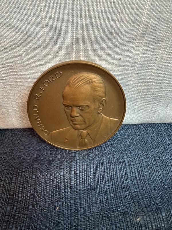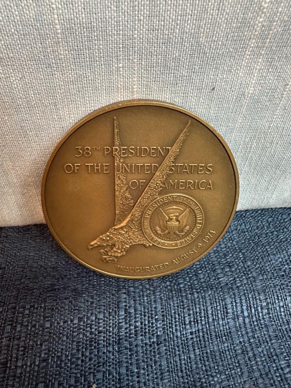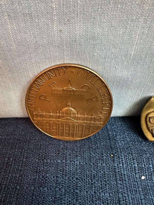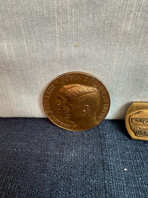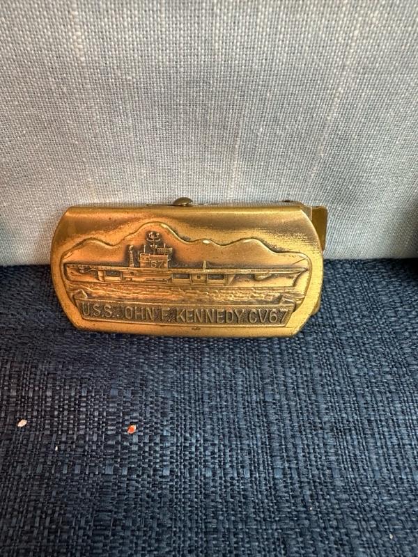 USS, John F Kennedy belt buckle + 2 paperweight coins