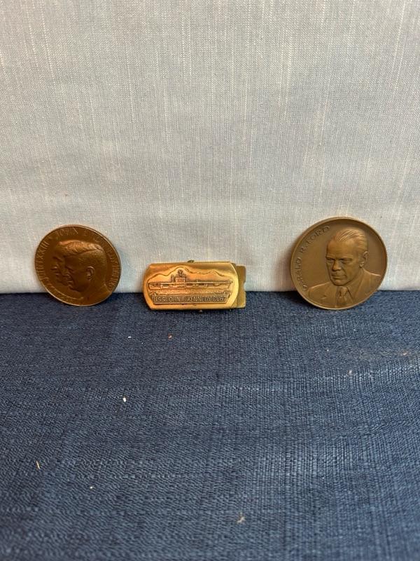 Lot 76, USS, John F Kennedy belt buckle + 2 paperweight coins
