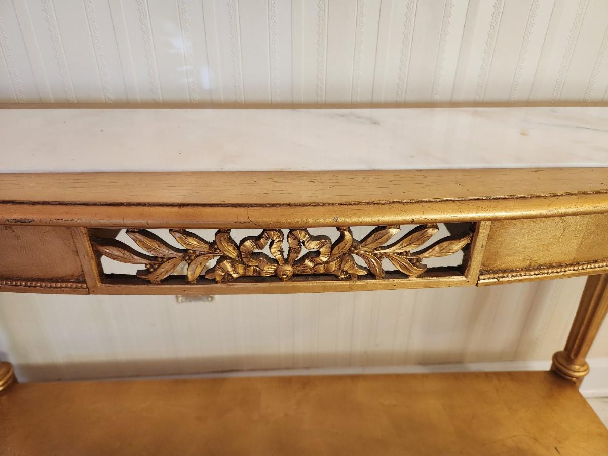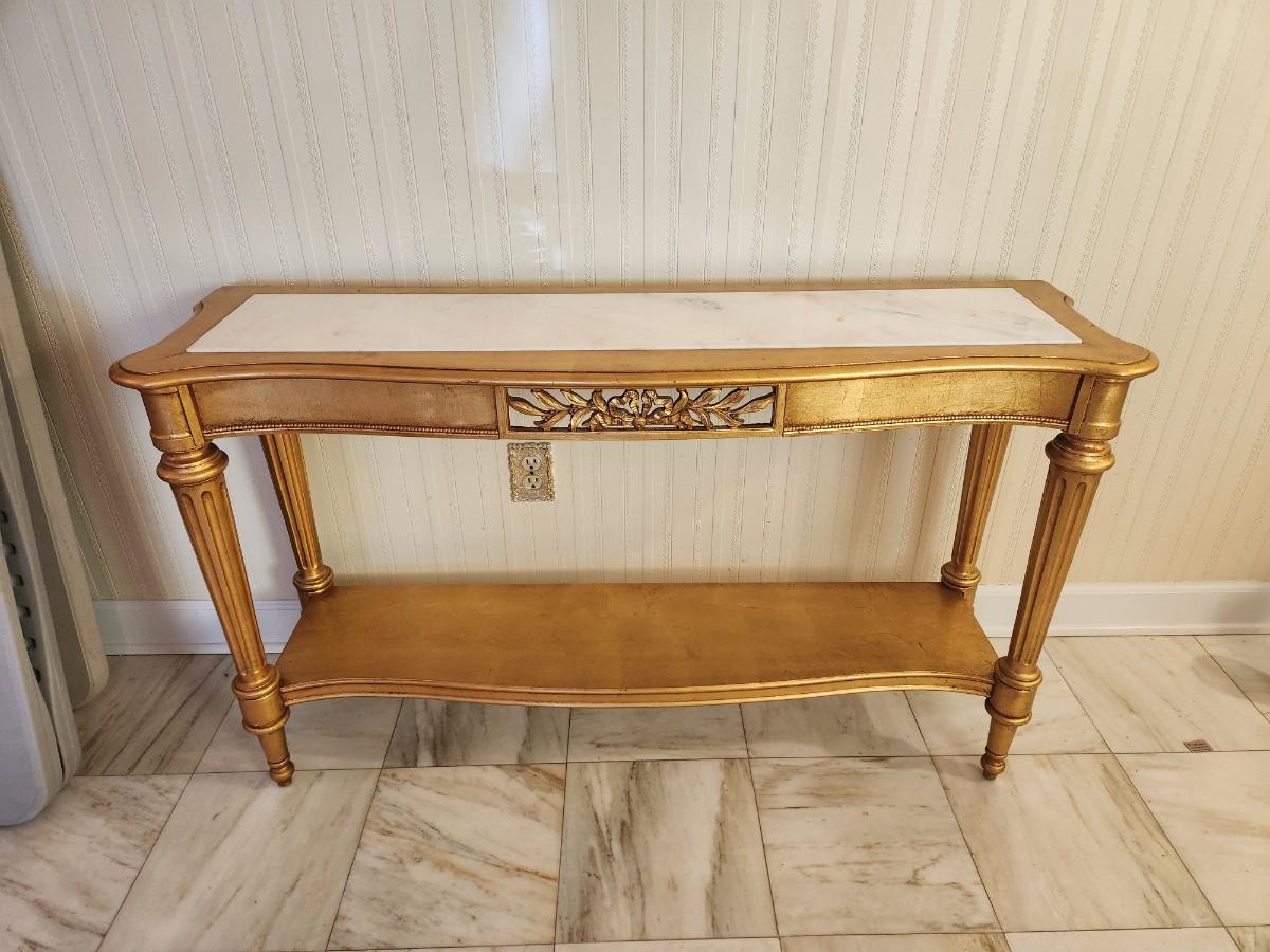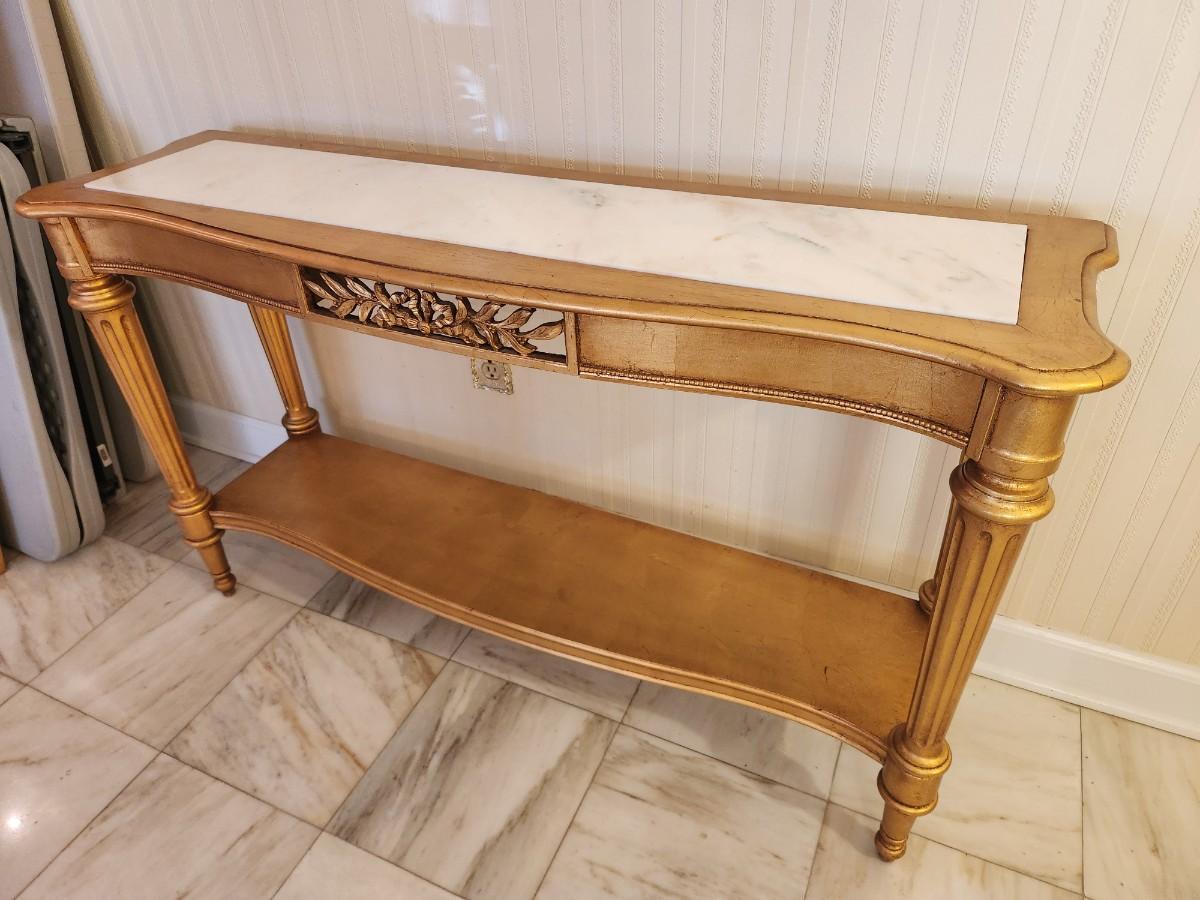 Marble top Hollywood Regency style (1970's) sofa/foyer table - 50" across, 14" deep, 29" tall - good condition. Would also make a great home bar!