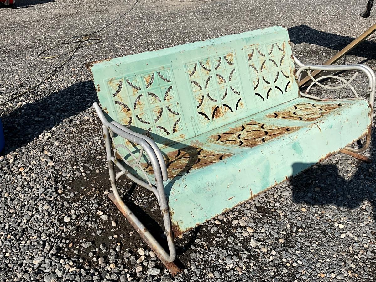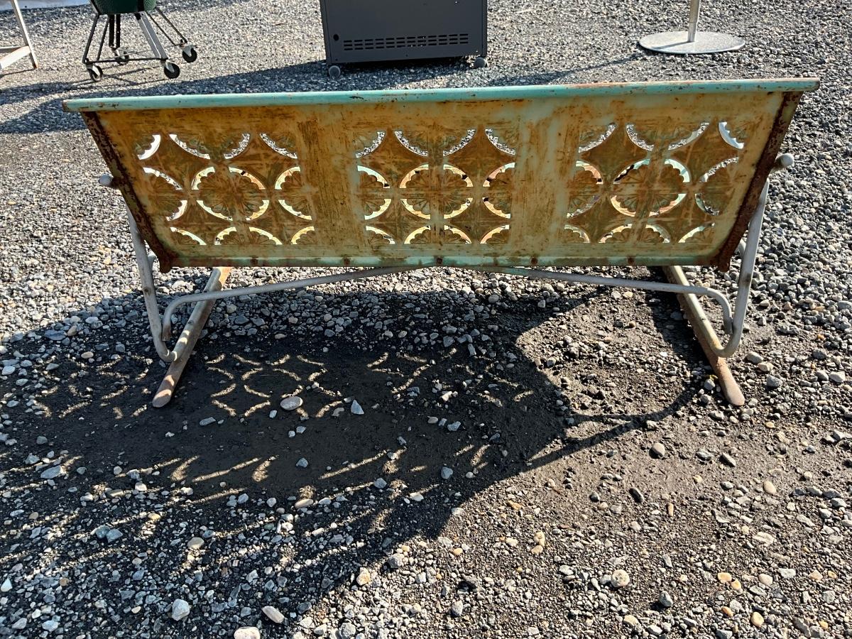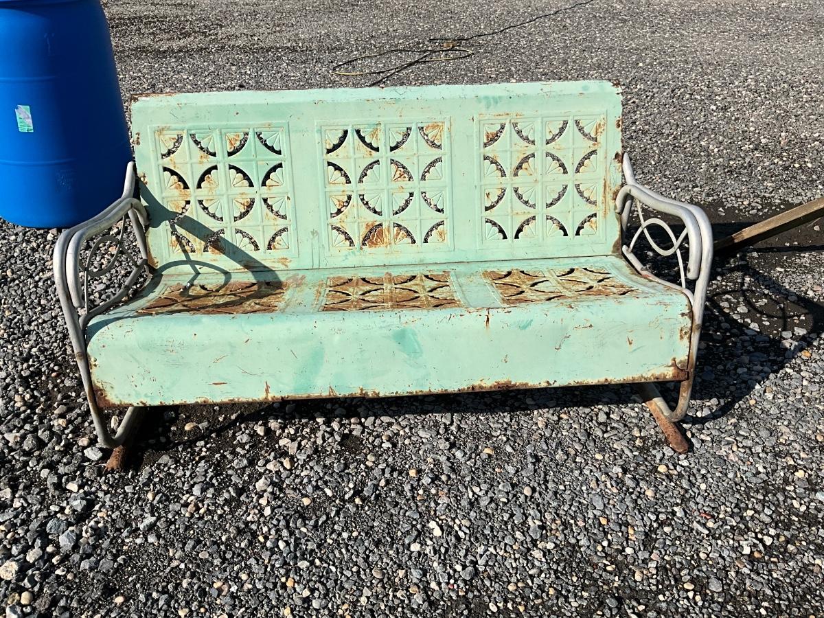 Vintage Metal Porch Bench, measures 56.5” Wide x 18” S/d x 30” High x f/s 15”
