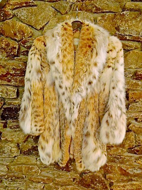 Outstanding real fur spotted lynx 3/4 length shawl collar jacket from Makos of Toronto, Canada. Has been well cared for. May need cleanining. Previous owner's name is embroidered on inside lining. appears to be a size 8. Big shoulder look of the 80's with no padding.