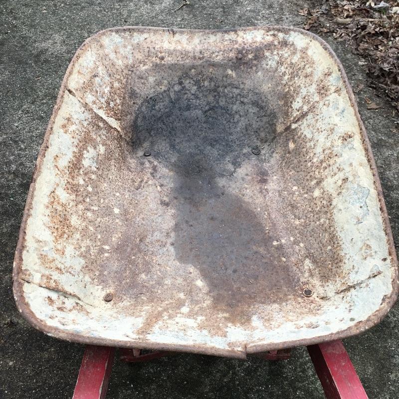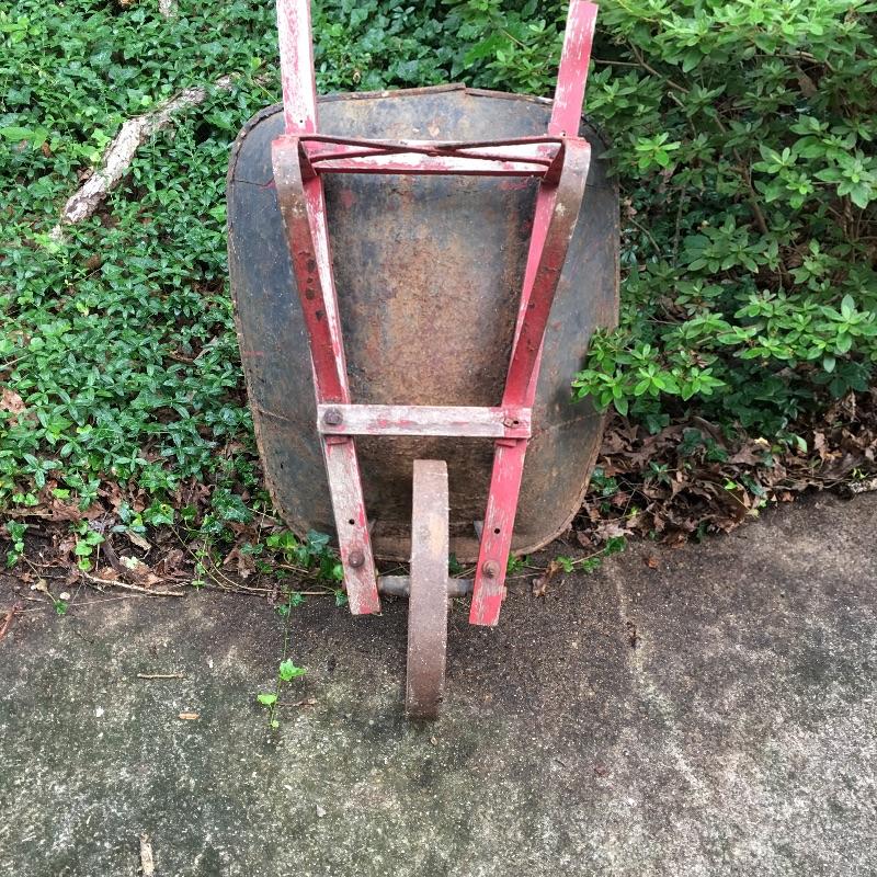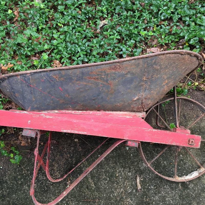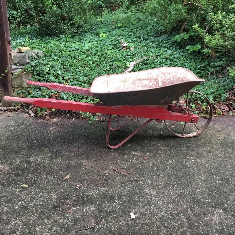 Vintage wheelbarrow with metal wheel. A great wheelbarrow to use as you will never get a flat tire or to make a great planter. Wheelbarrow measures 26” x 61” x 26”.