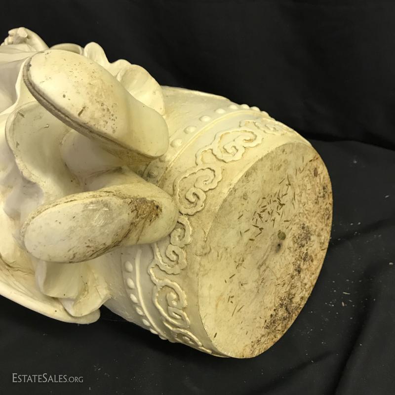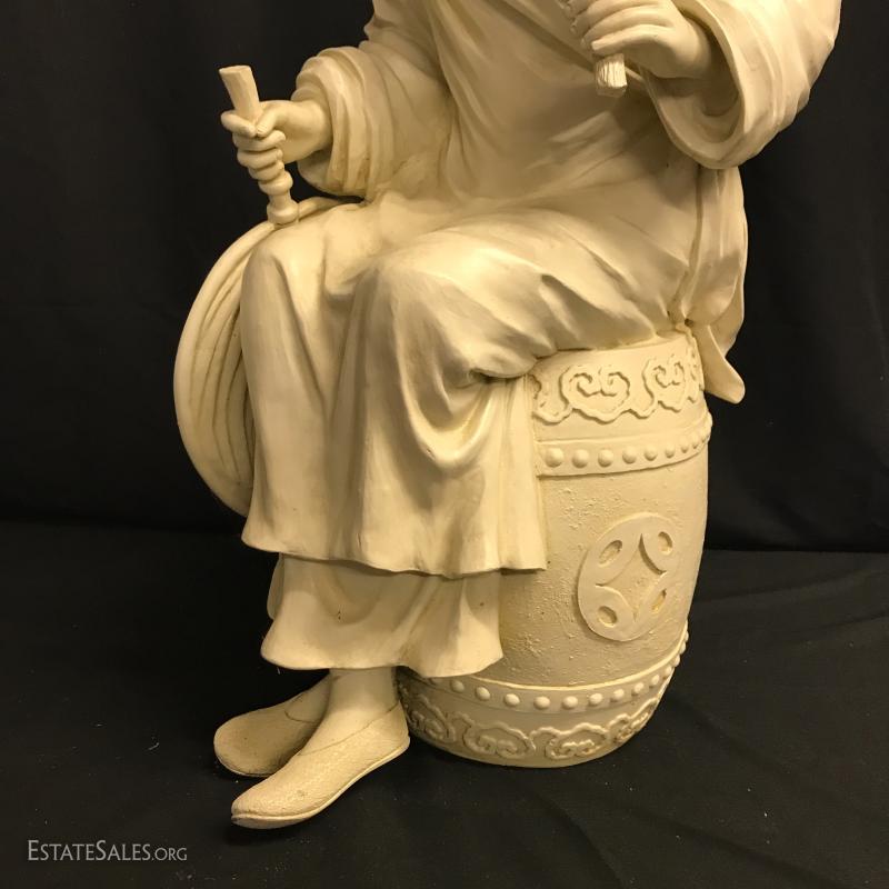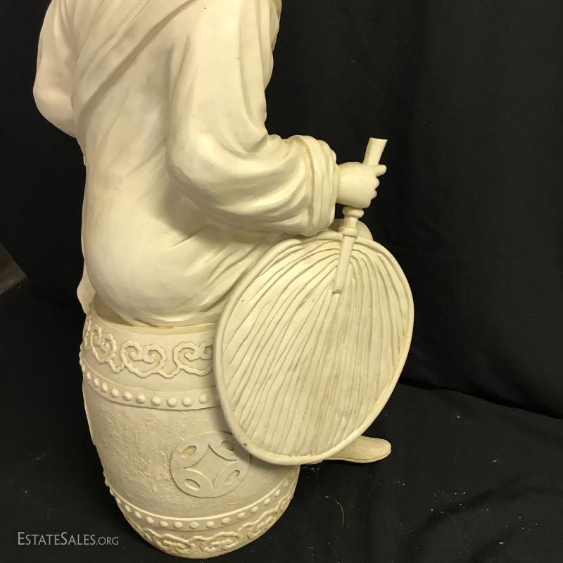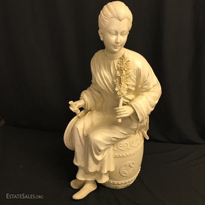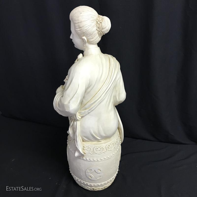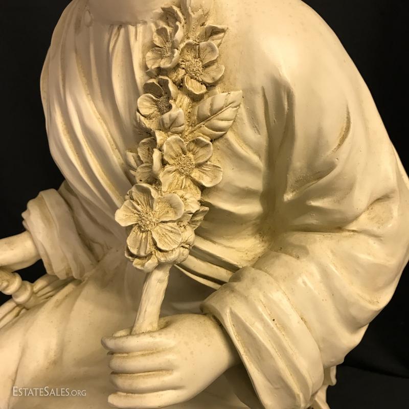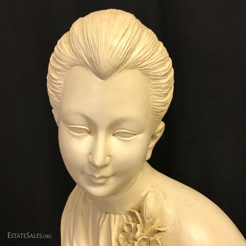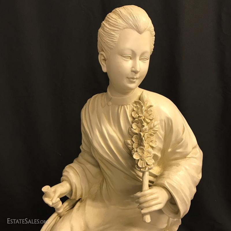 Large statue of woman holding flowers and a fan. Nice detail. Large piece makes great decor. Made in China, 31.5" tall.