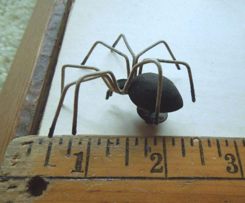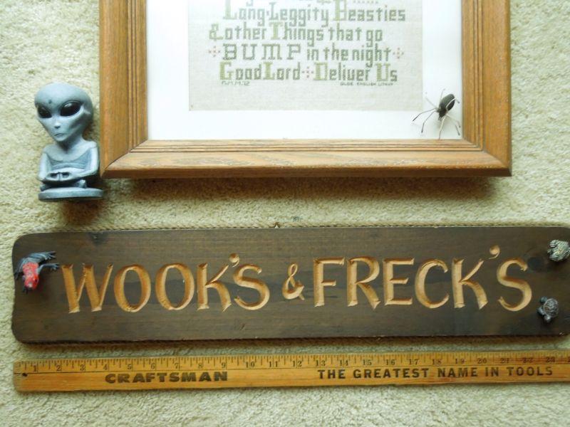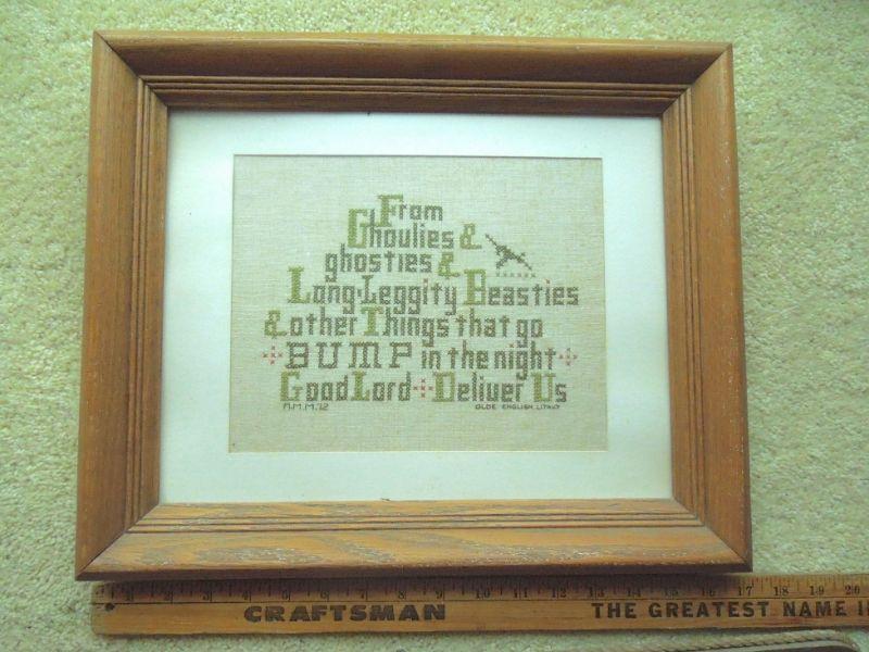 Framed 17 x 14 needlework cross stitch of Old Englih litany; a 2.5" spider lapel pin; a wooden Wooks and Frecks carved 24" L plaque with rope trim; a Oaxacan bobbing armadillo; a 5" Alien Inustries meditating resin alien; 2 small clay frogs and a turtle.