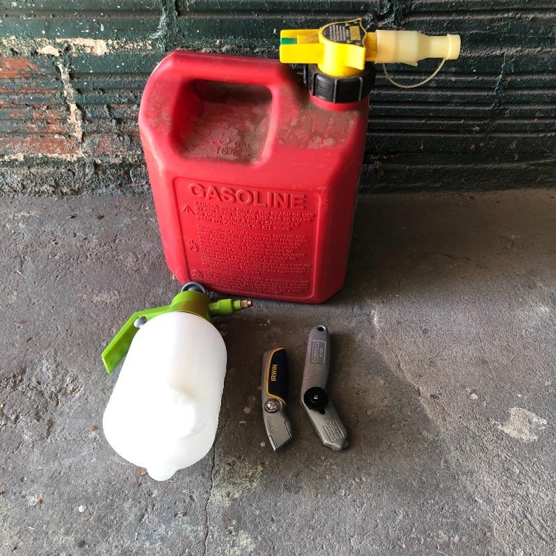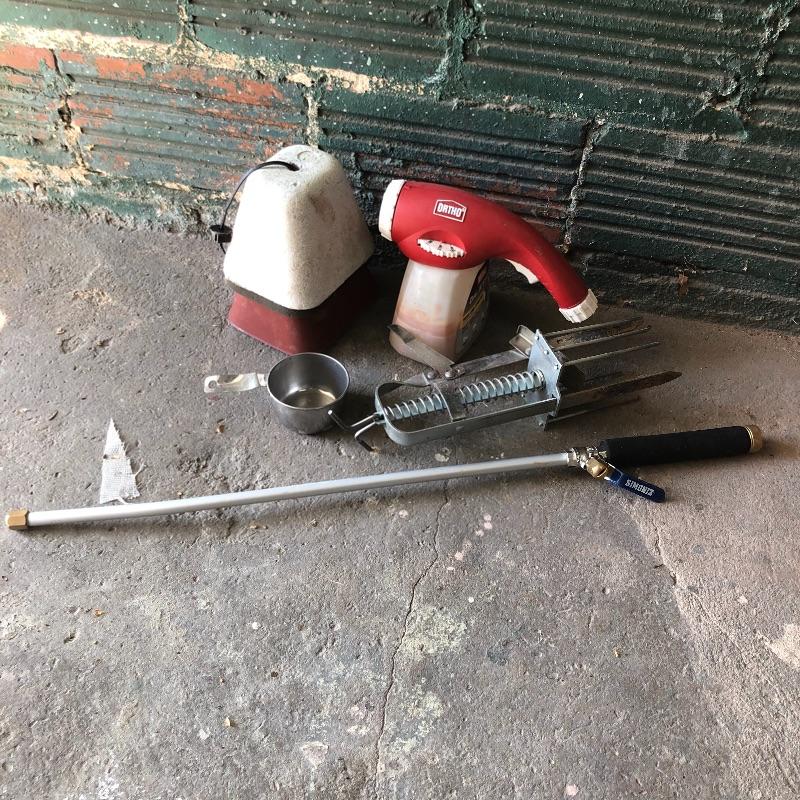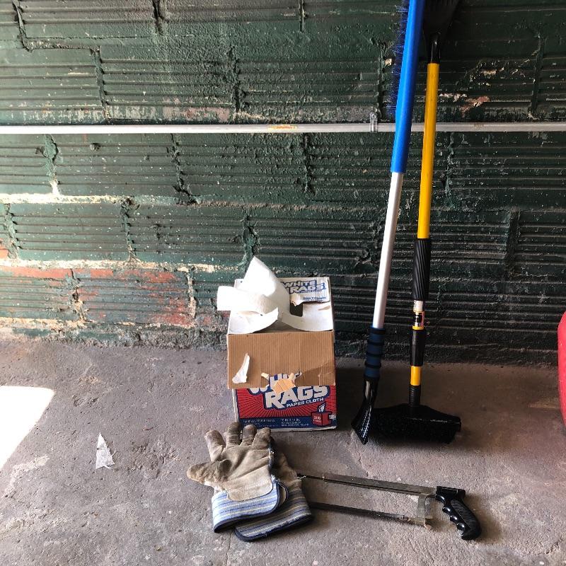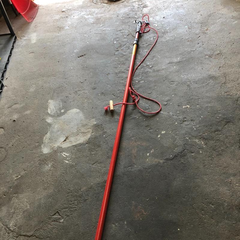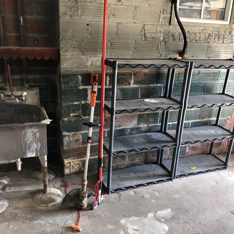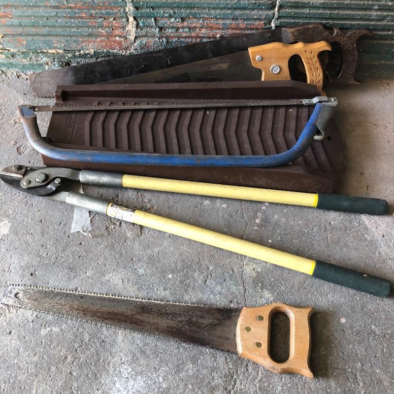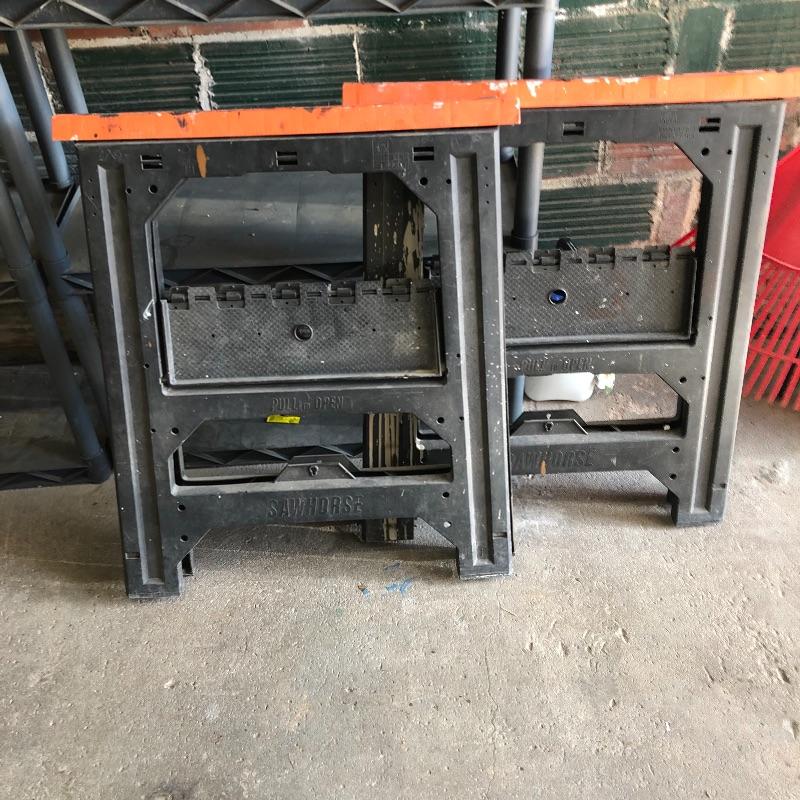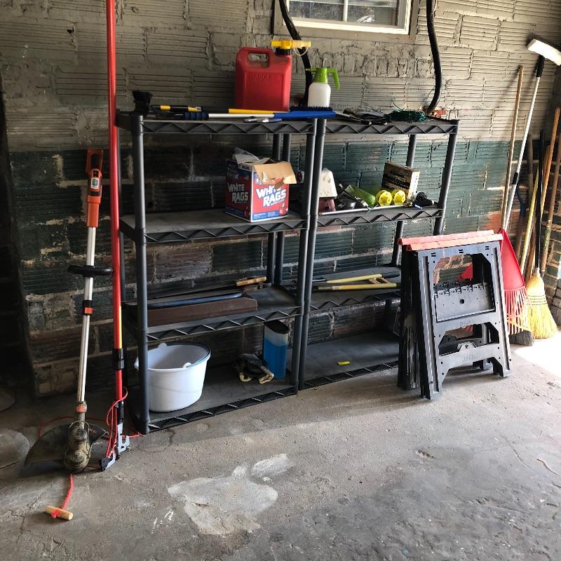 Get the tools you need in one fell swoop with this lot. Lot includes pole lopper, Black & Decker trimmer with no battery, mole trap, hand sprayer, spigot protectors, saws, saw horses and more. Shelves not included but available in lot 77.