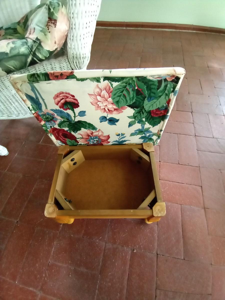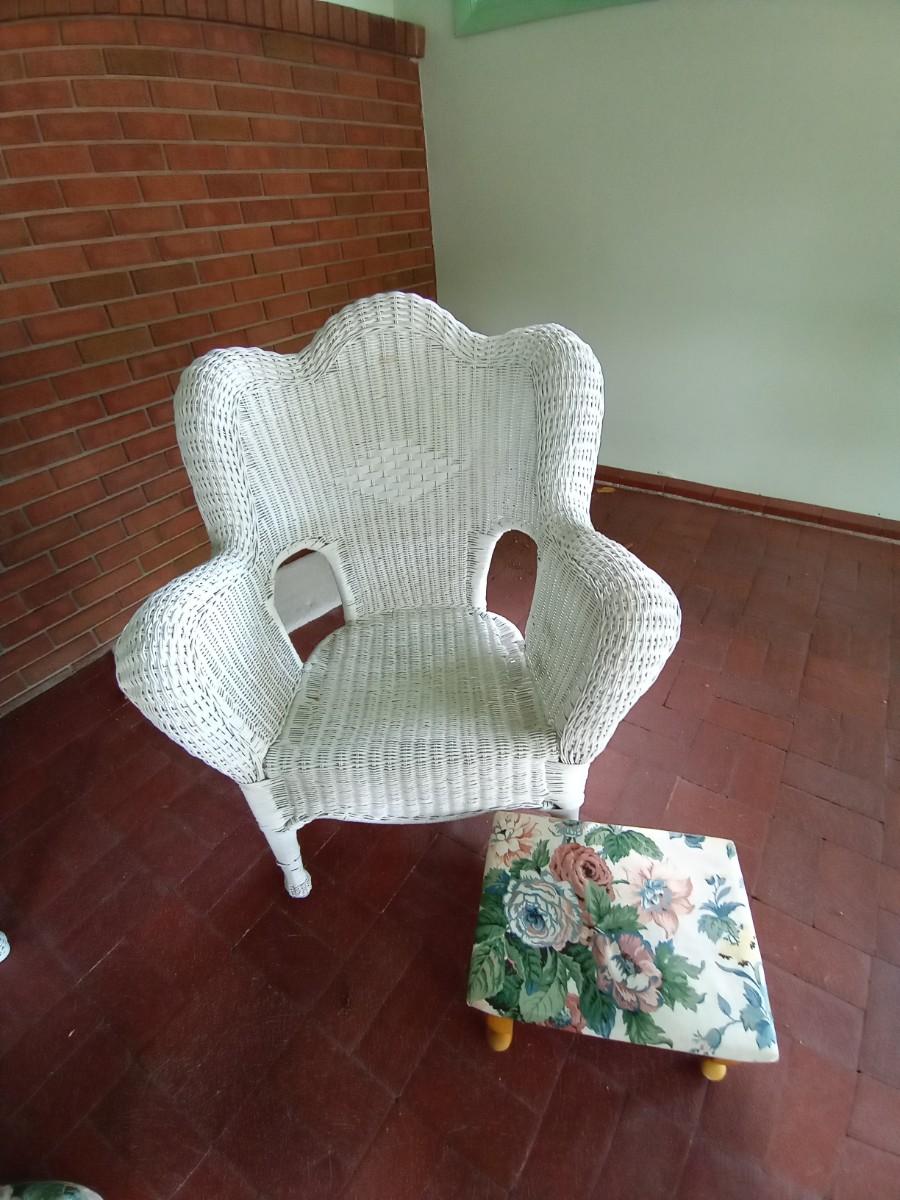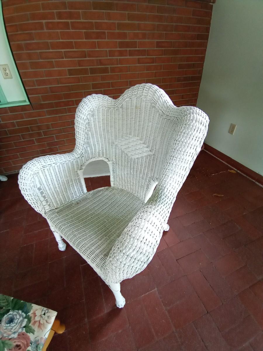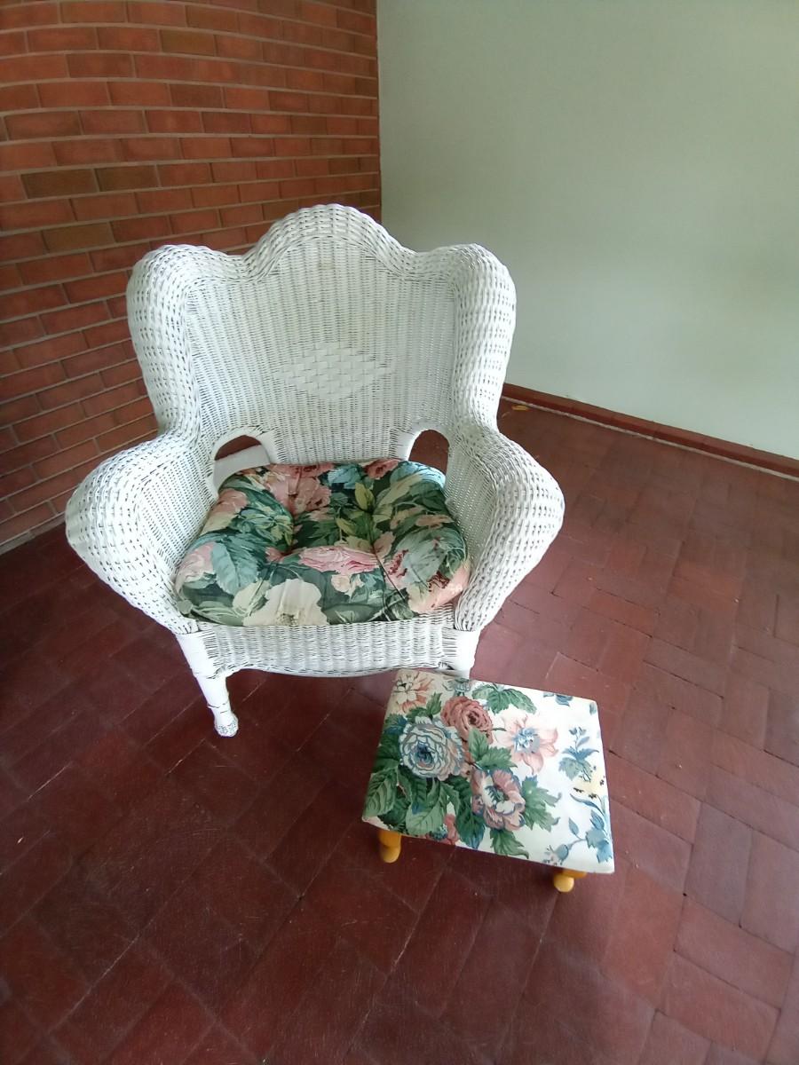 W HITE WICKER CHAIR MEASURES APPROX. 30X36 AND STORAGE FOOT STOOL 15X11 CUSION INCLUDED
