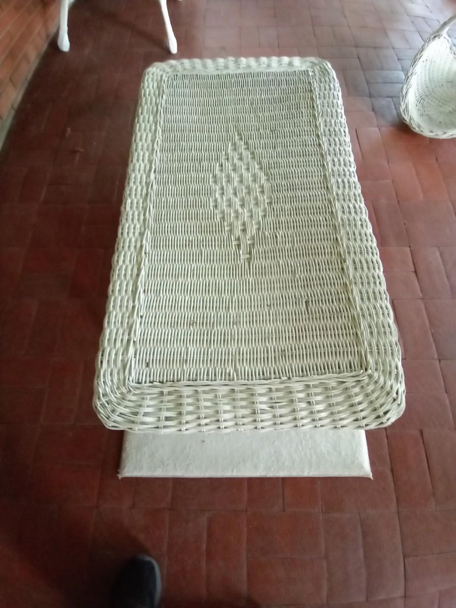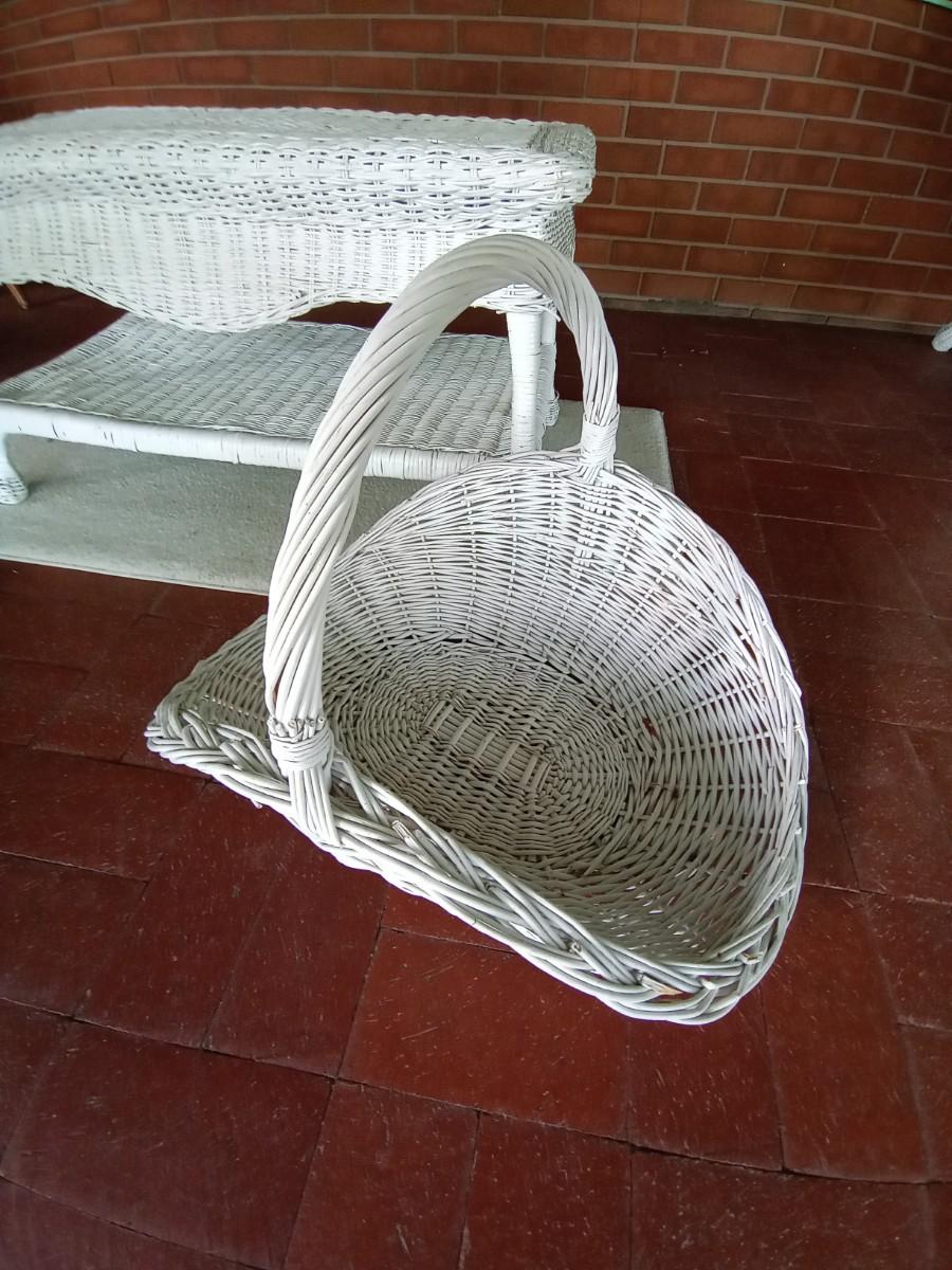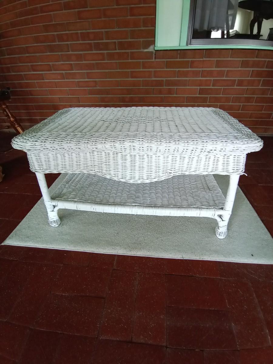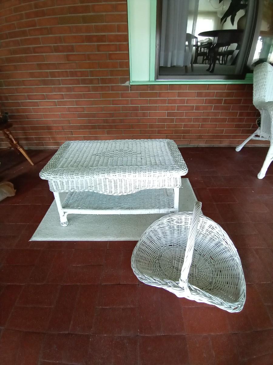 WHITE WICKER COFFEE TABLE MEASURES APPROX 48X29. AND WHITE WICKER BASKET