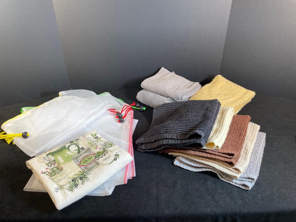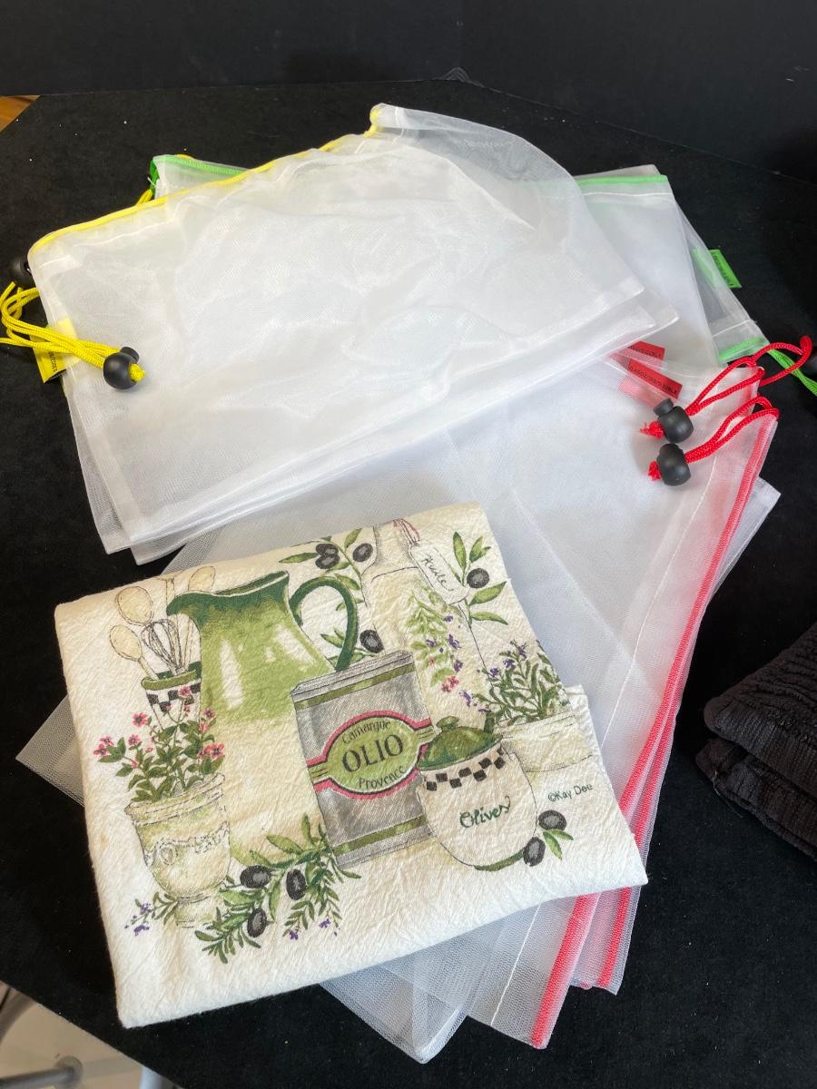 8 produce bags, glass cloth and 8 cotton kitchen towels