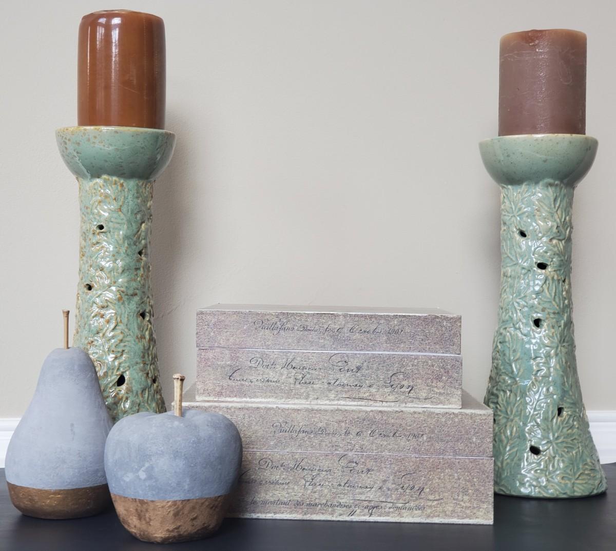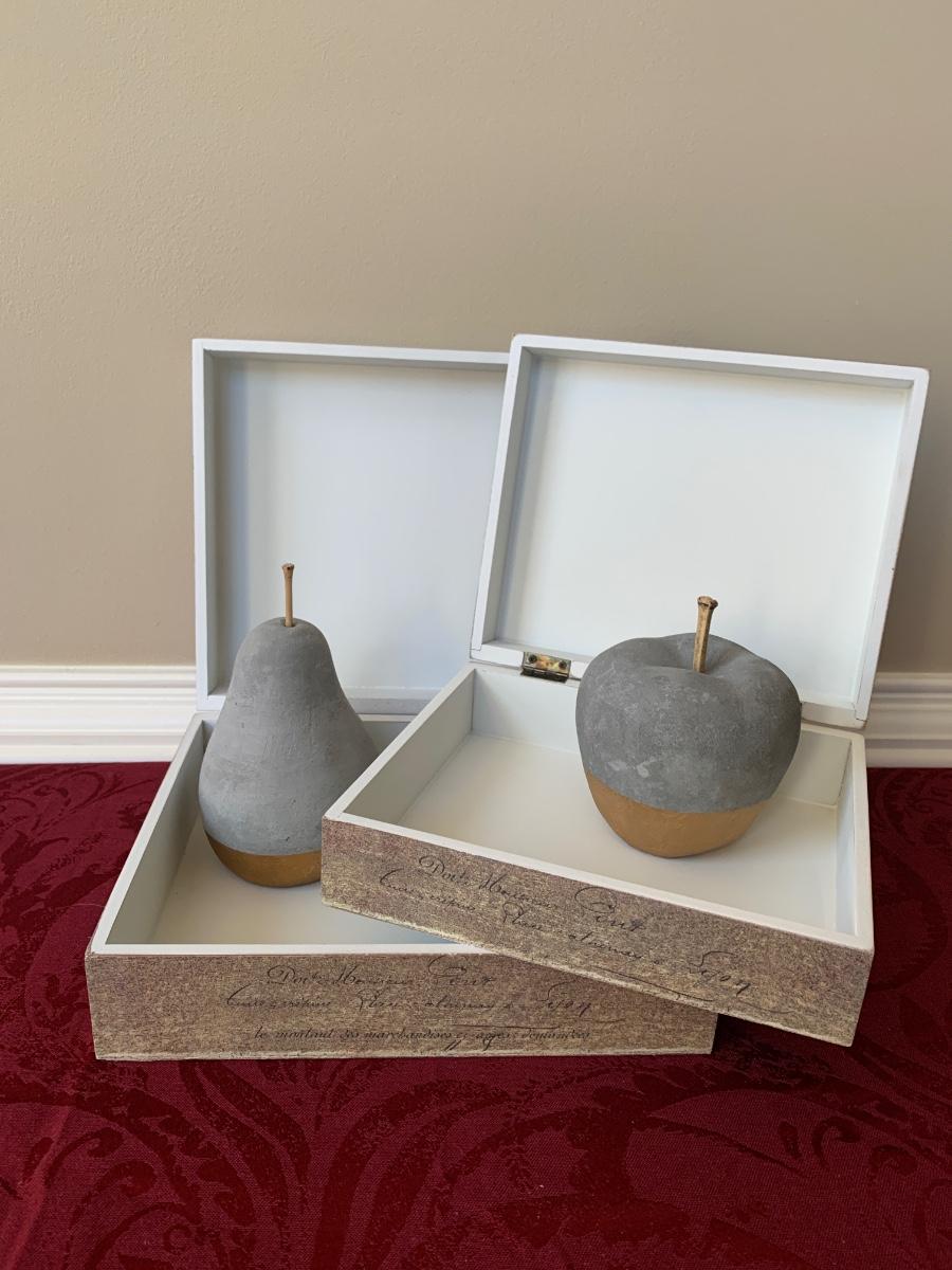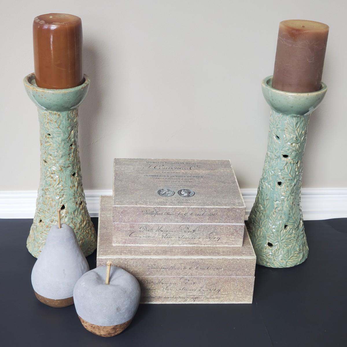 LOT 6G: Home Decor: Pillar Candle Holder w/Candles, Stone Apple & Pear & Rustic Boxes