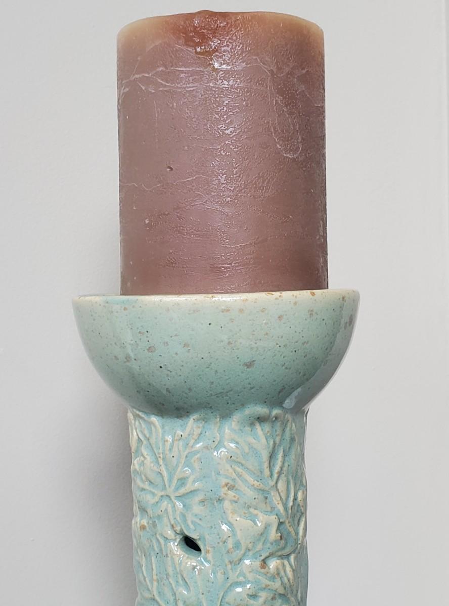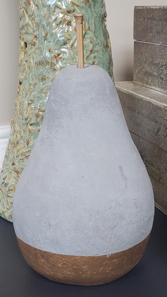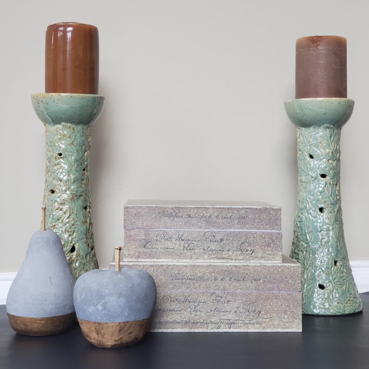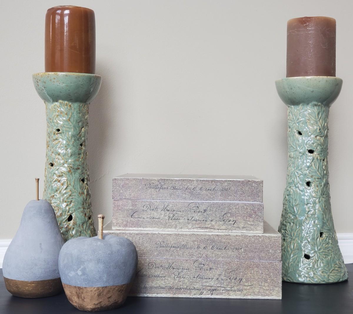 LOT 6G: Home Decor: Pillar Candle Holder w/Candles, Stone Apple & Pear & Rustic Boxes