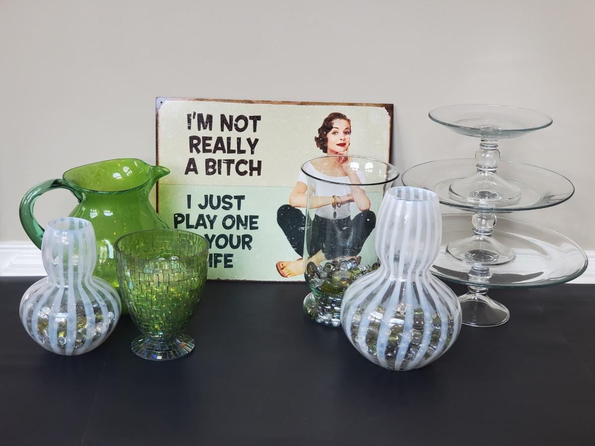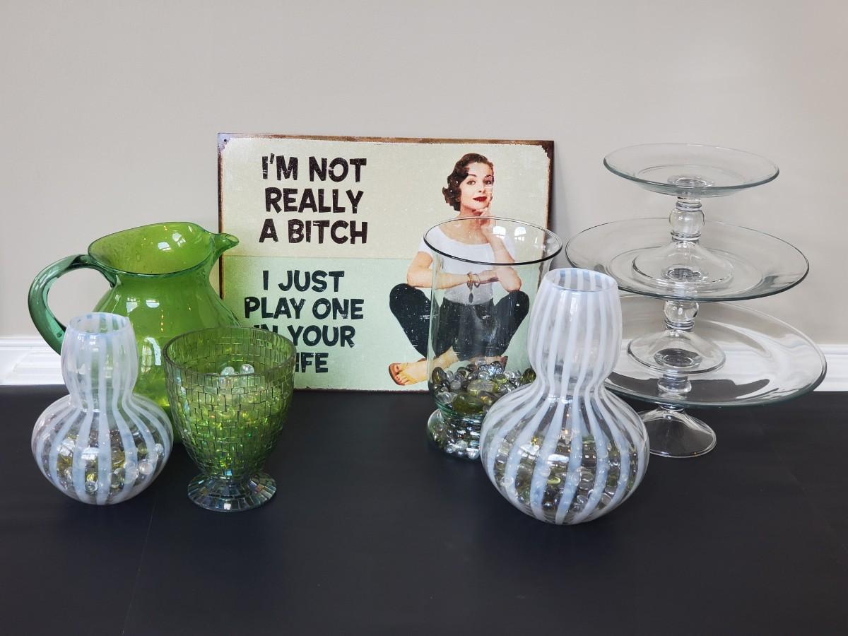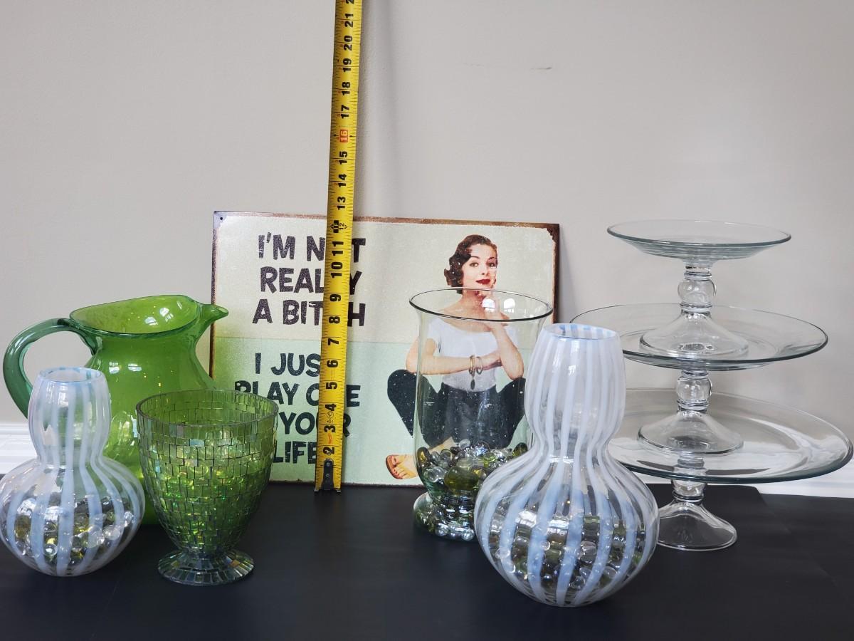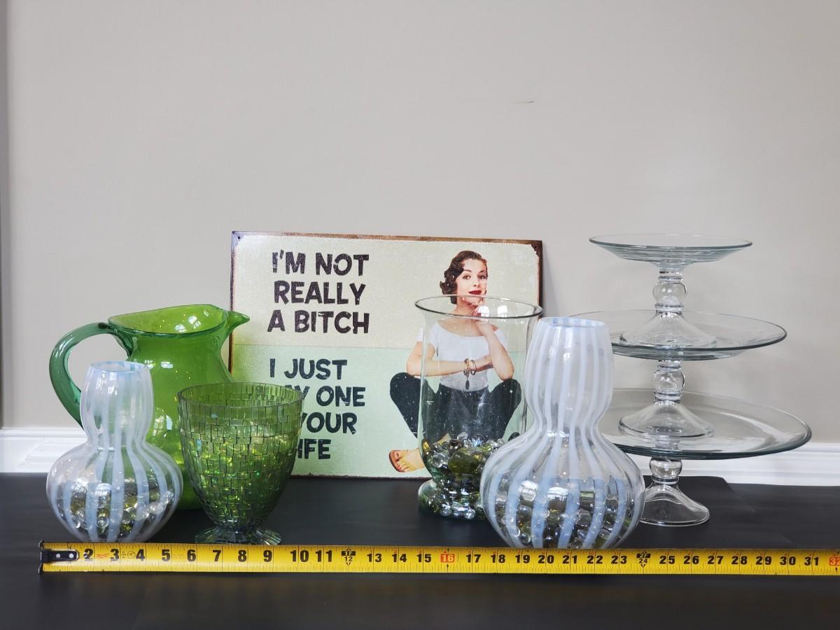 LOT 8G: Timeless Glassware: Green Pitcher, Modern Vases, Pedestal Serving Plates, Tin Sign & More