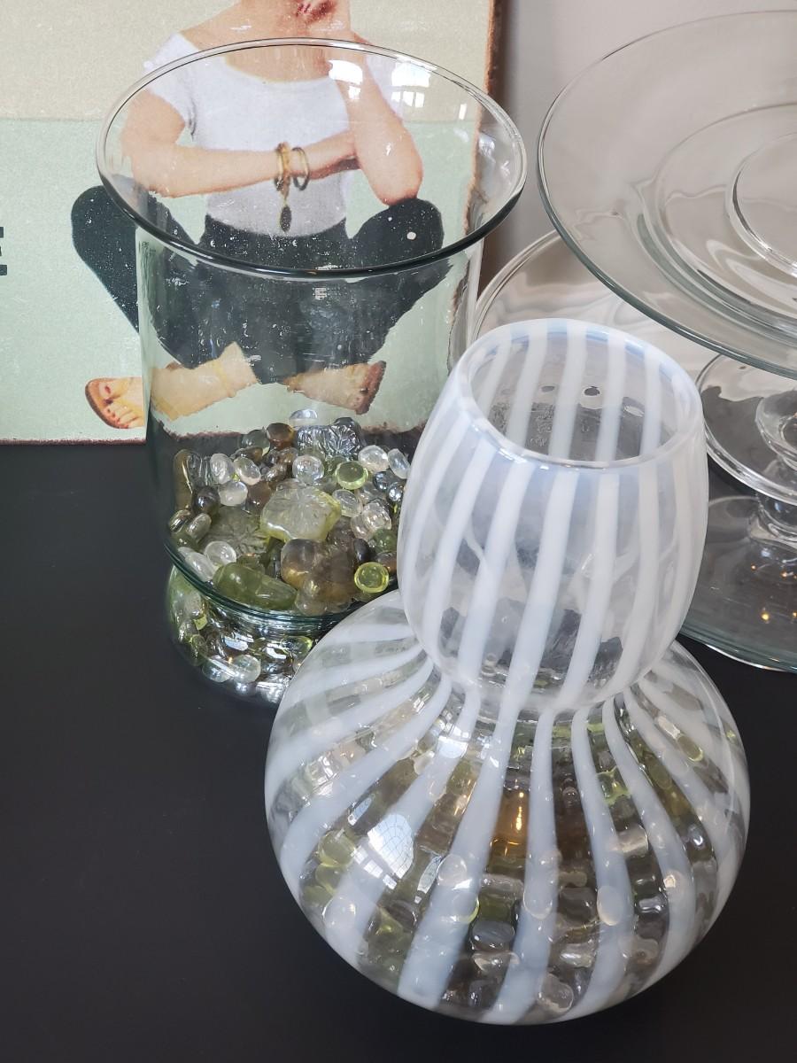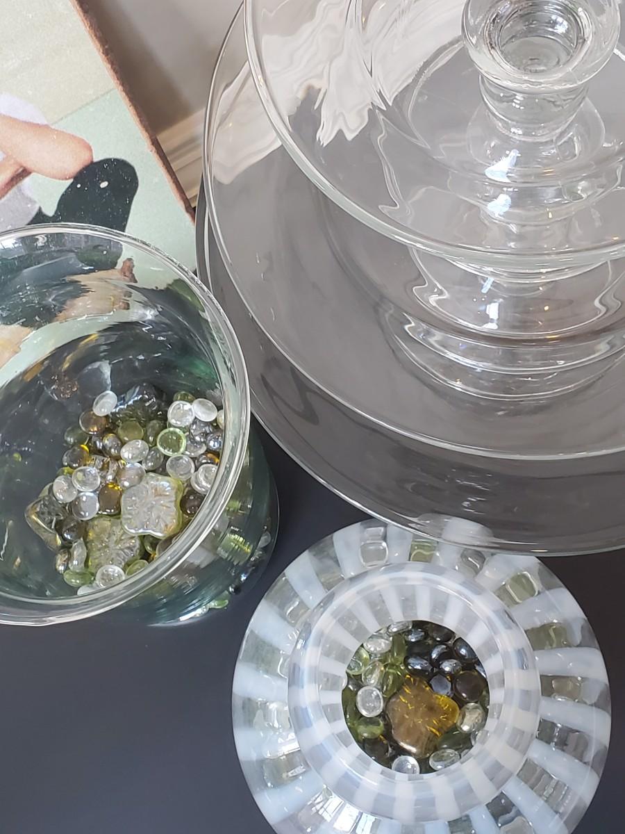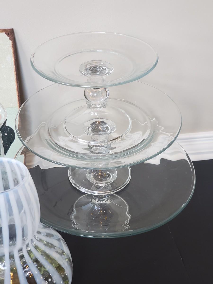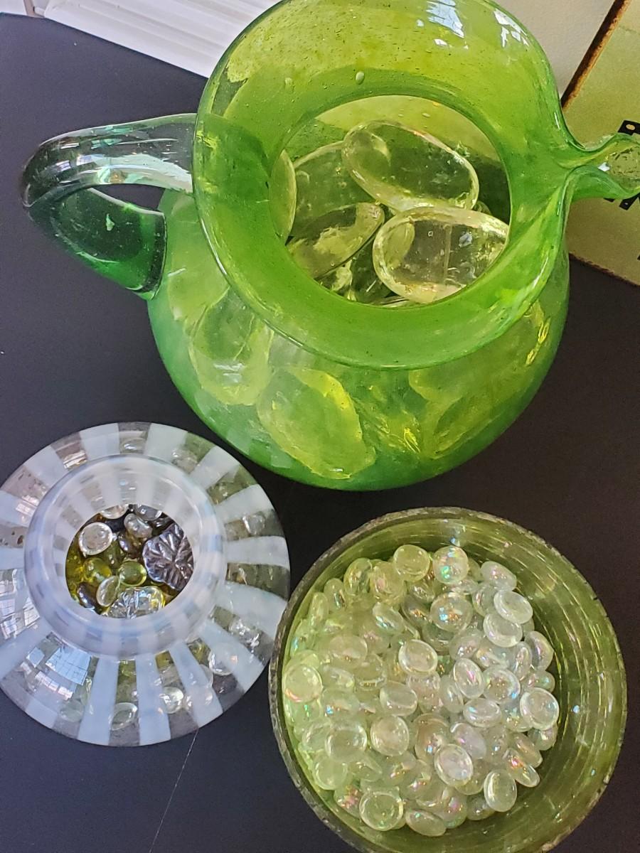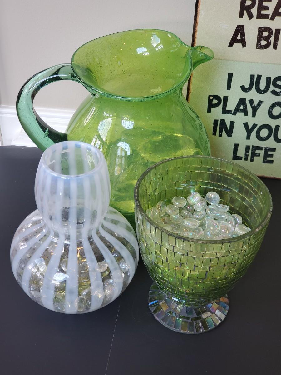 LOT 8G: Timeless Glassware: Green Pitcher, Modern Vases, Pedestal Serving Plates, Tin Sign & More