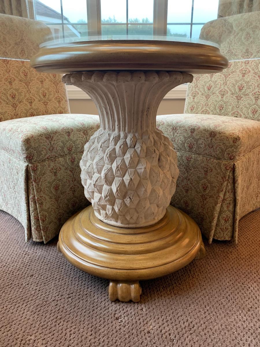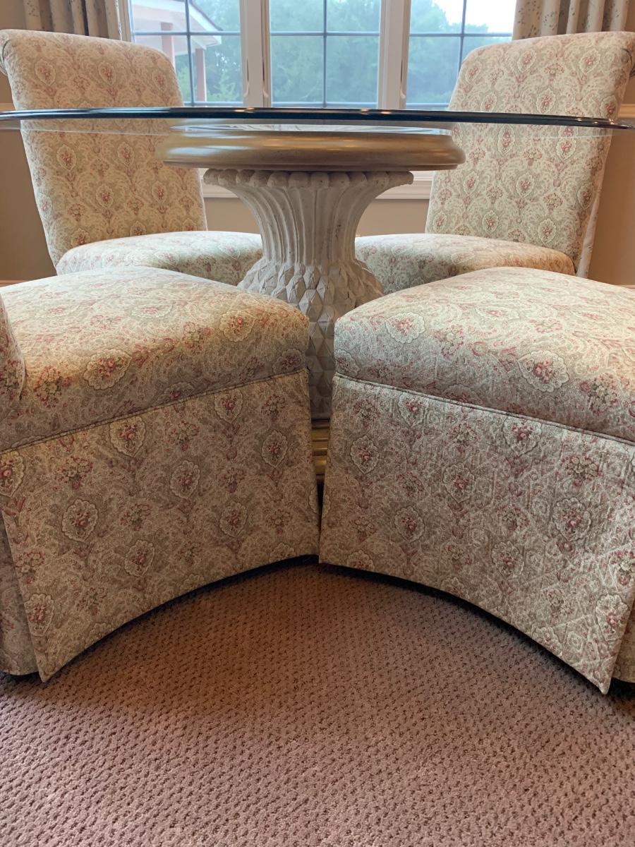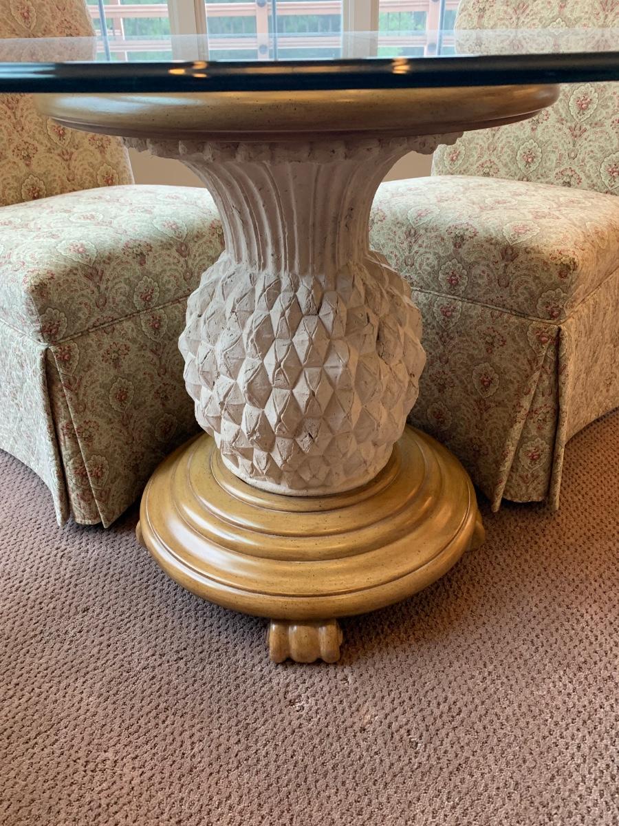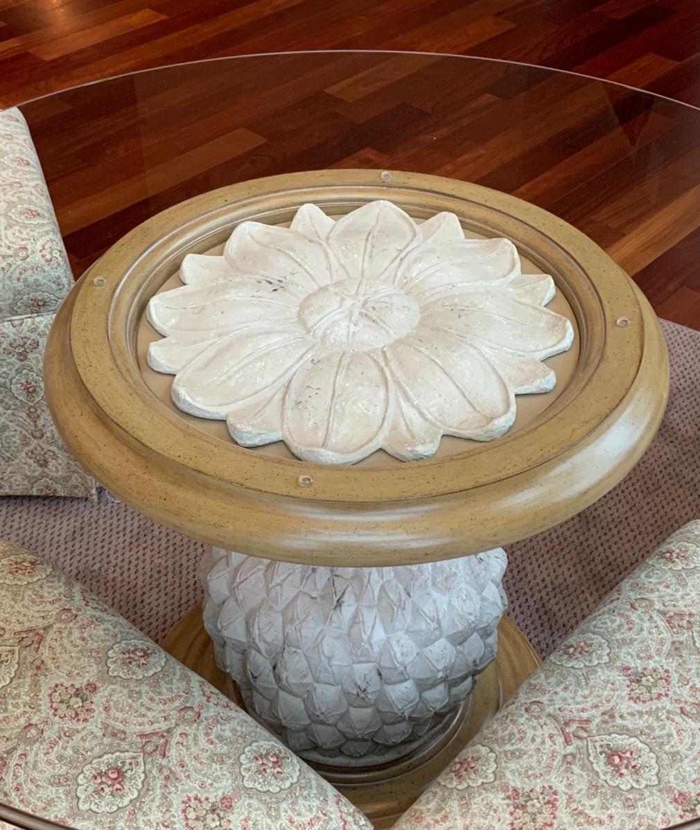 LOT 25R: Glass Top Dinning Table: Stone & Wood Base w/ a Floral Accent Center & Upholstered Chairs