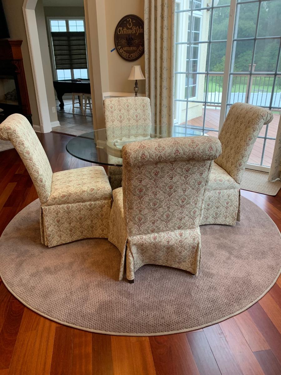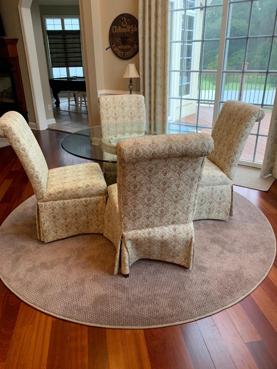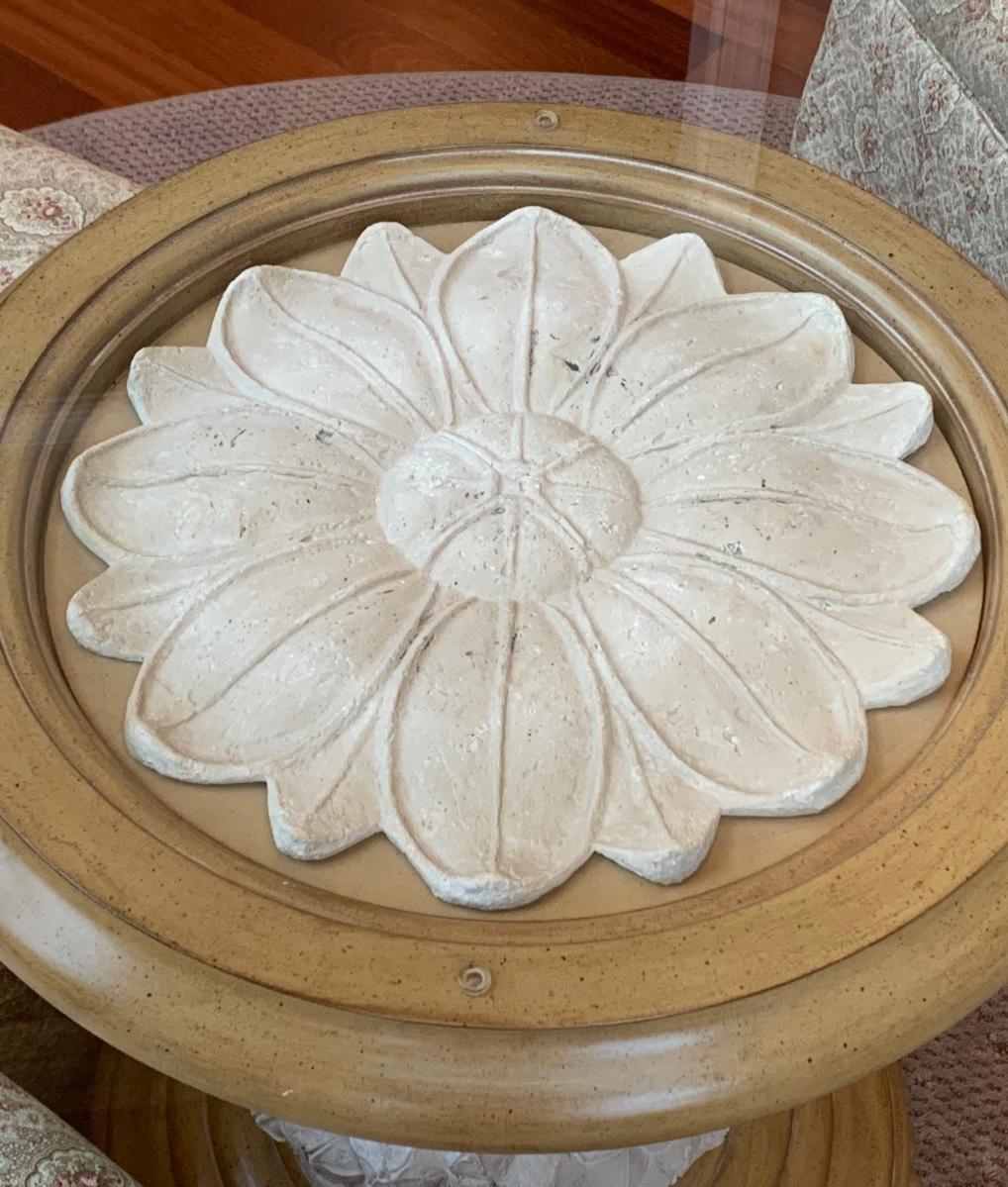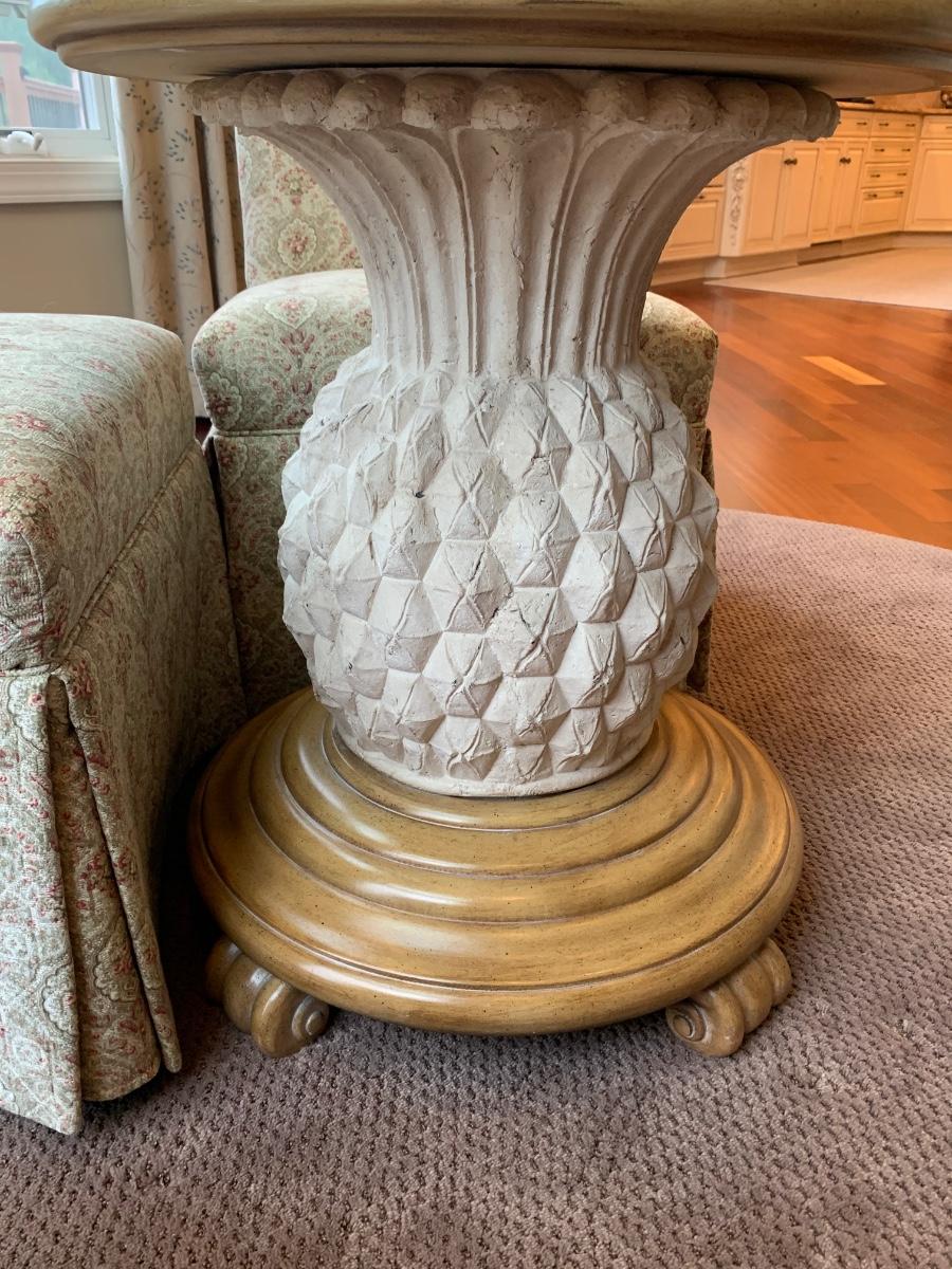 LOT 25R: Glass Top Dinning Table: Stone & Wood Base w/ a Floral Accent Center & Upholstered Chairs