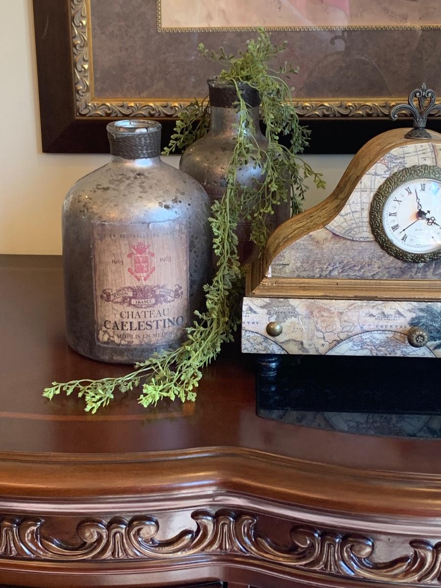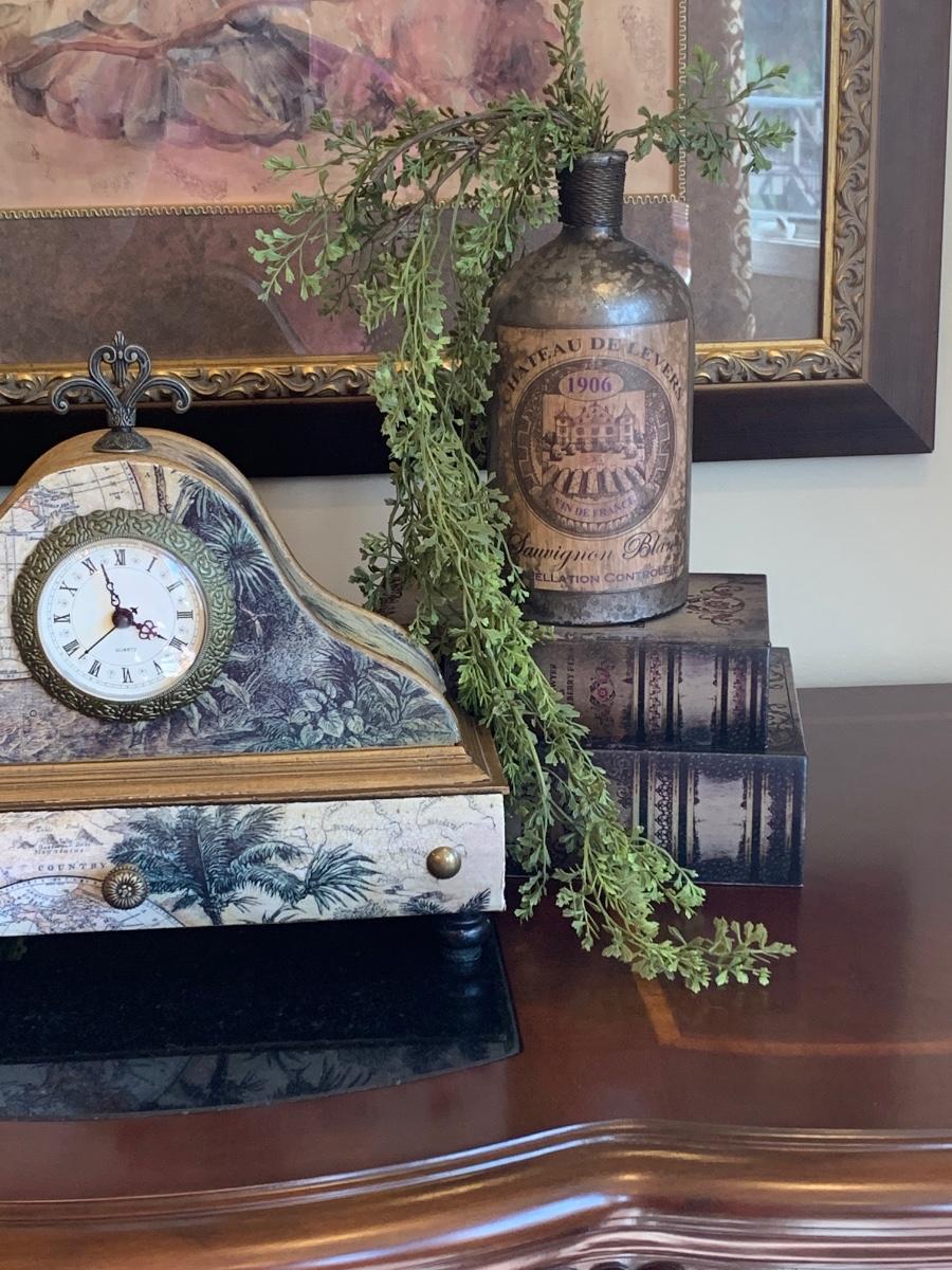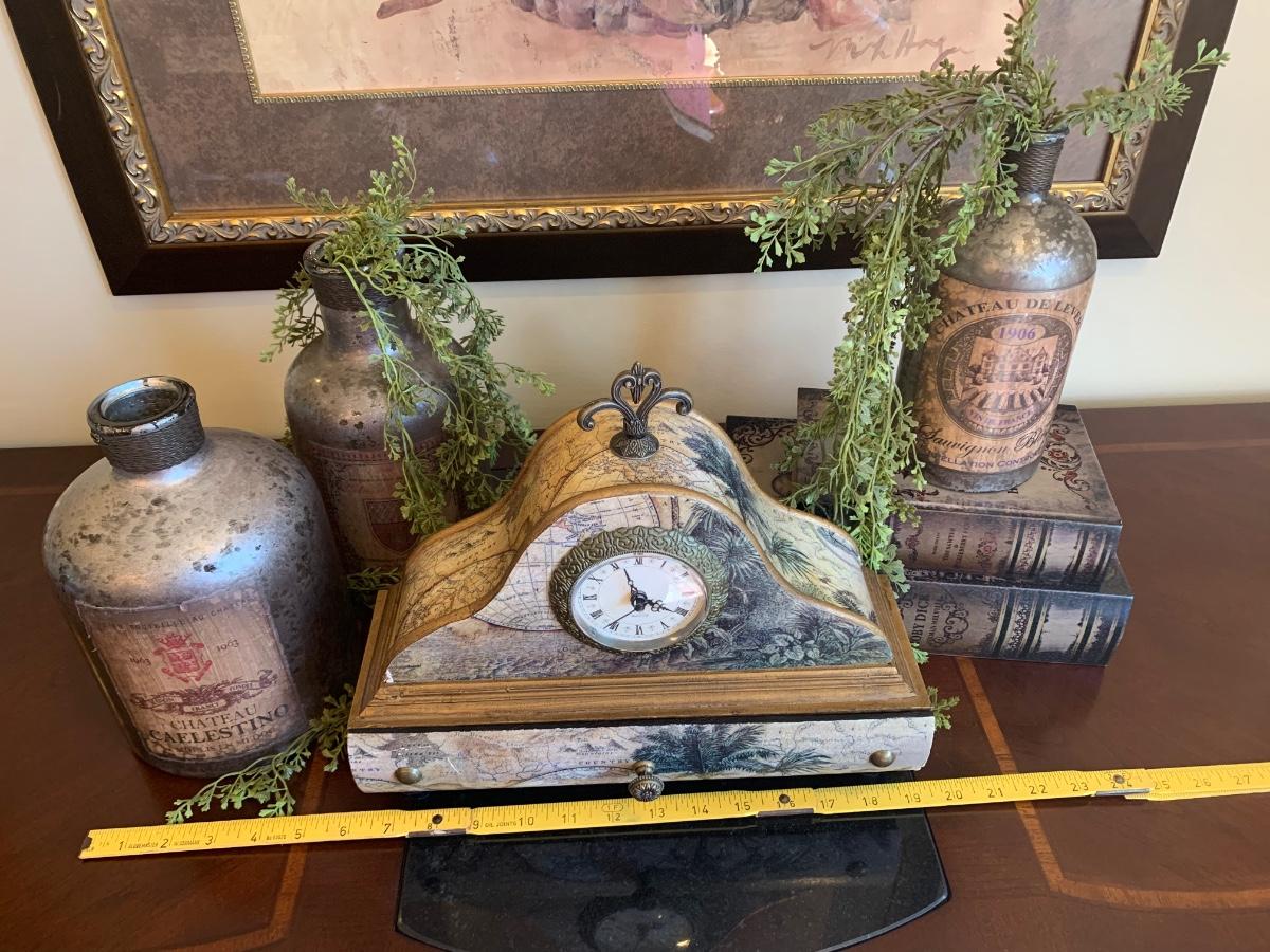 LOT 33R: Old World Home Decor: Wine Bottles, Faux Books, Clock & More