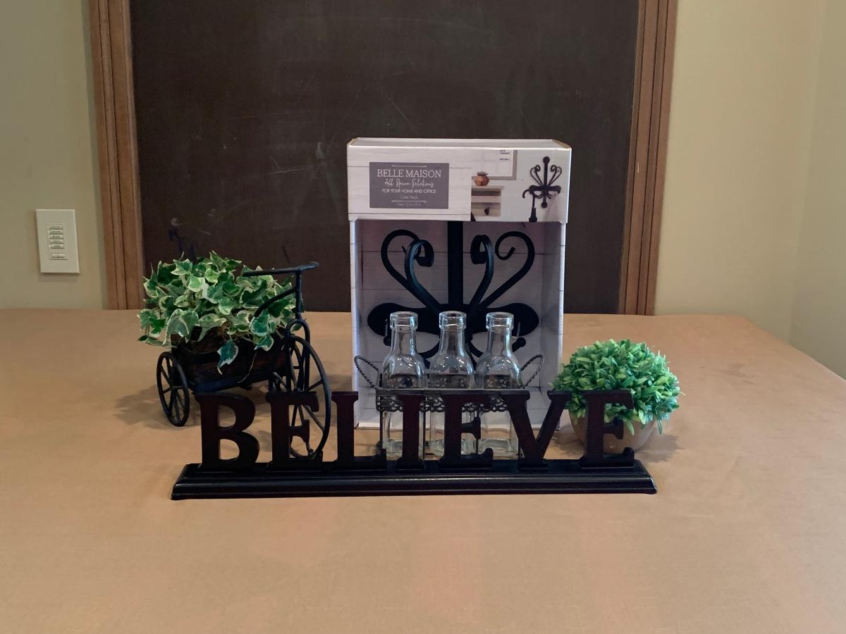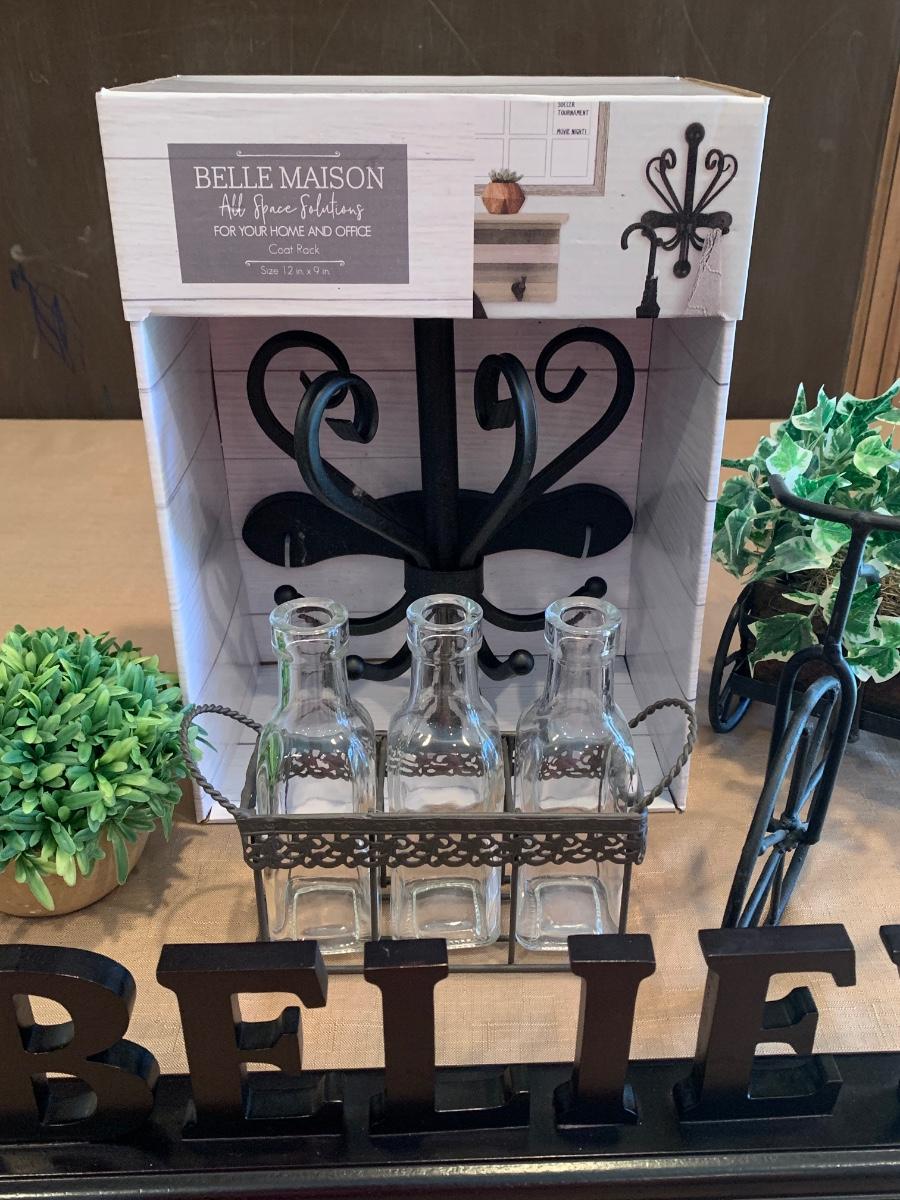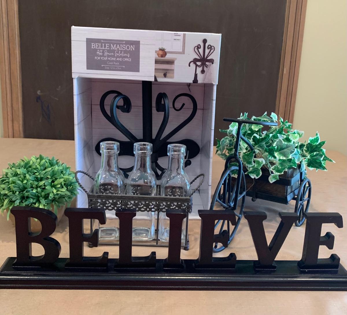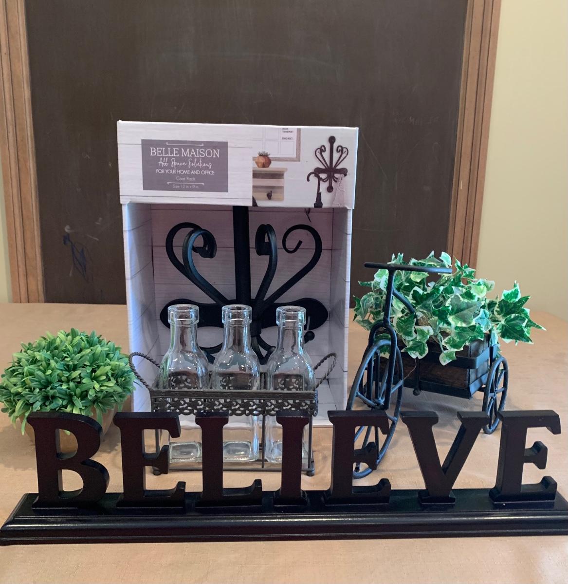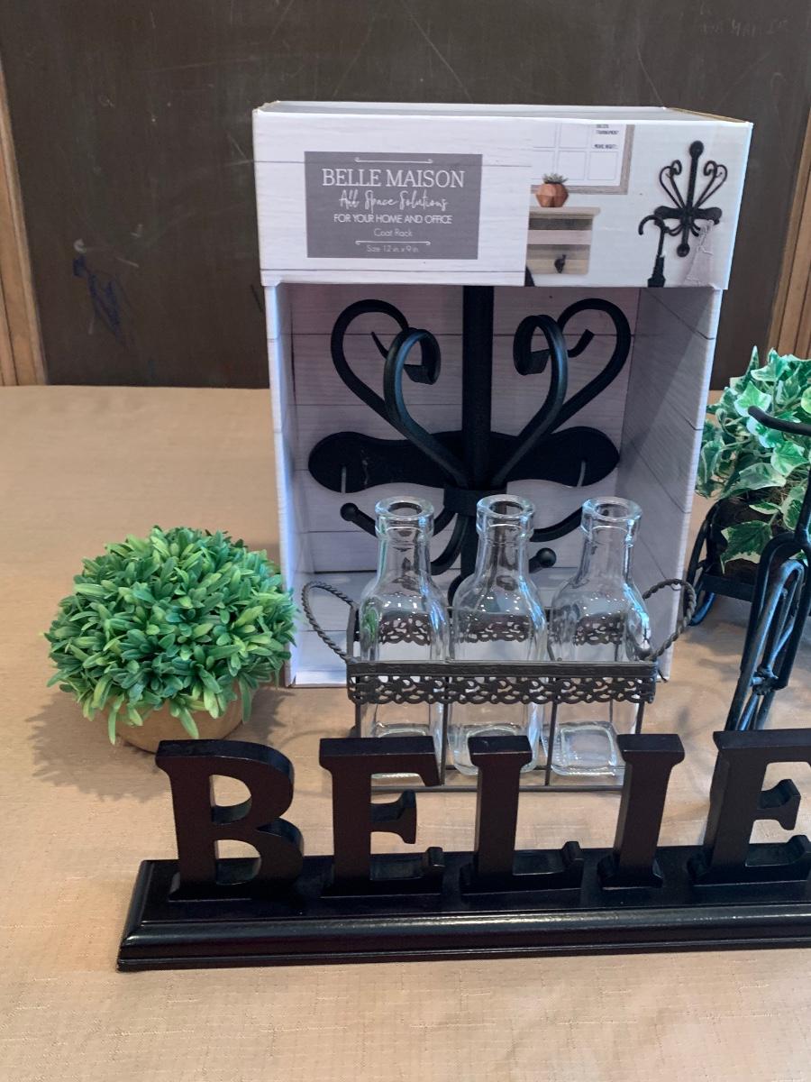 LOT 47R: "Believe" Home Decor: Belle Madison Hanging Coat Rack, Faux Plants, Bottle Vases w/Metal Tray