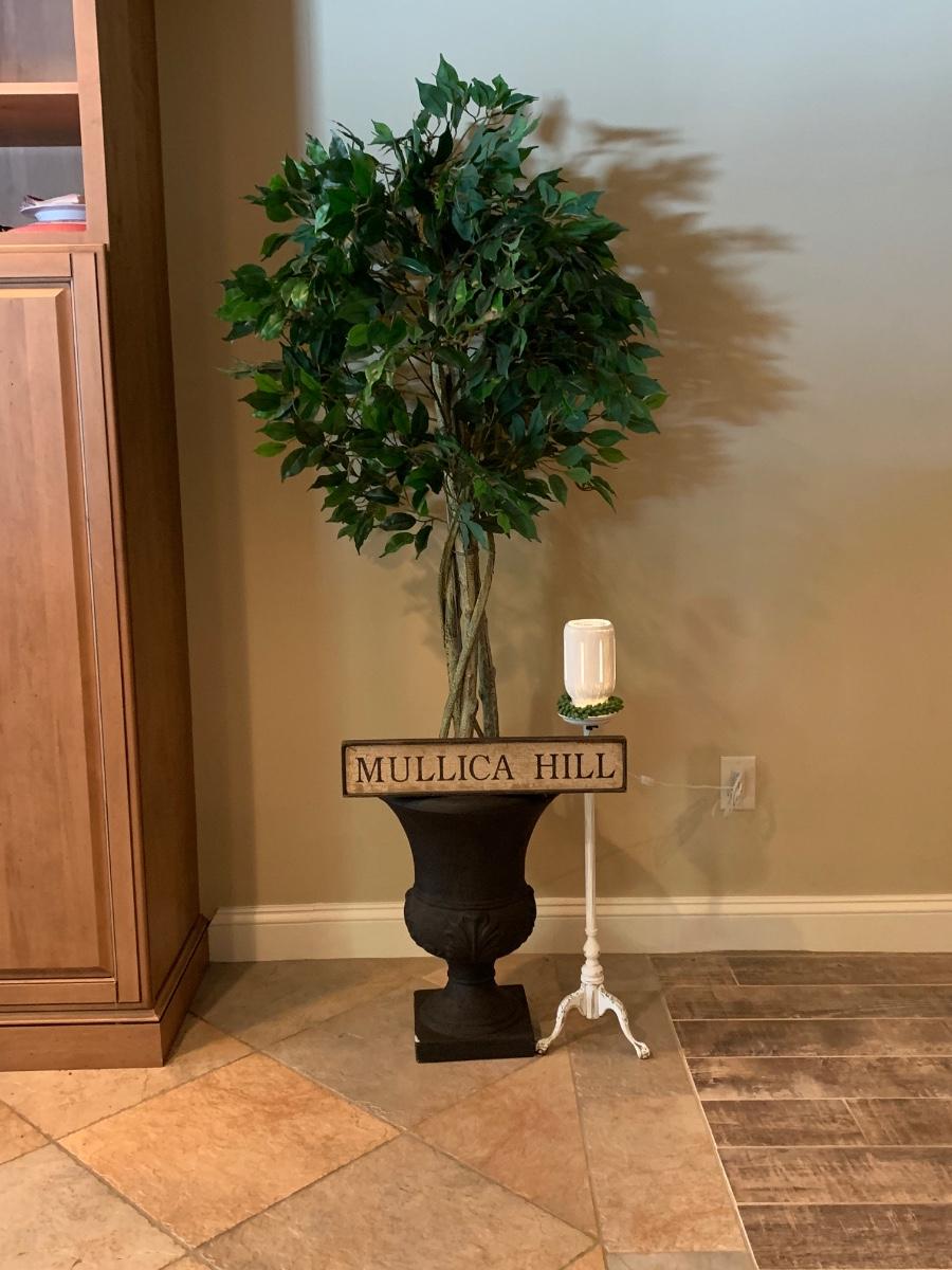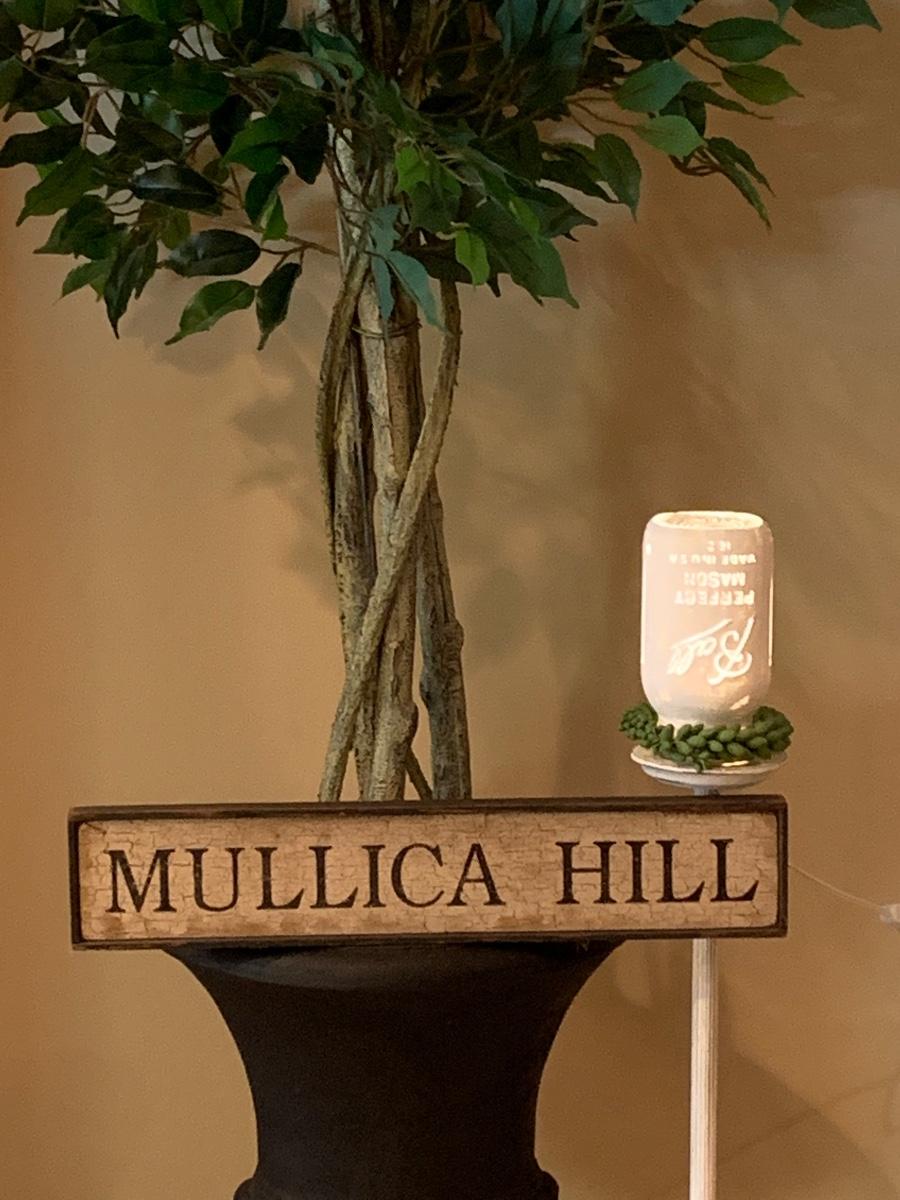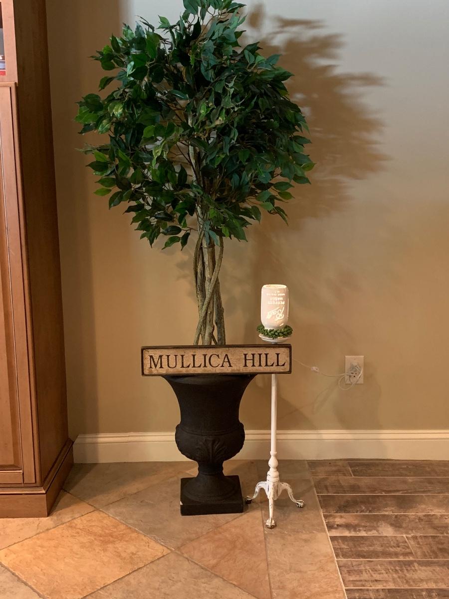 LOT 49R: Faux Tree, Mason Jar Accent Light & Wooden Mullica Hill Sign