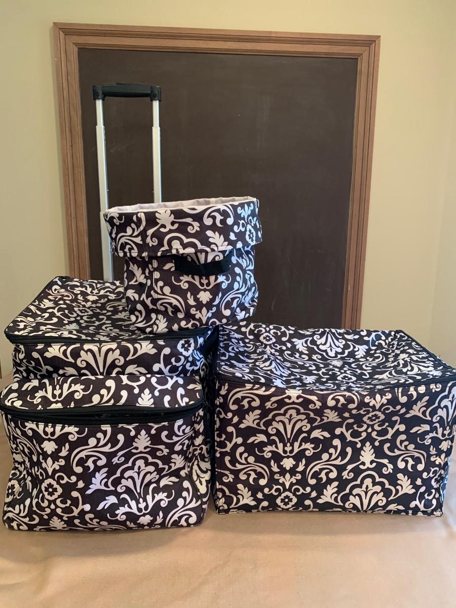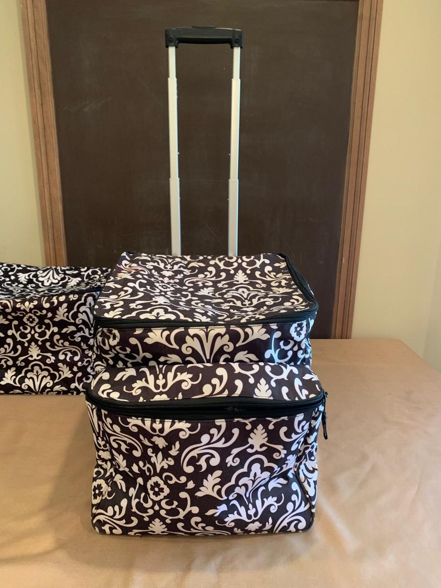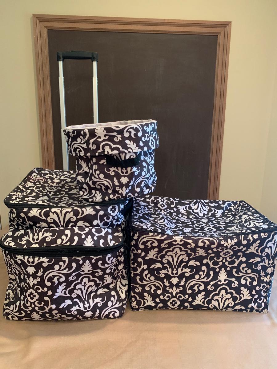 LOT 52R: Thirty One Rolling Cooler, Thirty One Round Storage Bin, Thirty One Square Thermal Tote