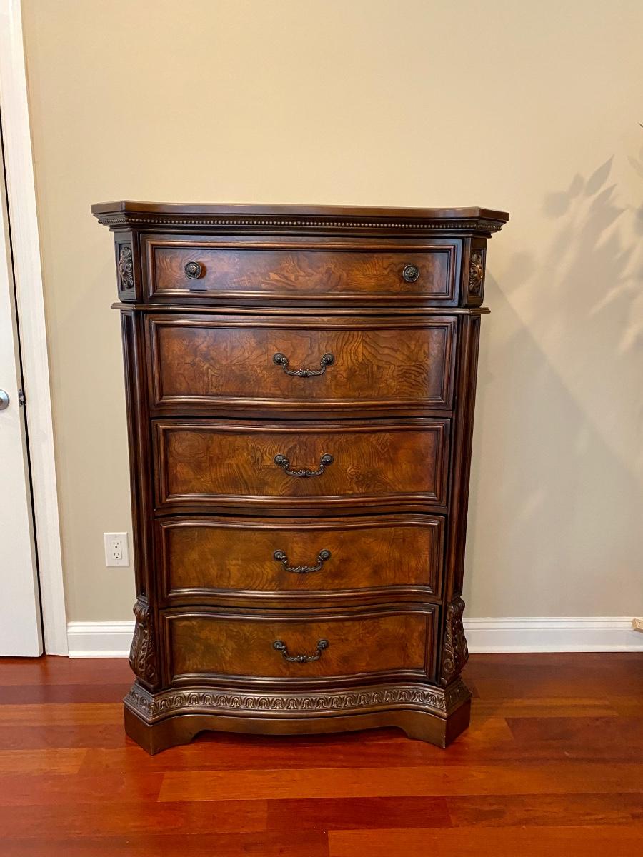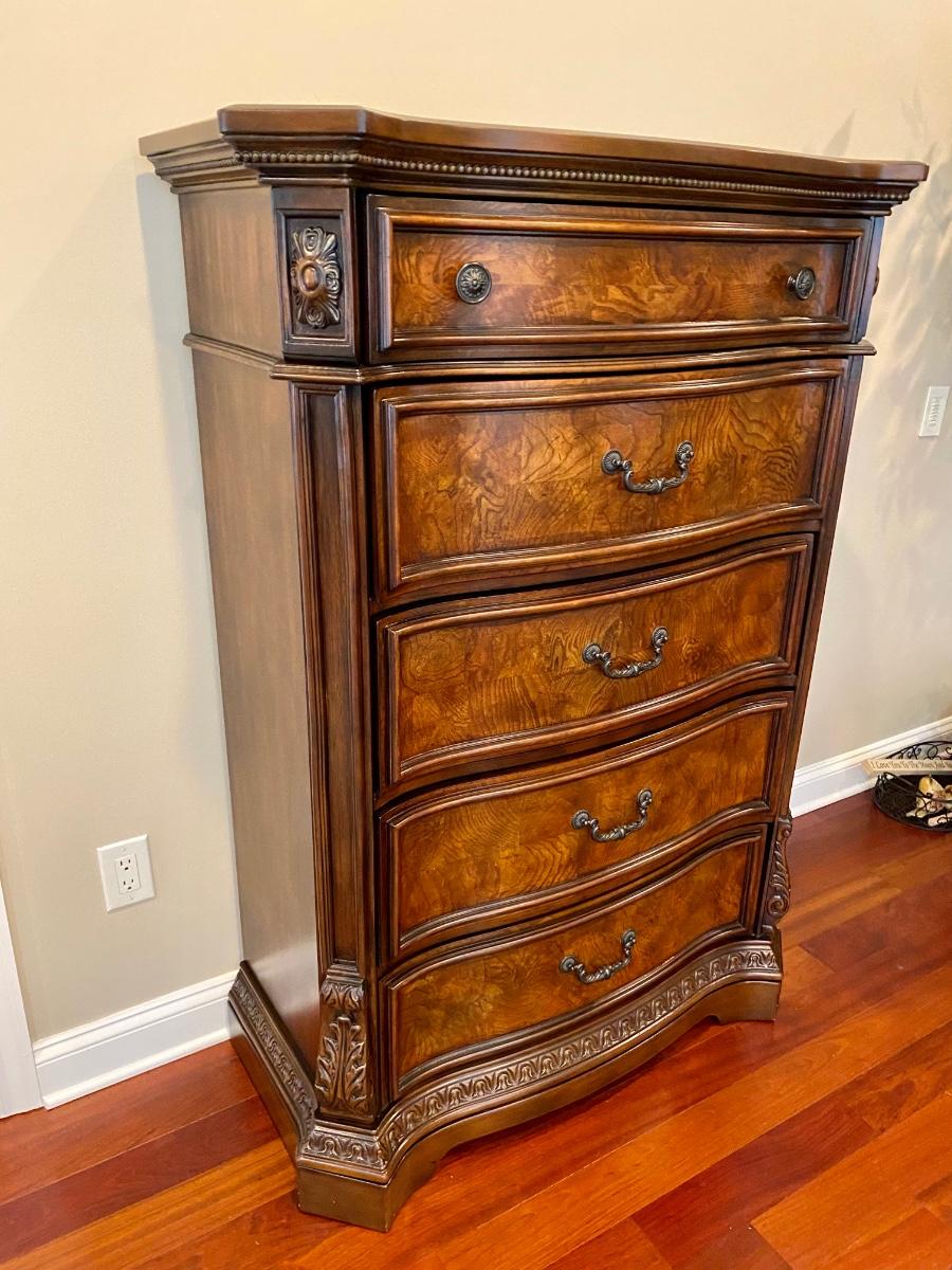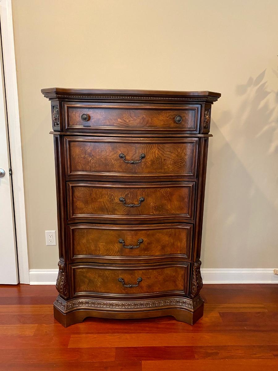 Millennium by Ashley Dresser. Wood tall dresser w intricate details and five drawers. Please see all pictures as they are the best representation of the items. The pictures show condition, measurements if taken, and what is included in the lot. Due to the large amount that we photograph and the time frame, we are not always able to take measurements. All items unless noted, are pre-owned and have been used. If you purchased furniture, you must bring help. We do not allow one person to carry large furniture out on their own. Bring help, tools and a truck for the safety of our client’s homes, and your personal safety. Any damages that result to the property including walls, and floors due to moving of the furniture will be charged to the buyer. Company policy. Thank you.