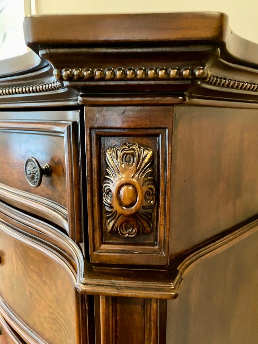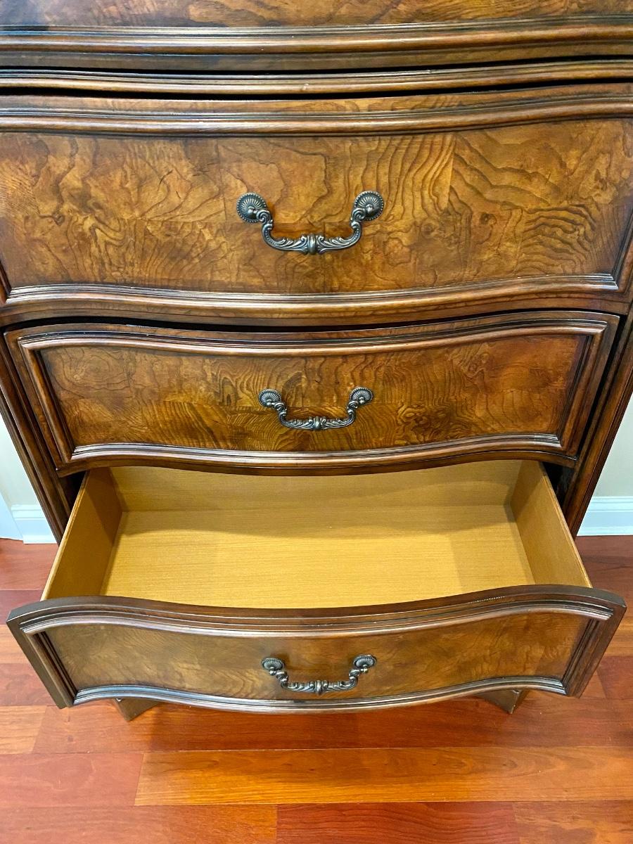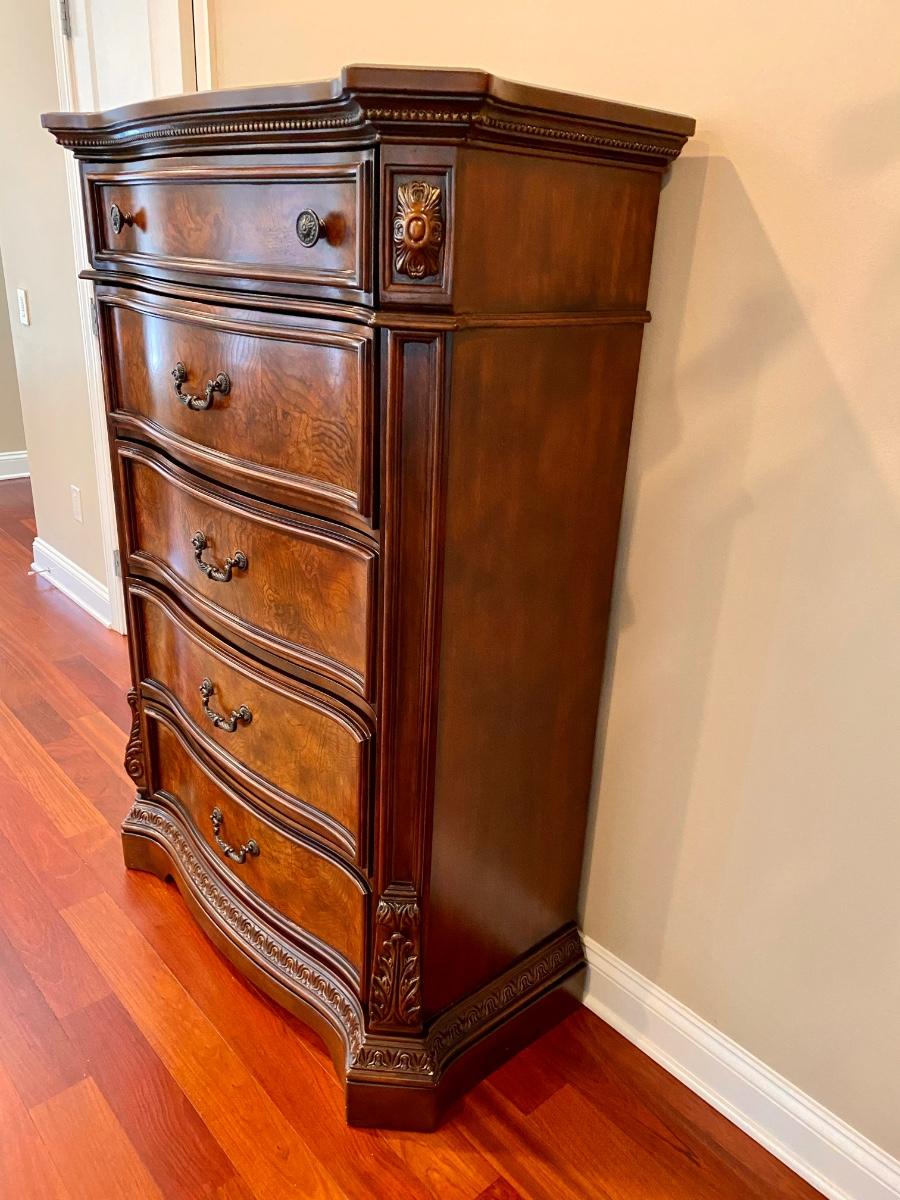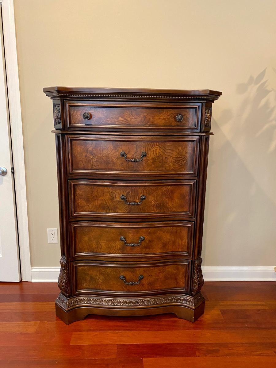 Millennium by Ashley Dresser. Wood tall dresser w intricate details and five drawers. Please see all pictures as they are the best representation of the items. The pictures show condition, measurements if taken, and what is included in the lot. Due to the large amount that we photograph and the time frame, we are not always able to take measurements. All items unless noted, are pre-owned and have been used. If you purchased furniture, you must bring help. We do not allow one person to carry large furniture out on their own. Bring help, tools and a truck for the safety of our client’s homes, and your personal safety. Any damages that result to the property including walls, and floors due to moving of the furniture will be charged to the buyer. Company policy. Thank you.