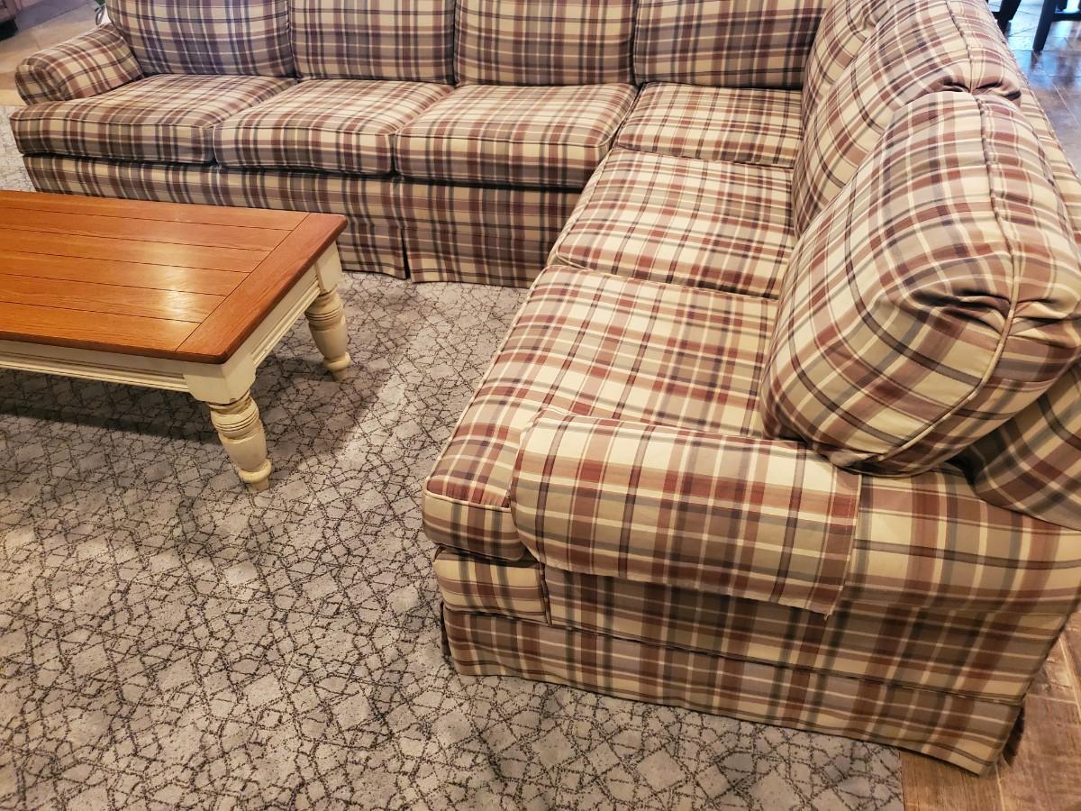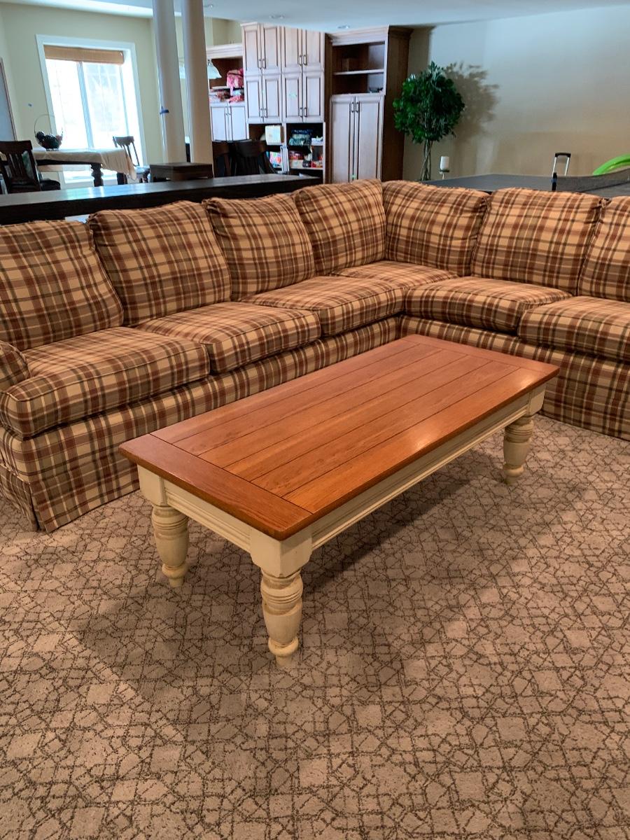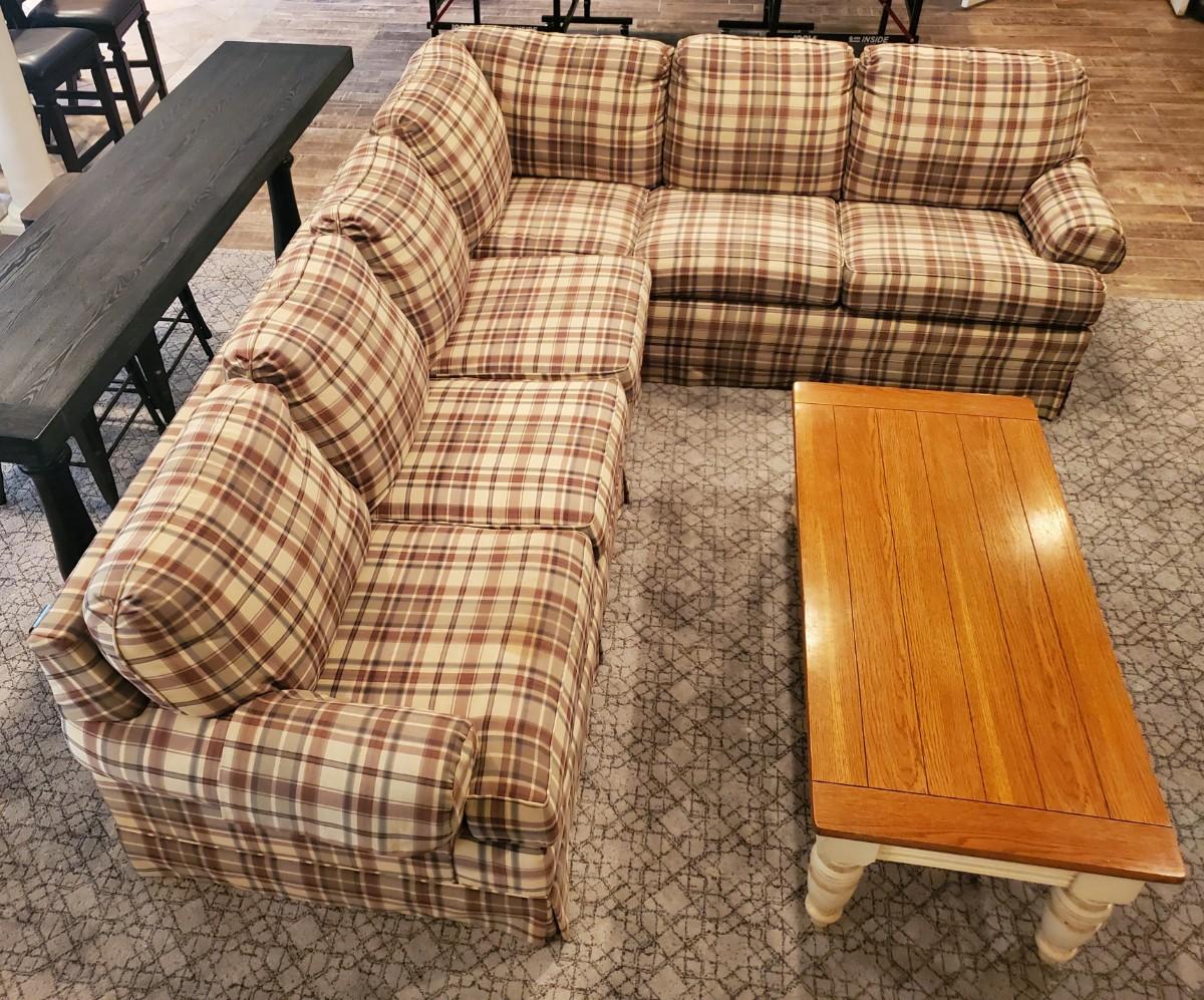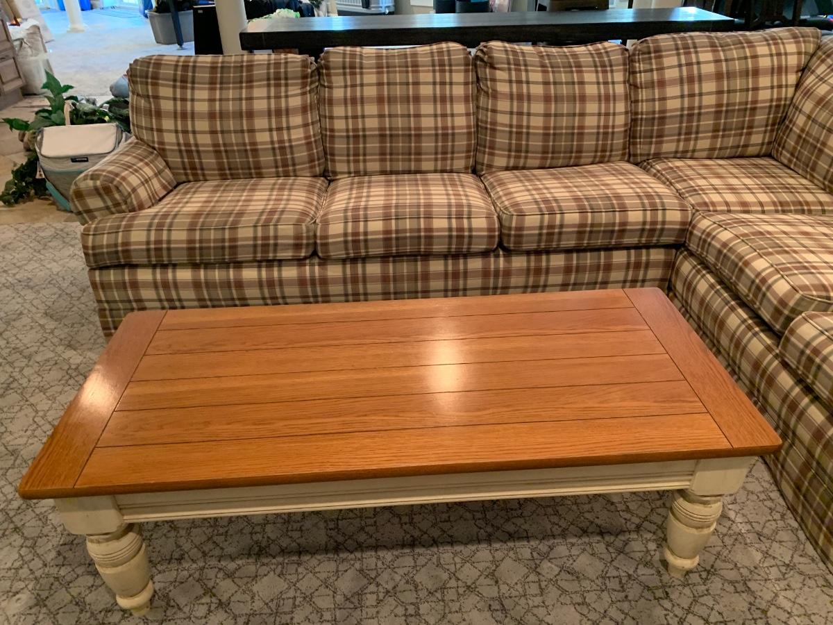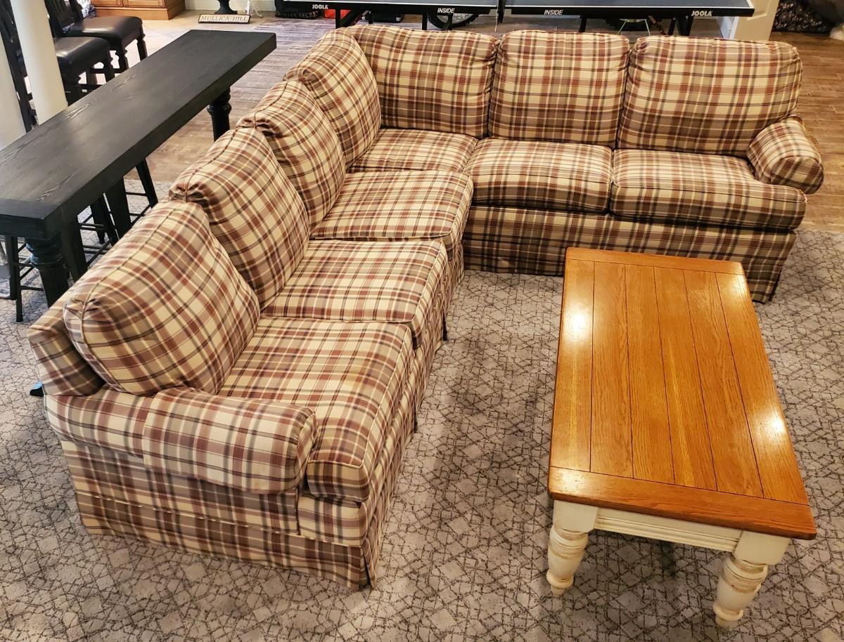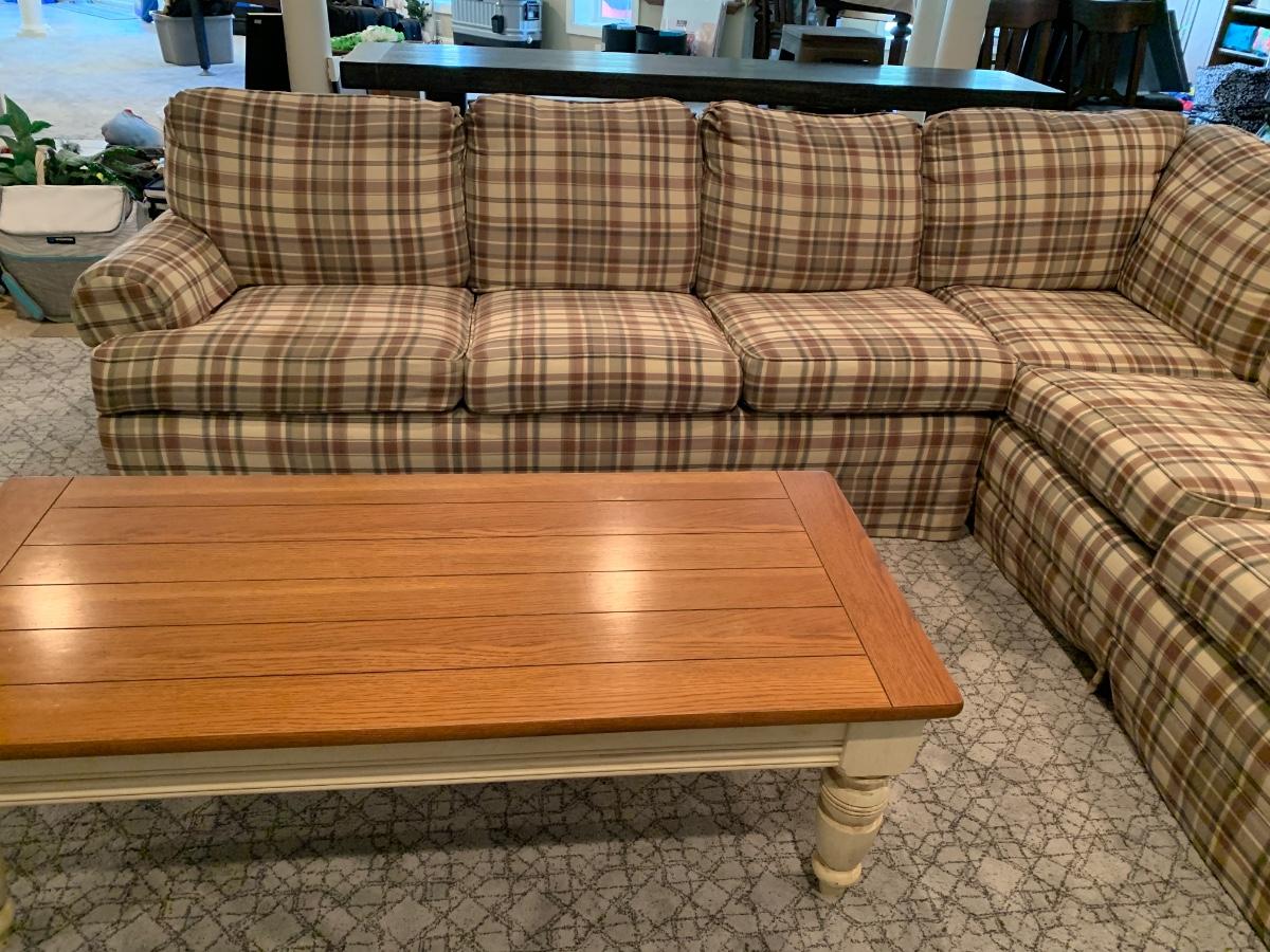 LOT 110G: Plaid Section Couch & Farm House Coffee Table - Great Family/Children's Room Piece