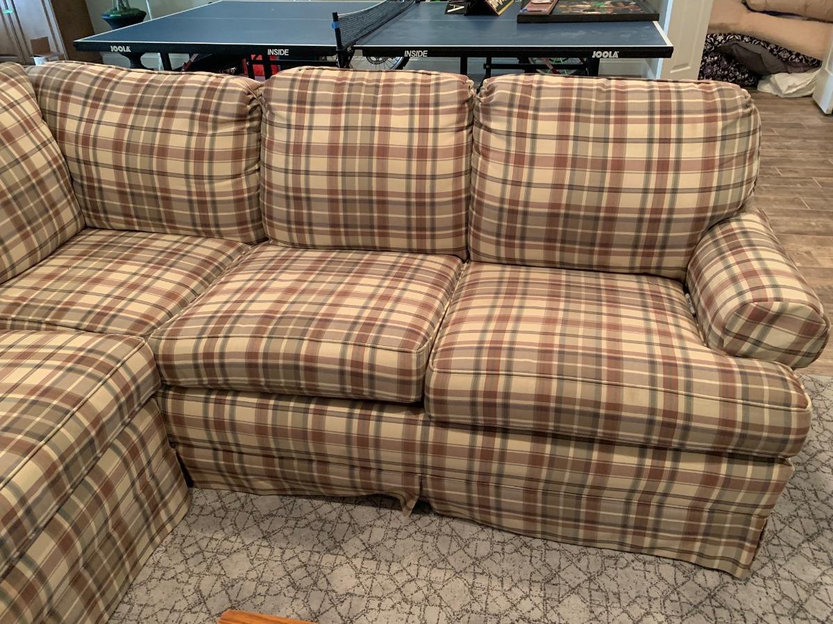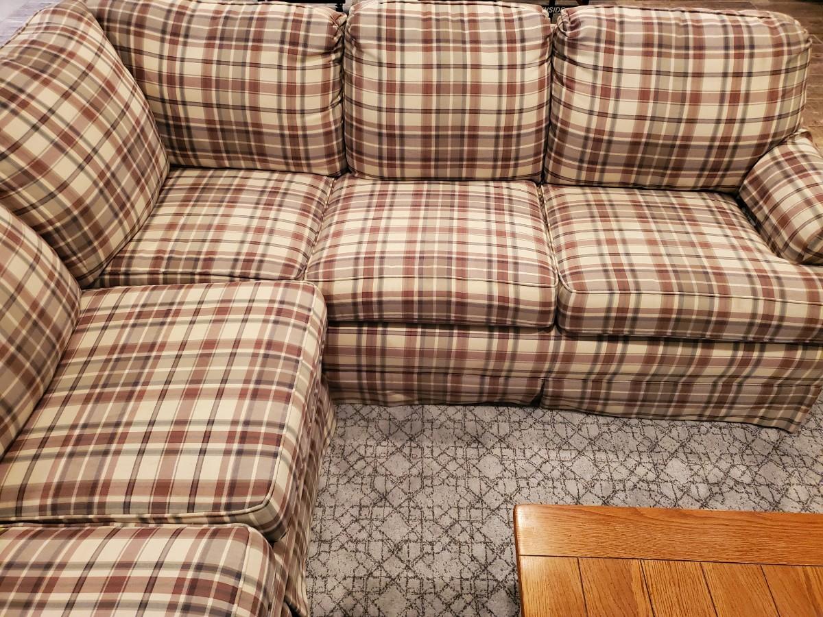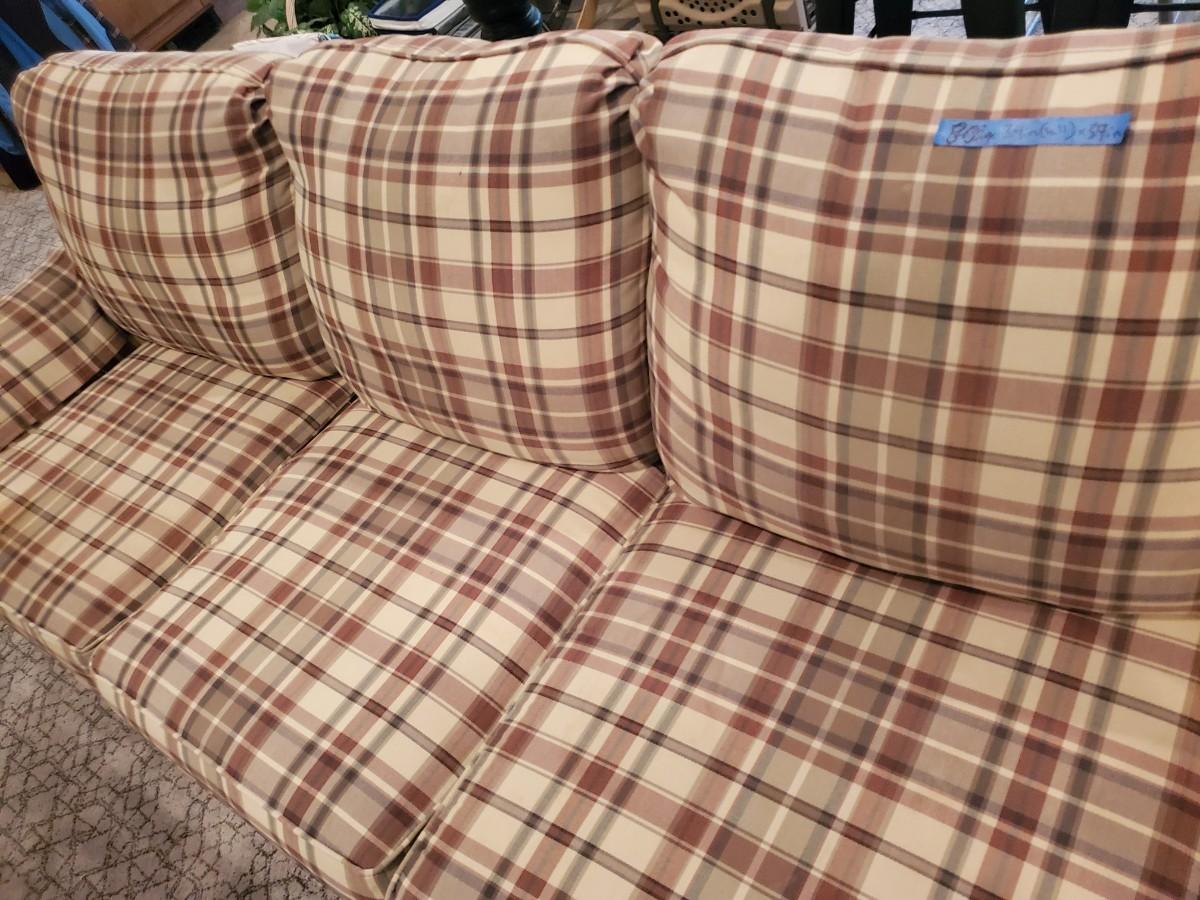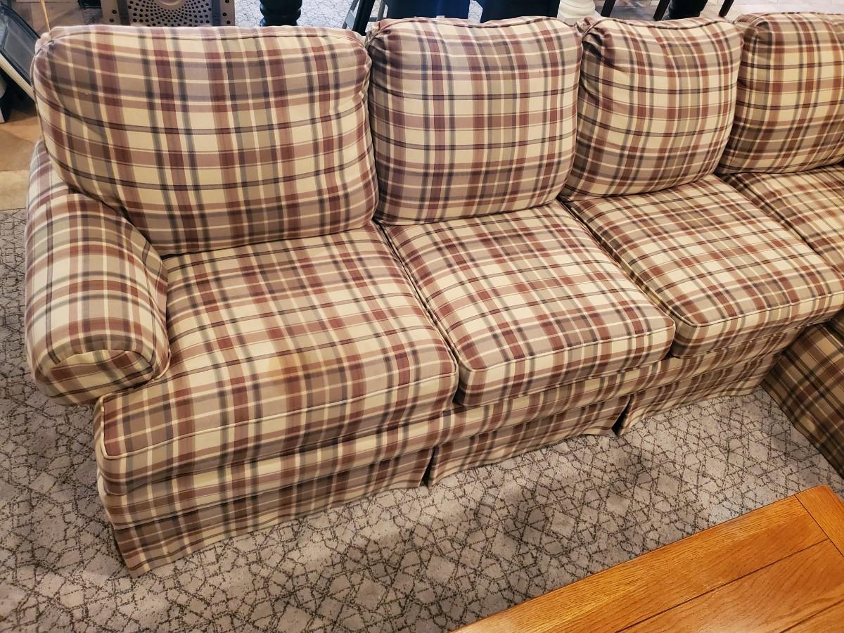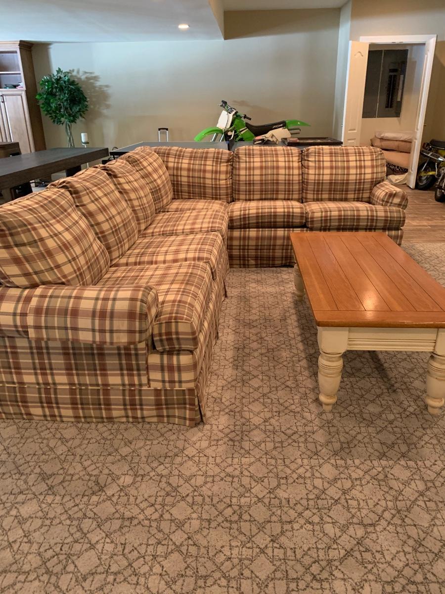 LOT 110G: Plaid Section Couch & Farm House Coffee Table - Great Family/Children's Room Piece