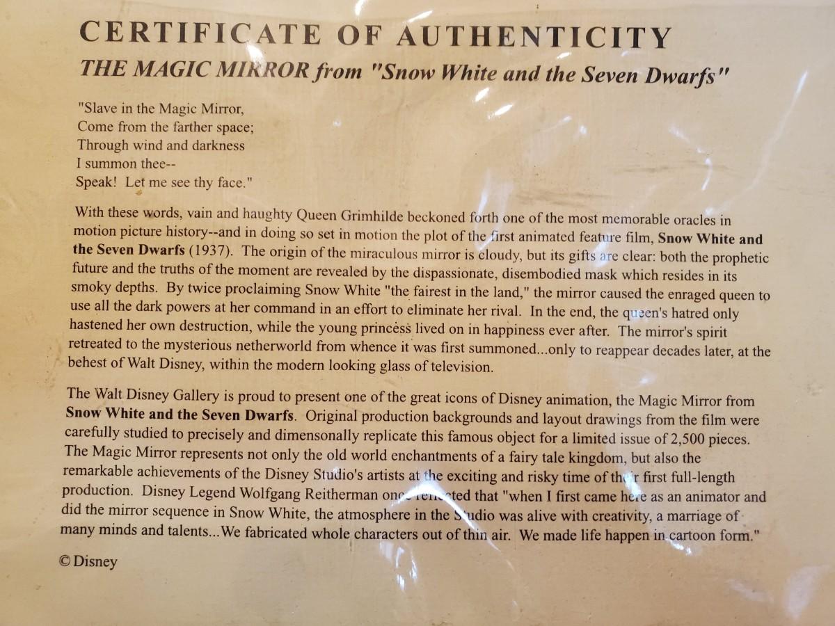 LOT 119G: Snow White Magic Mirror Authentic Prop Replica w/ Certificate