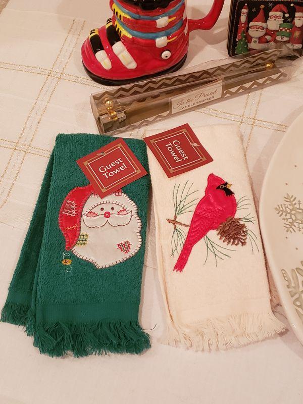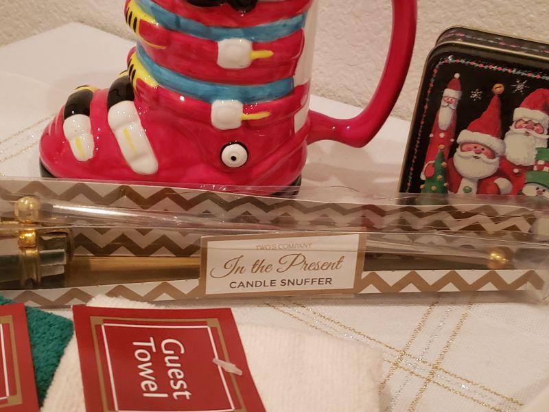 Lot 769:  New Christmas Cheer Lot (Platter, Hand Towels, Mug, Candle Snuffer & Small Tin)