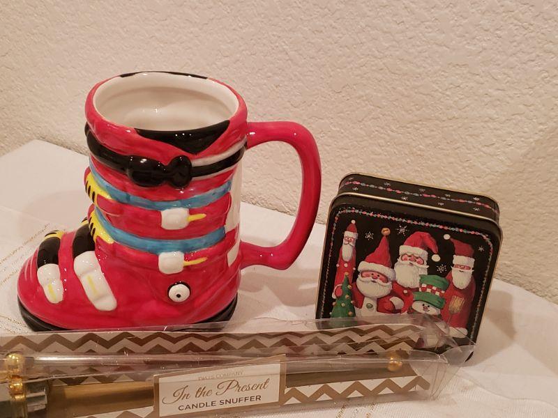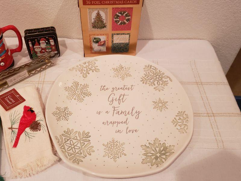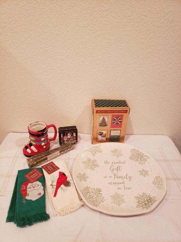 Lot 769: New Christmas Cheer Lot (Platter, Hand Towels, Mug, Candle Snuffer & Small Tin)