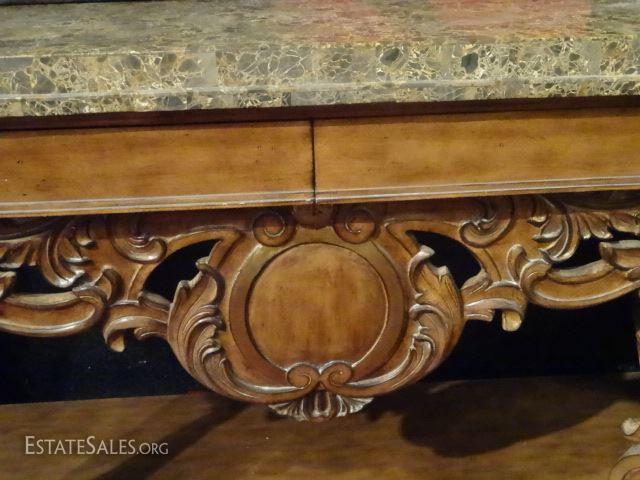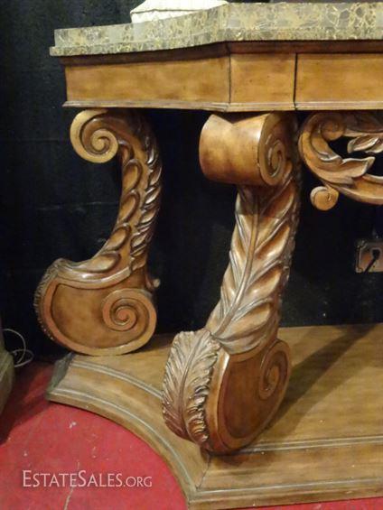 LOT 76B: LARGE FRENCH EMPIRE STYLE WOOD CONSOLE TABLE, TESSELATED MARBLE TOP, FOLIATE FORM LEGS, VERY GOOD GENTLY USED CONDITION, APPROX 86"W X 39"H X 26"D, SKU143