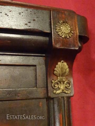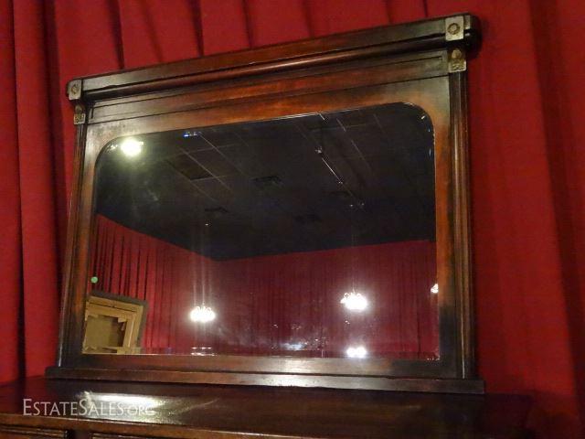 LOT 76D: LARGE ANTIQUE WOOD FRAME MIRROR, GILT METAL MOUNTS, (CABINET IN 2 PHOTOS IS SHOWN ONLY FOR SCALE), 54"W X 40"H, SKU940.06
