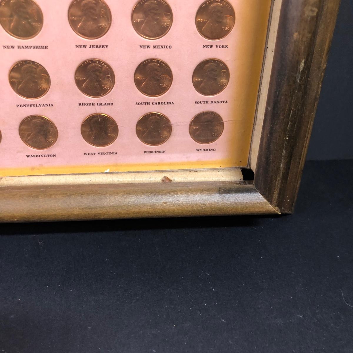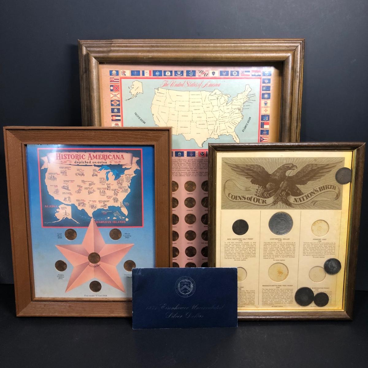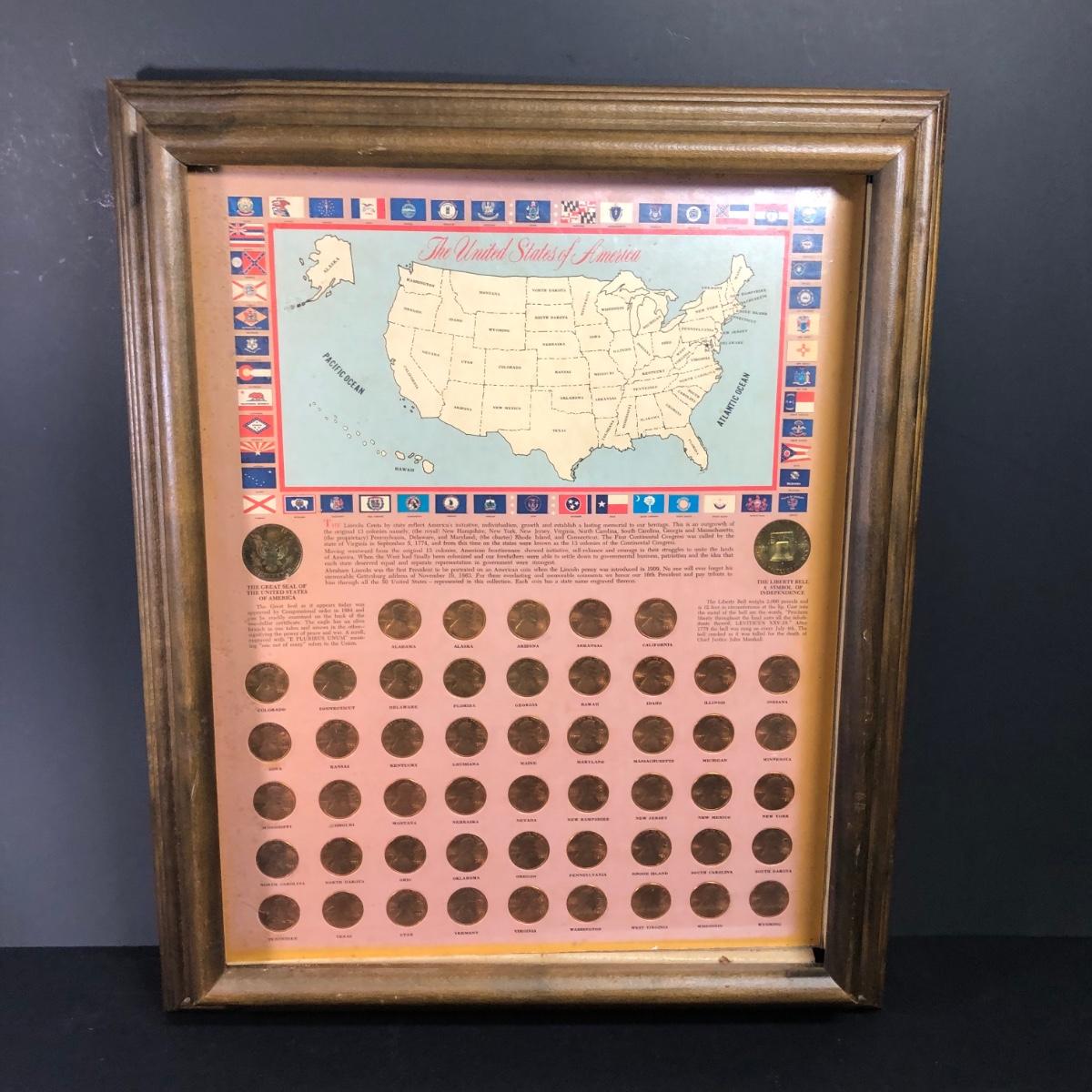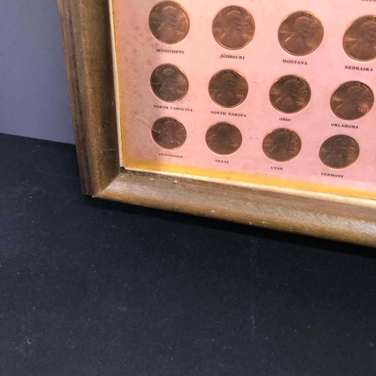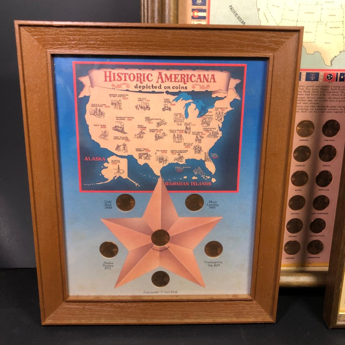 LOT 76M: Coin Collection - Framed State Pennies, Eisenhower Half Dollar, Framed Historic Americana Penny Collection,
