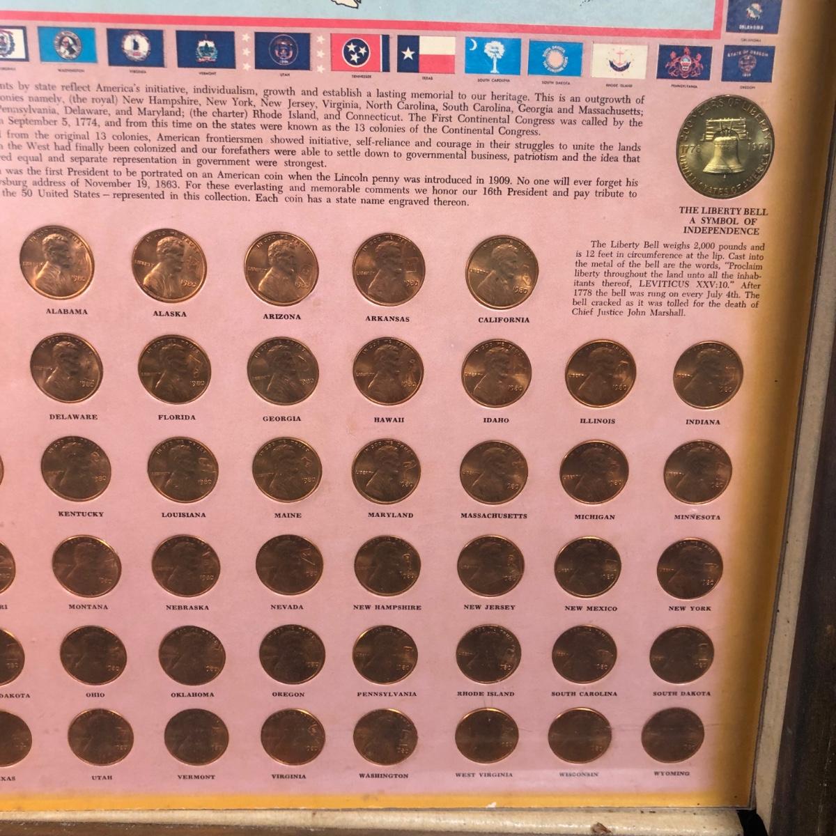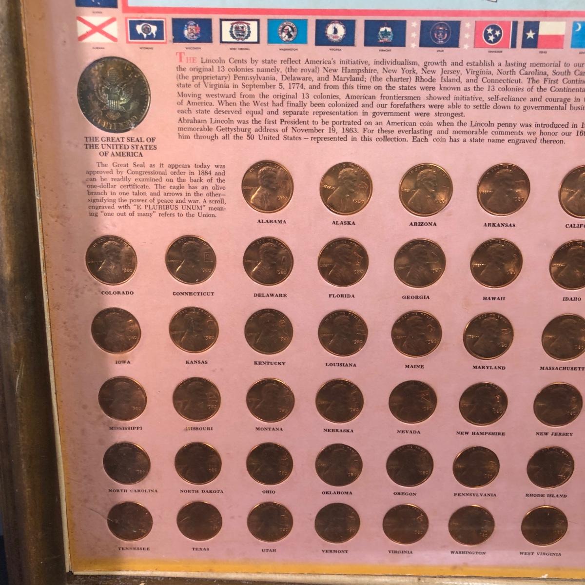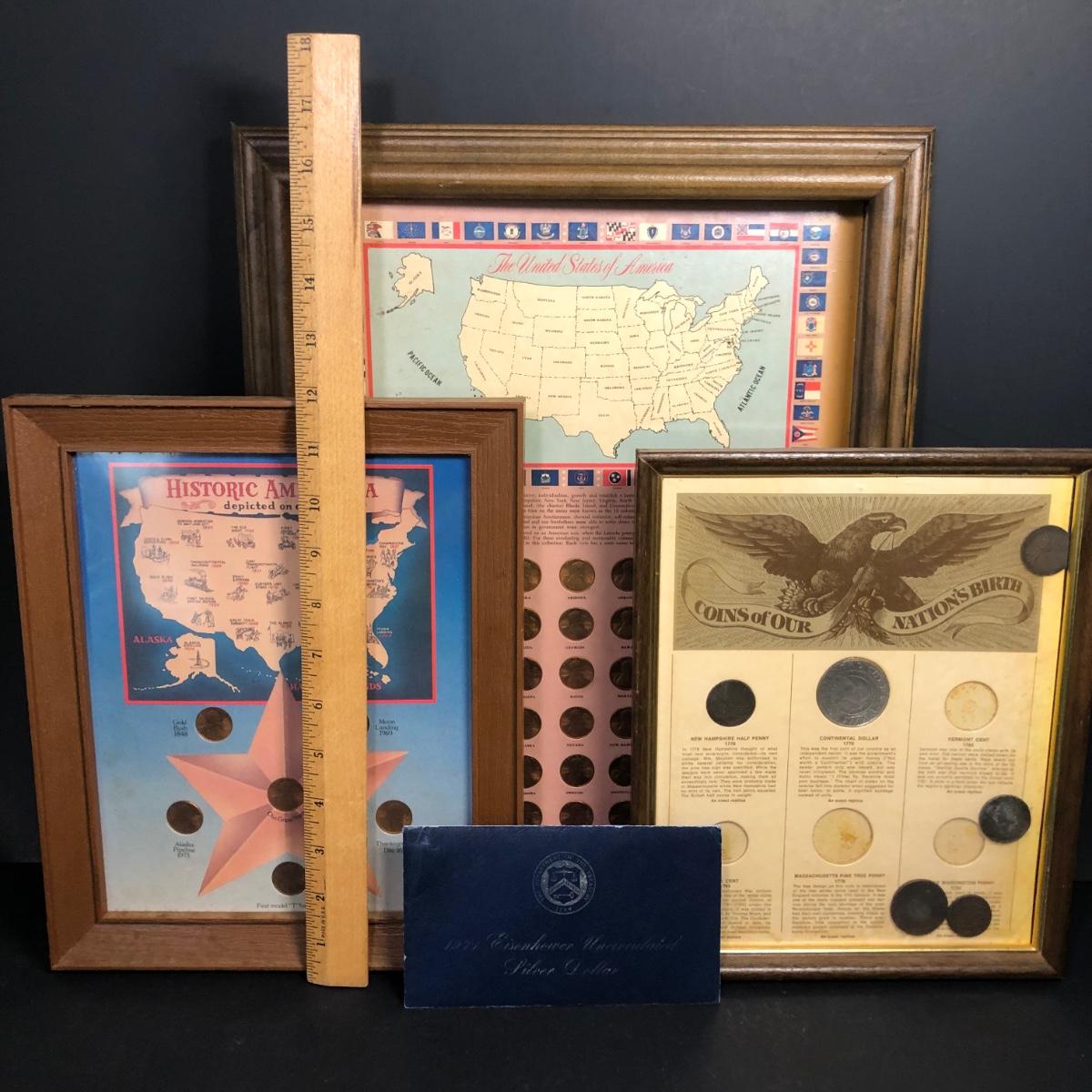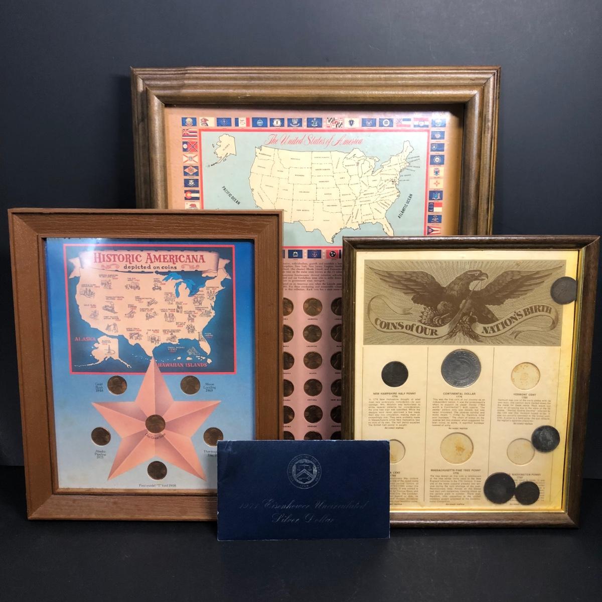 LOT 76M: Coin Collection - Framed State Pennies, Eisenhower Half Dollar, Framed Historic Americana Penny Collection,