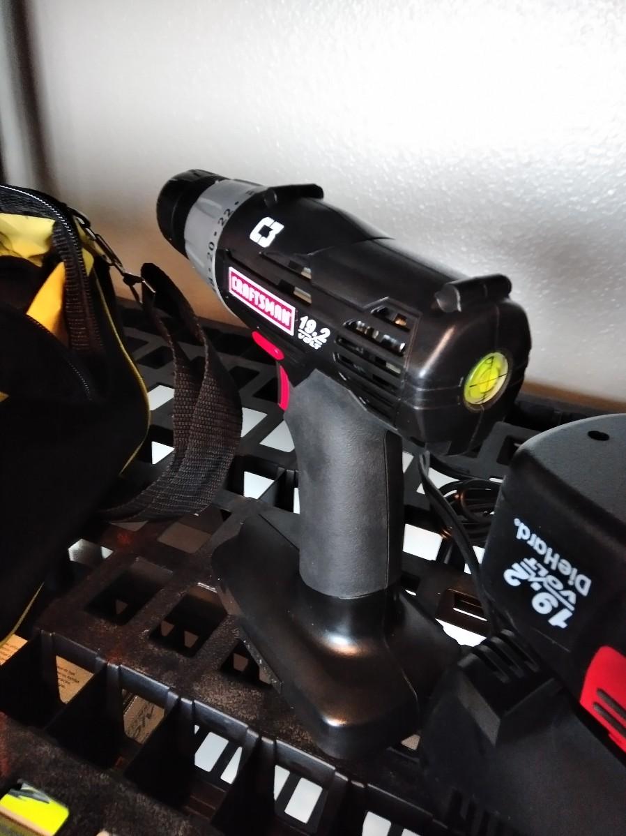 19.2 VOLT CRAFTSMAN CORDLESS DRILL DRIVER WITH BATTERY, CHARGER, INSTRUCTIONS, YELLOW AND BLACK TOOL BAG AND EXTRA DRILL BITS.