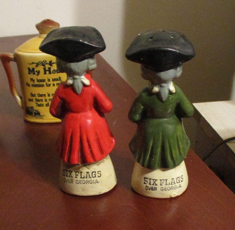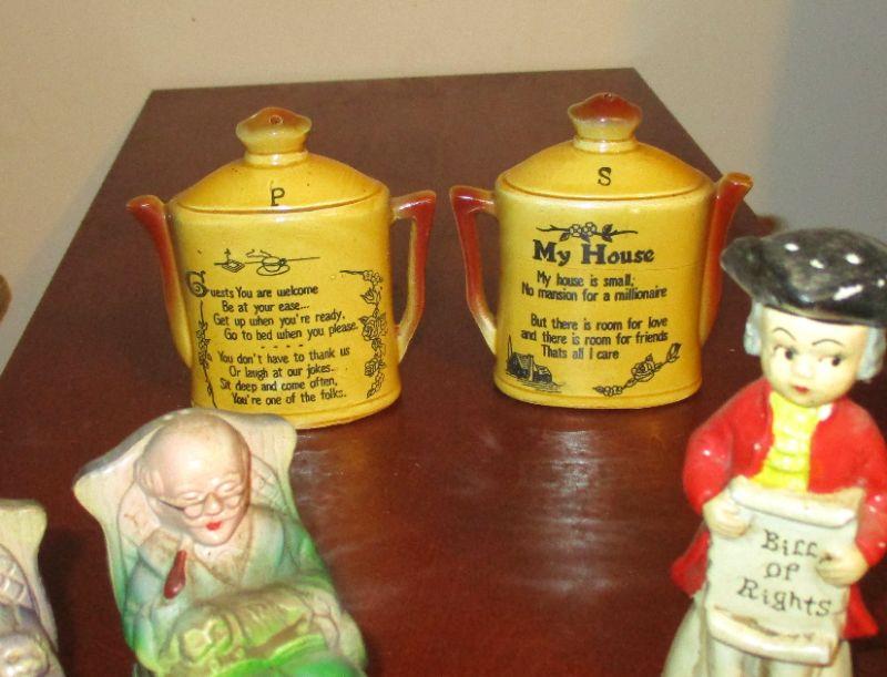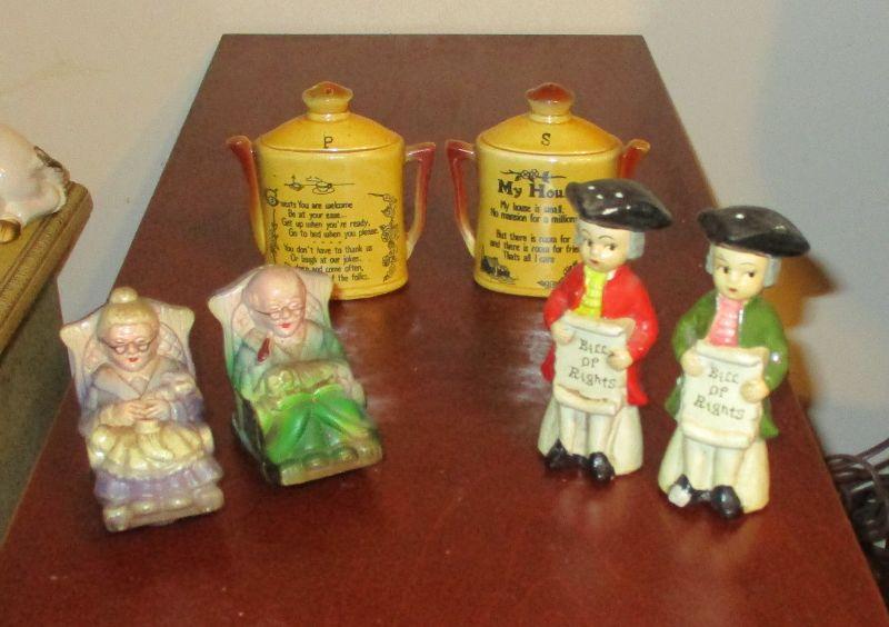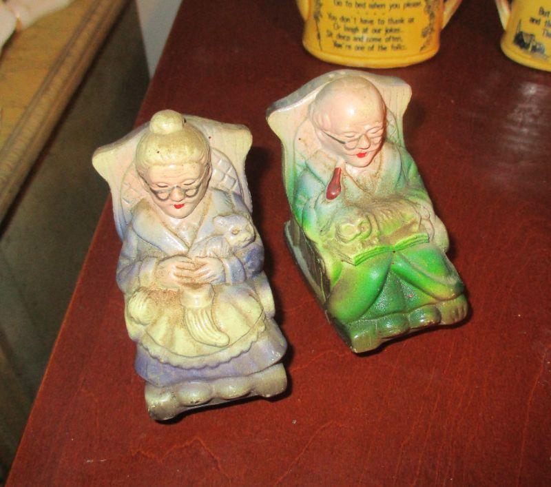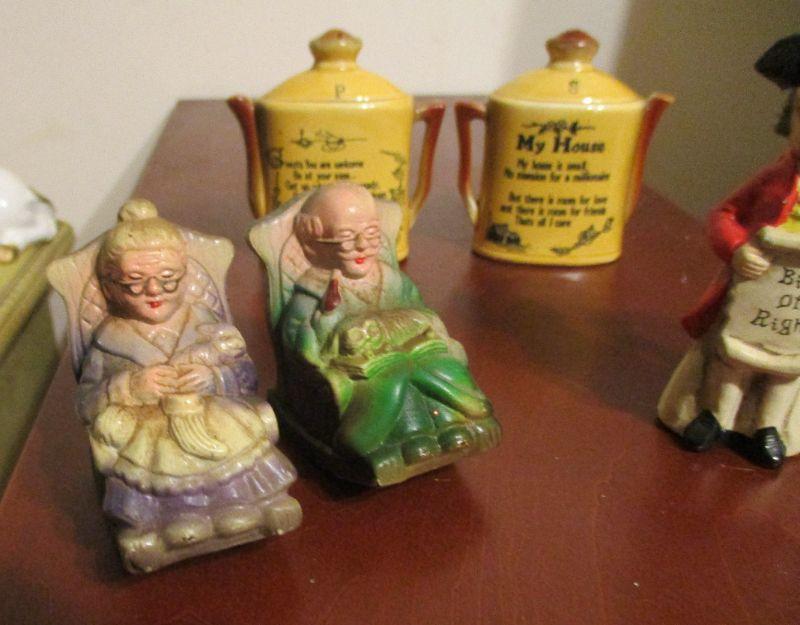 The grandma and grandpa are made of plastic, the other two sets are ceramic. All have their stoppers and the two ceramic ones have stickers saying Made in Japan.