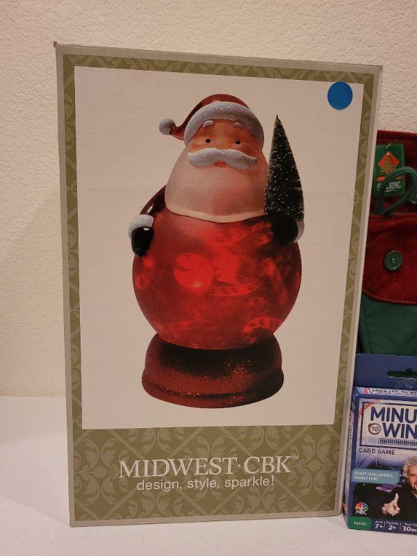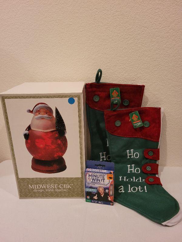 Lot 77: (2) New HO HO HO Christmas Stockings + Santa NEW LED Display