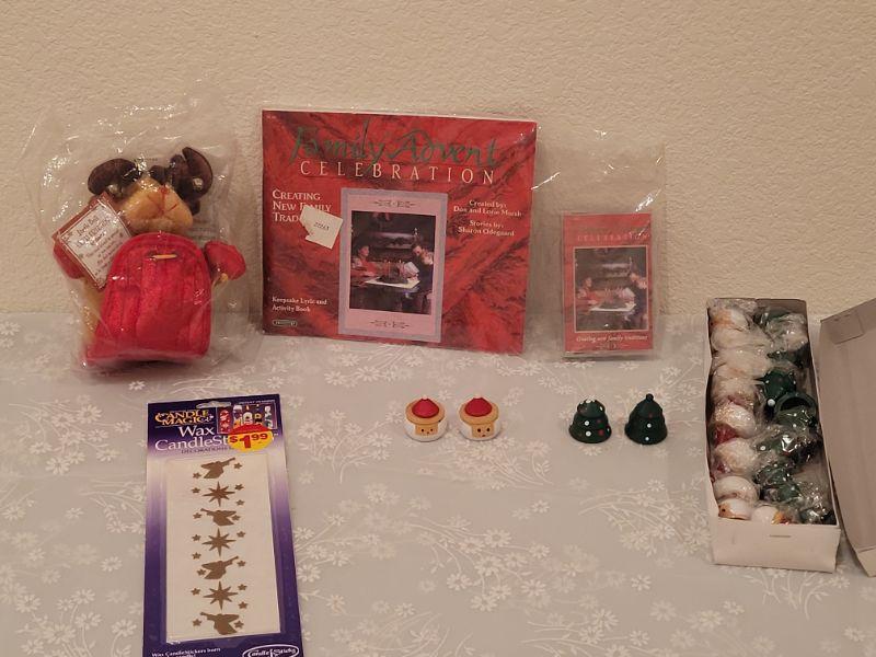 Lot 77: Vintage Christmas Deco, Advent Calendar & Tape, Candle Stickers and Ganz Sledding Reindeer