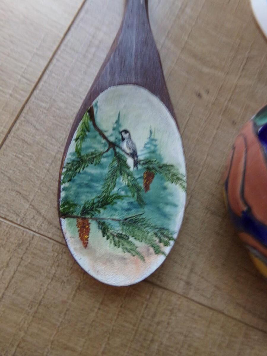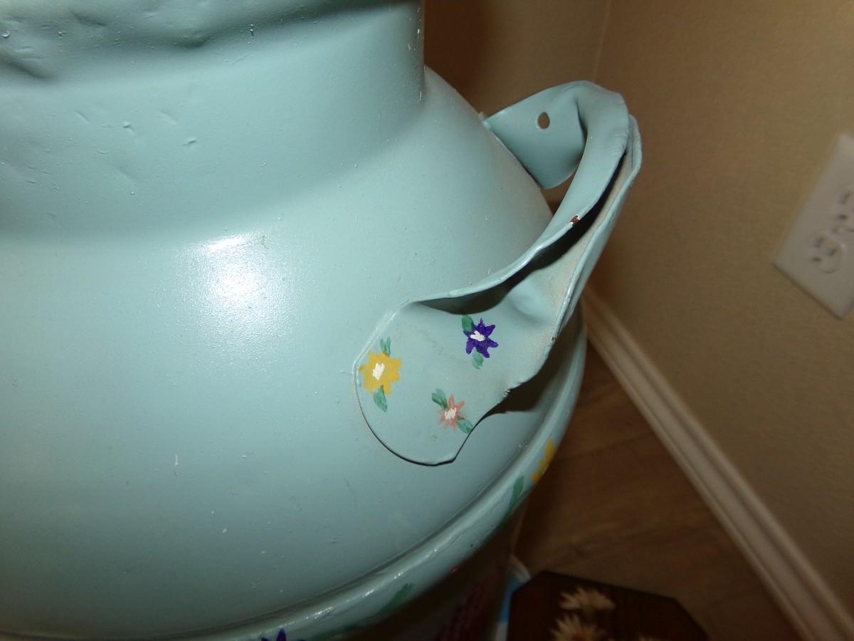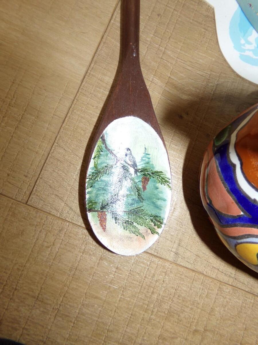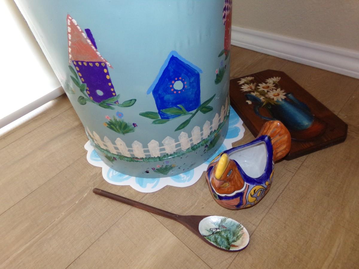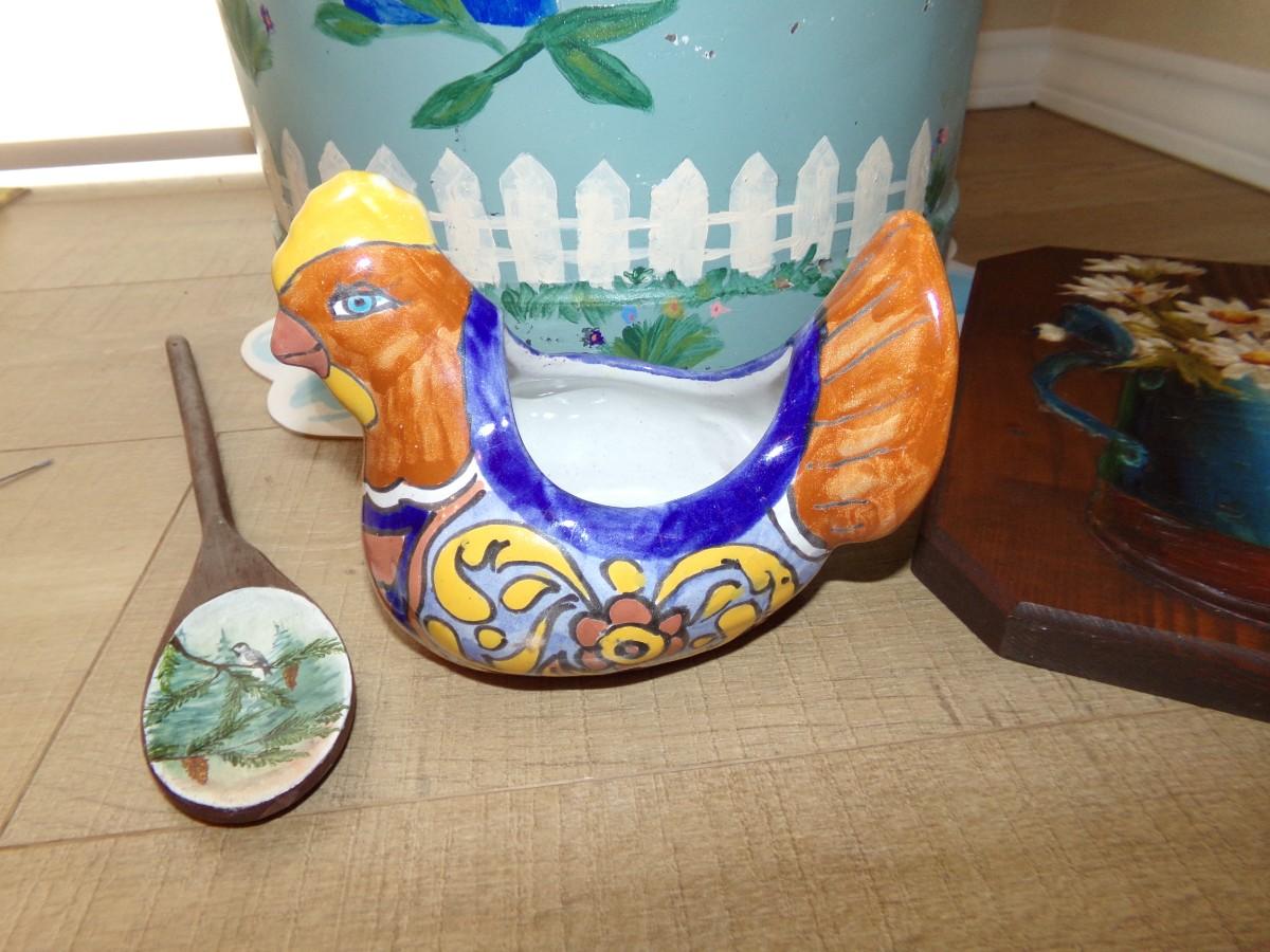 BLUE PAINTED MILK CAN WITH BIRD HOUSES, PAINTED WOODEN SPOON, AND ENAMEL COFFEE POT WITH DAISY'S PAINTED ON WOOD, AS WELL AS AN ADORABLE DECORATIVE HEN DISH.