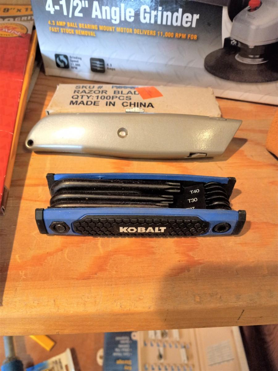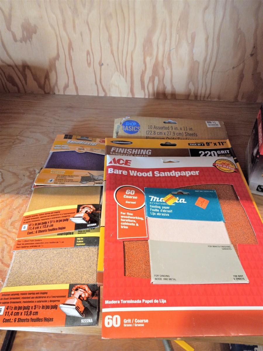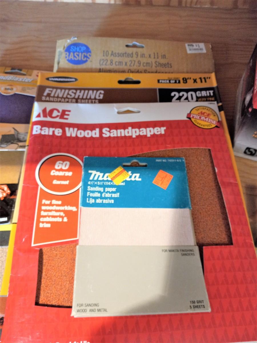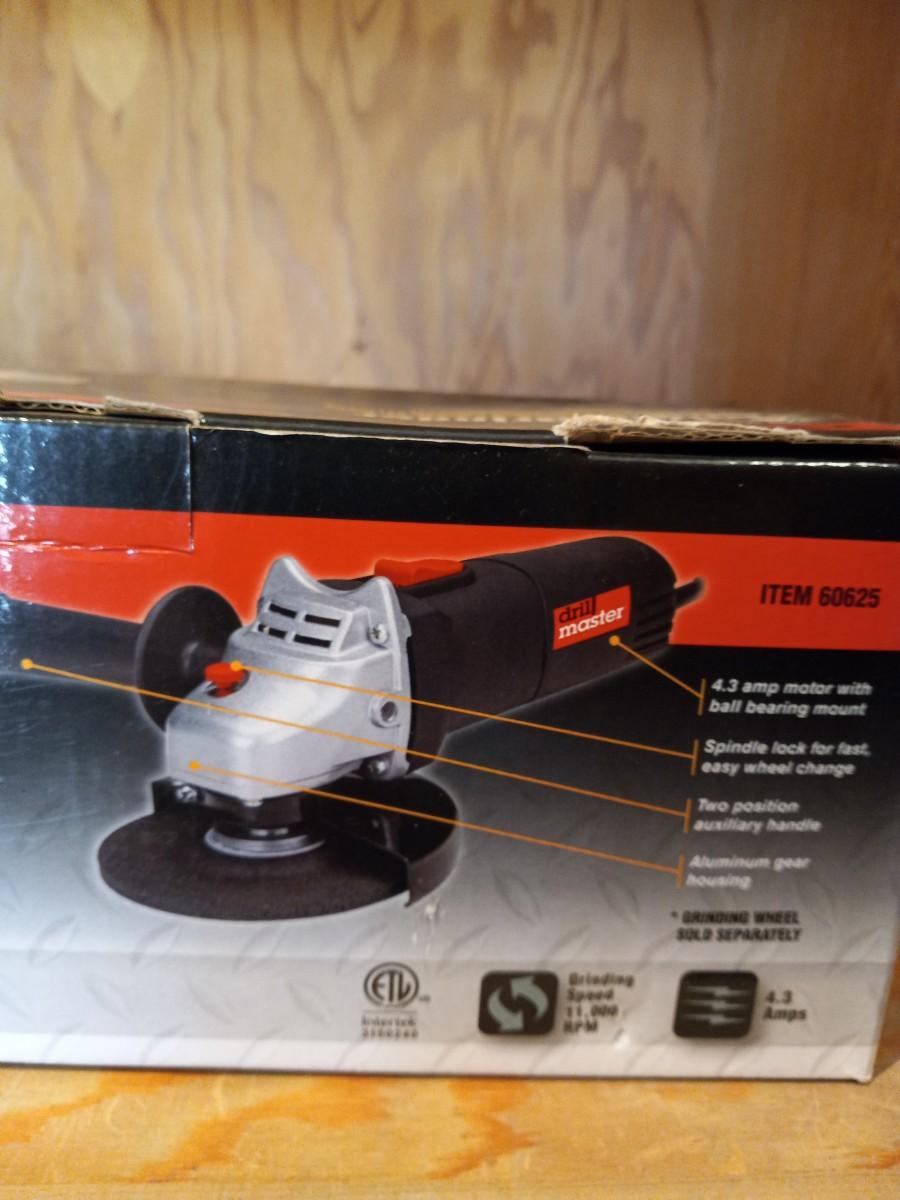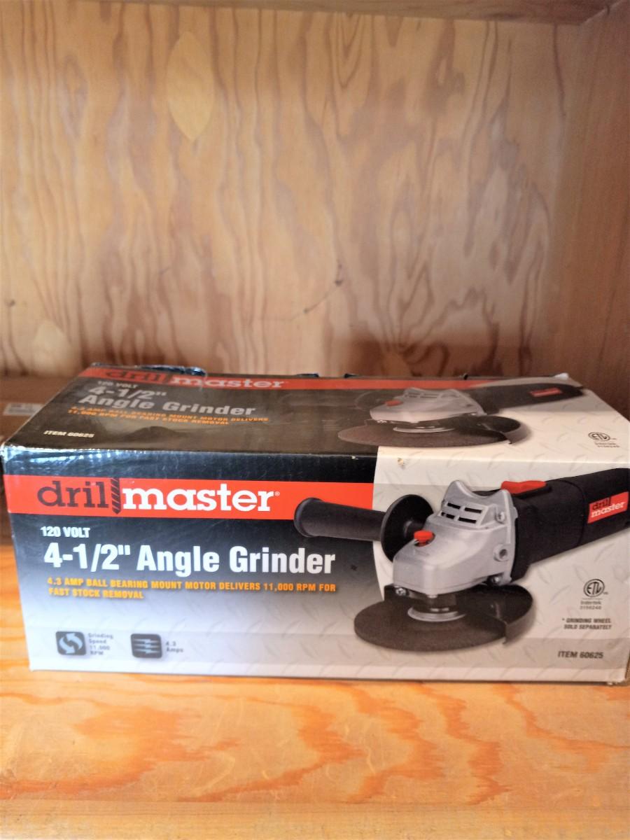 DRILL MASTER ANGLE GRINDER, LEATHER CLIP POCKET, SANDPAPER AND HAND TOOLS