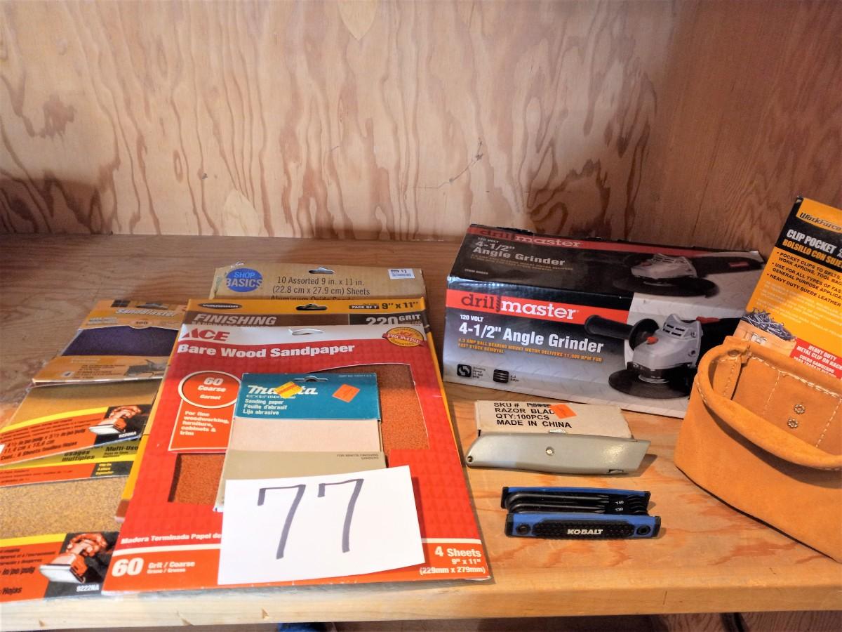 LOT 77 DRILL MASTER ANGLE GRINDER, LEATHER CLIP POCKET, SANDPAPER AND HAND TOOLS