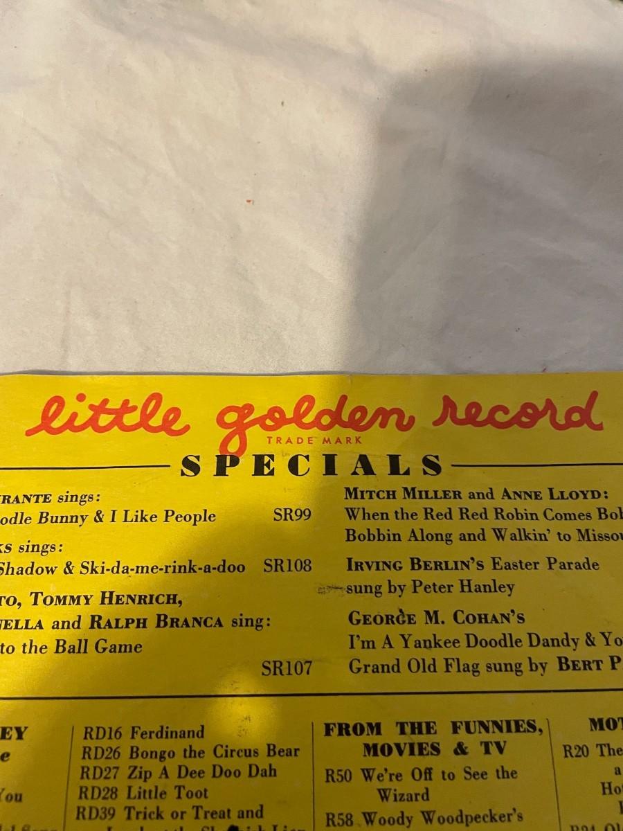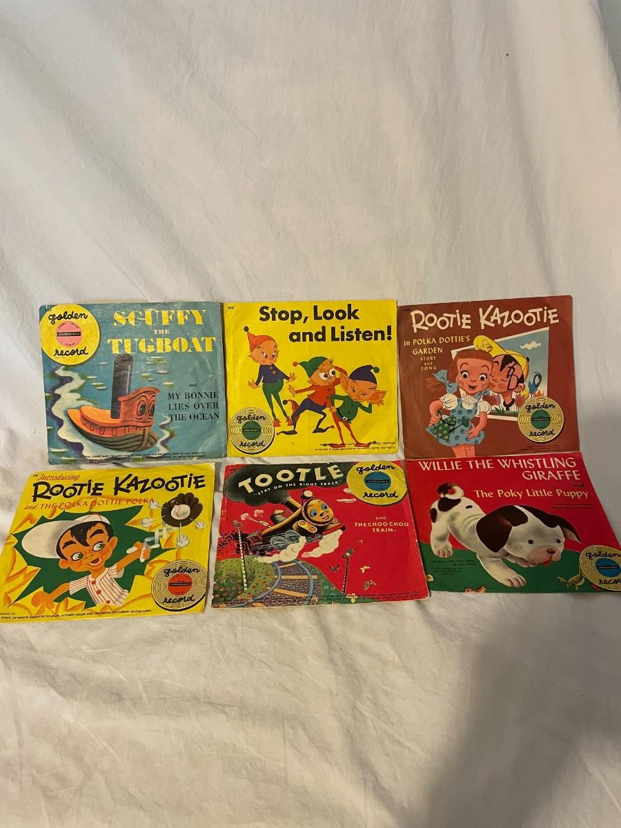 VINTAGE COLLECTABLE CHILDRENS RECORDS. LITTLE GOLDEN RECORDS. FEATURING SCUFFY THE TUGBOAT, STOP LOOK AND LISTEN, ROOTIE KAZOOTIE AND MORE