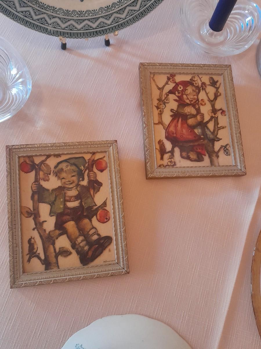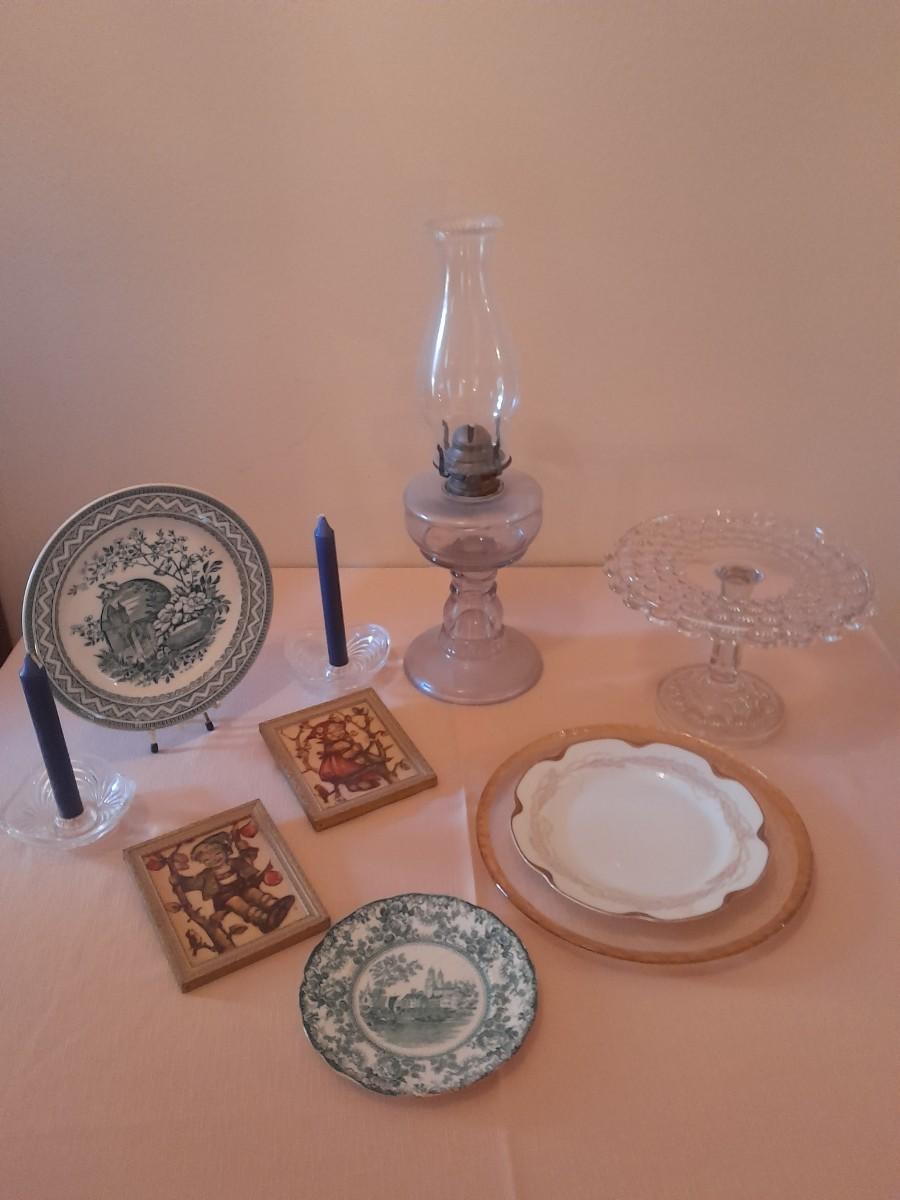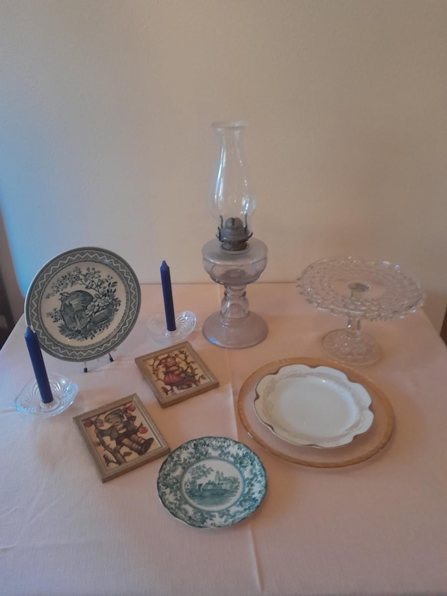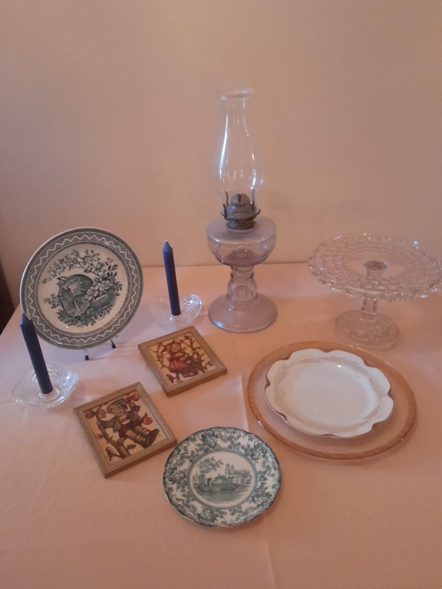 VERY OLD FRAMED HUMMEL PRINTS, VINTAGE OIL LAMP, CAKE PLATE & MORE