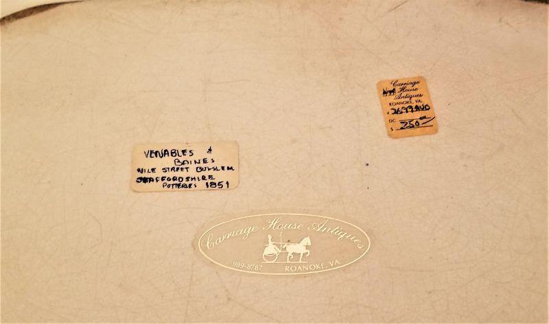 This is a real beauty - original tags on the reverse. It was purchased from Carriage House Antiques in Roanoke, VA for $250.00. Staffordshire, 1851. Antique condition - small firing error upper rim (does not detract). 17.25" x 13.25". A great classic look .