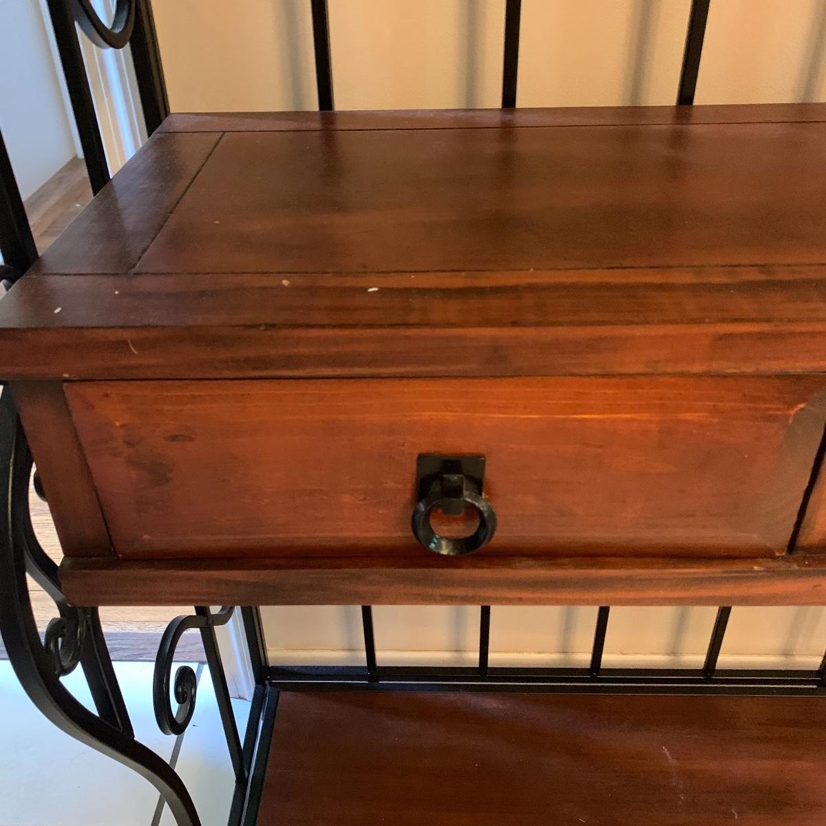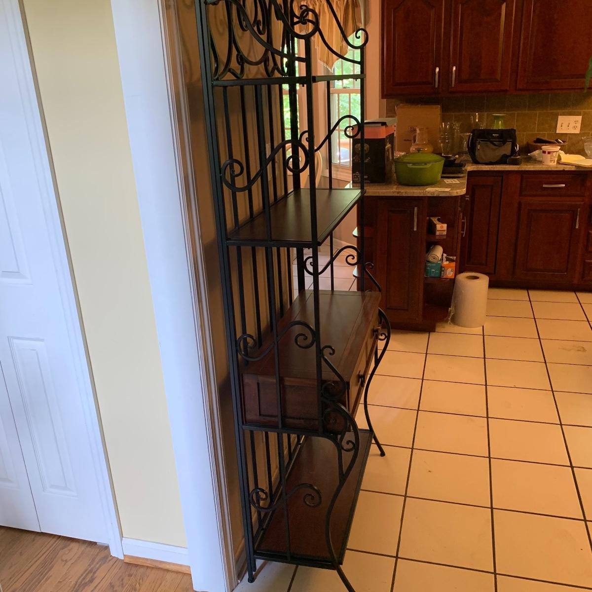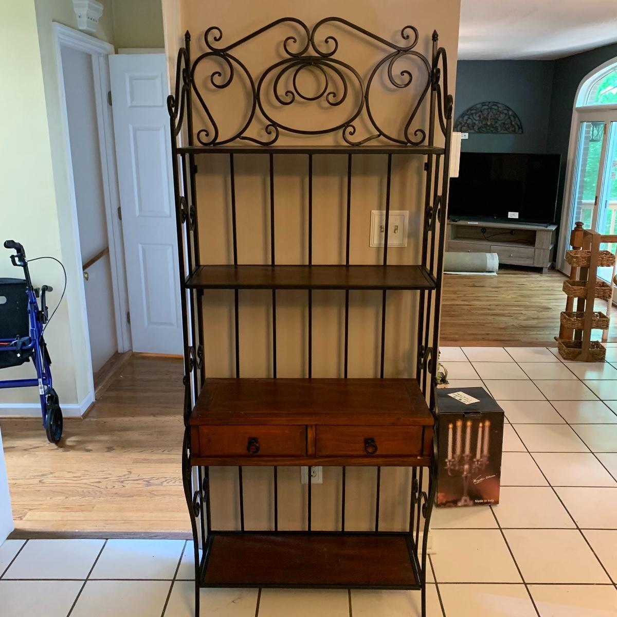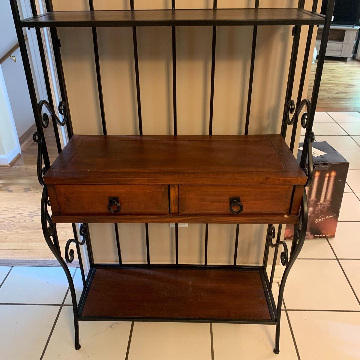 Need a place to let that fresh bread or pies cool off? This bakers rack has four shelves (removable) and two drawers offering plenty of storage. It’s a solid piece that’s constructed of pressed wood with black metal frame and black metal drawer pulls. It measures 32” wide X 75” tall X 15” deep. A small nick by the right hand drawer is shown in the last image. Local pickup only.