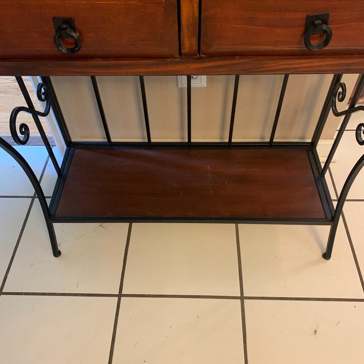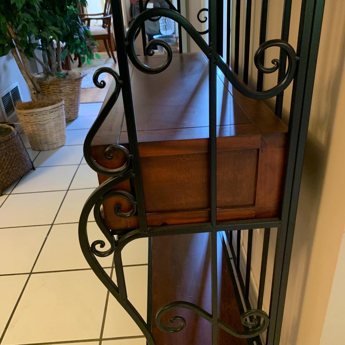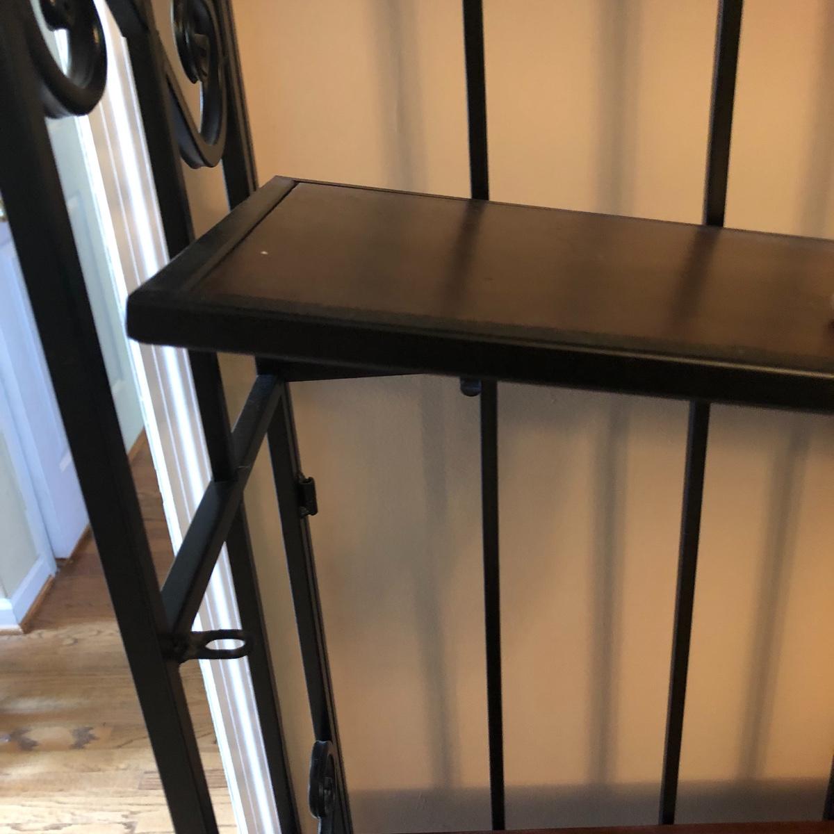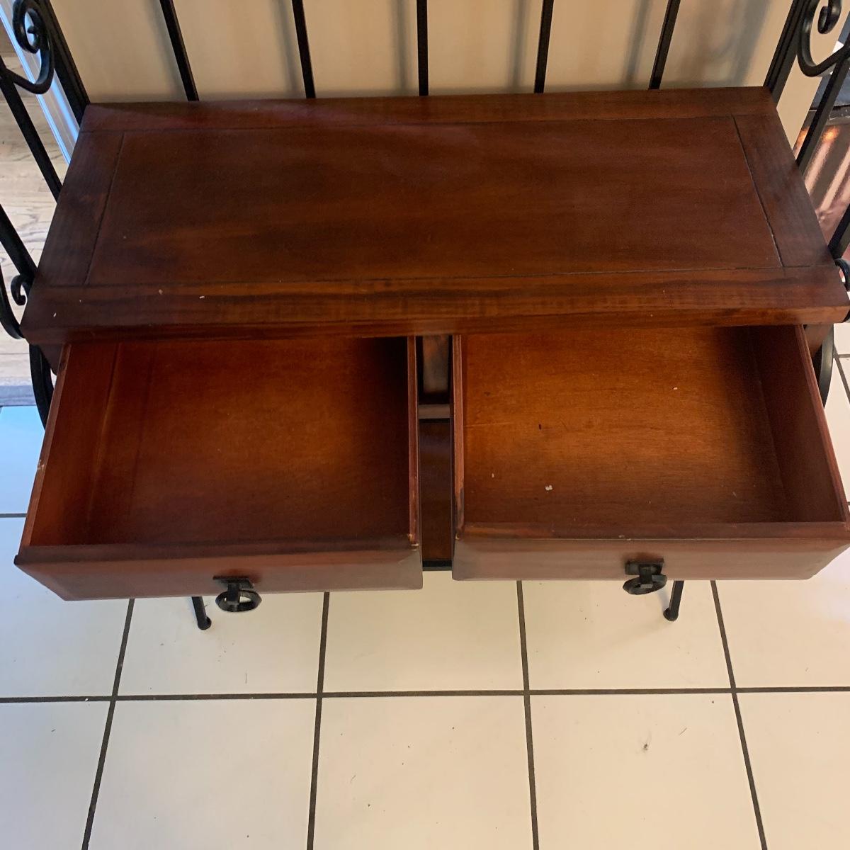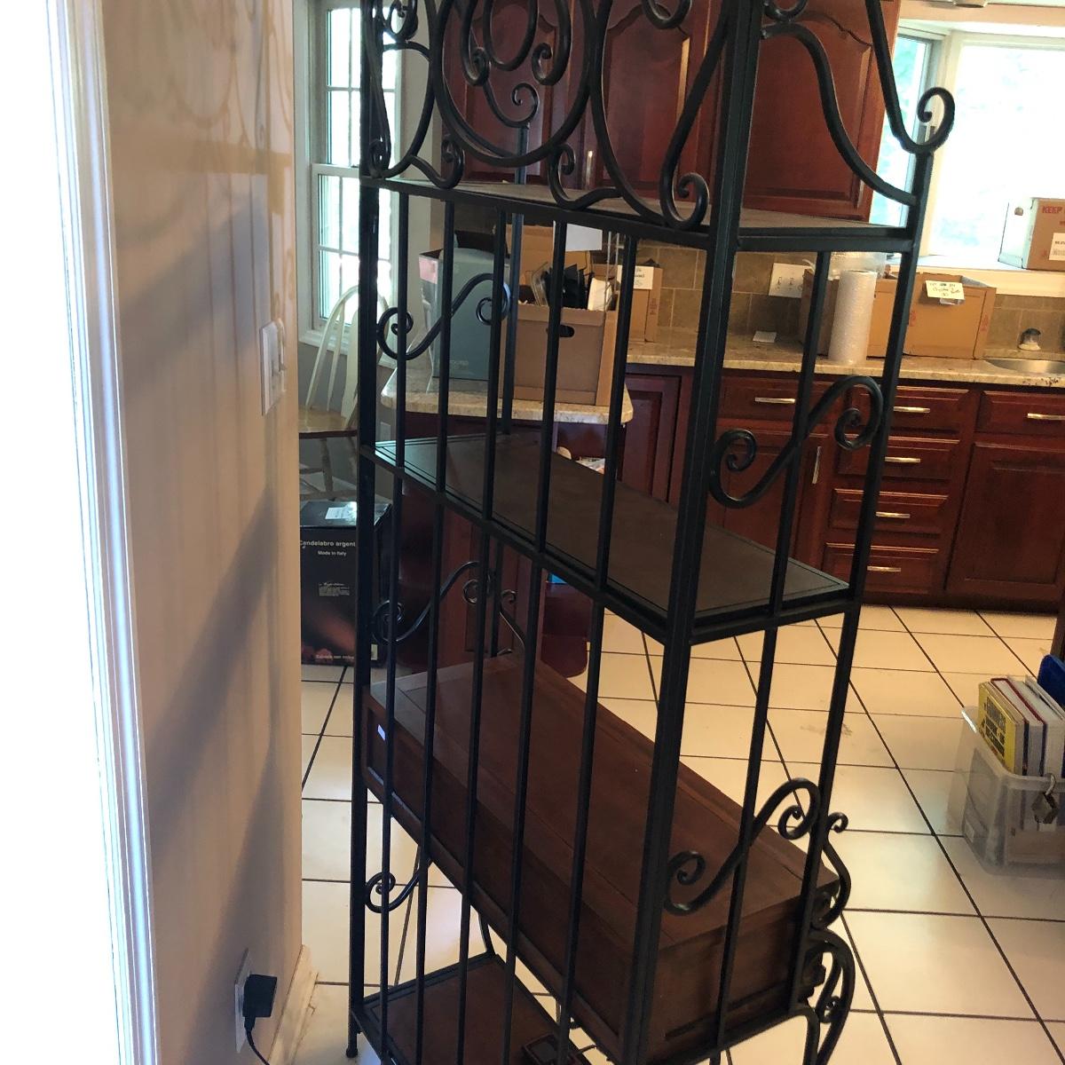 Need a place to let that fresh bread or pies cool off? This bakers rack has four shelves (removable) and two drawers offering plenty of storage. It’s a solid piece that’s constructed of pressed wood with black metal frame and black metal drawer pulls. It measures 32” wide X 75” tall X 15” deep. A small nick by the right hand drawer is shown in the last image. Local pickup only.