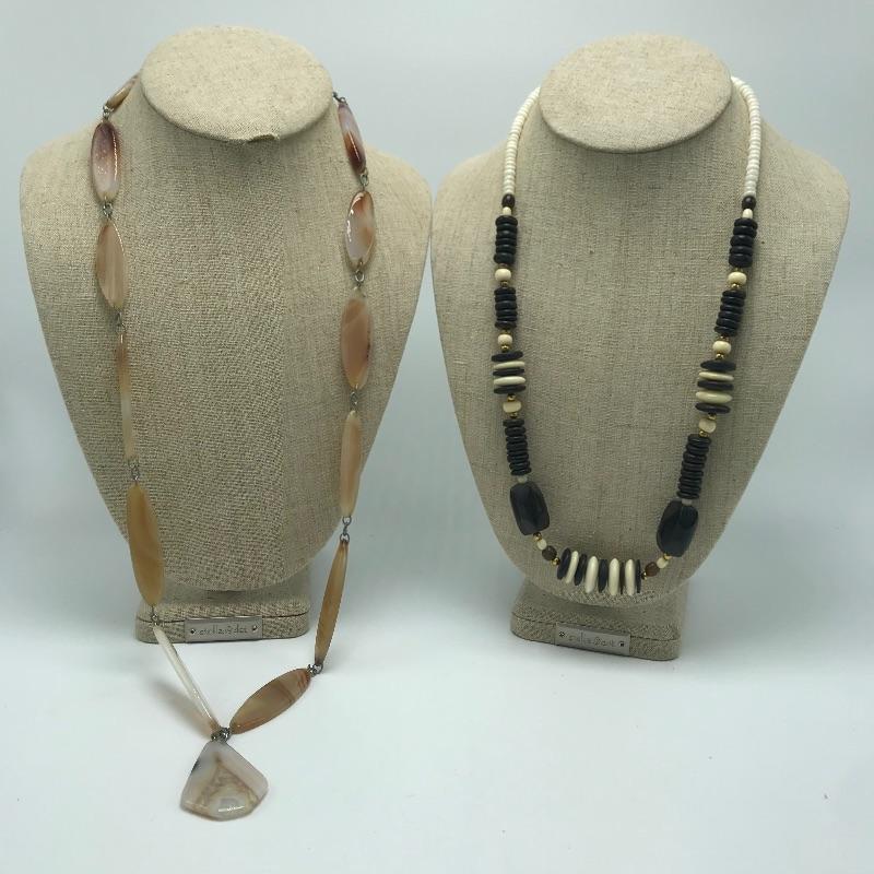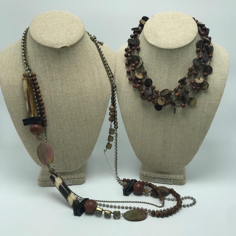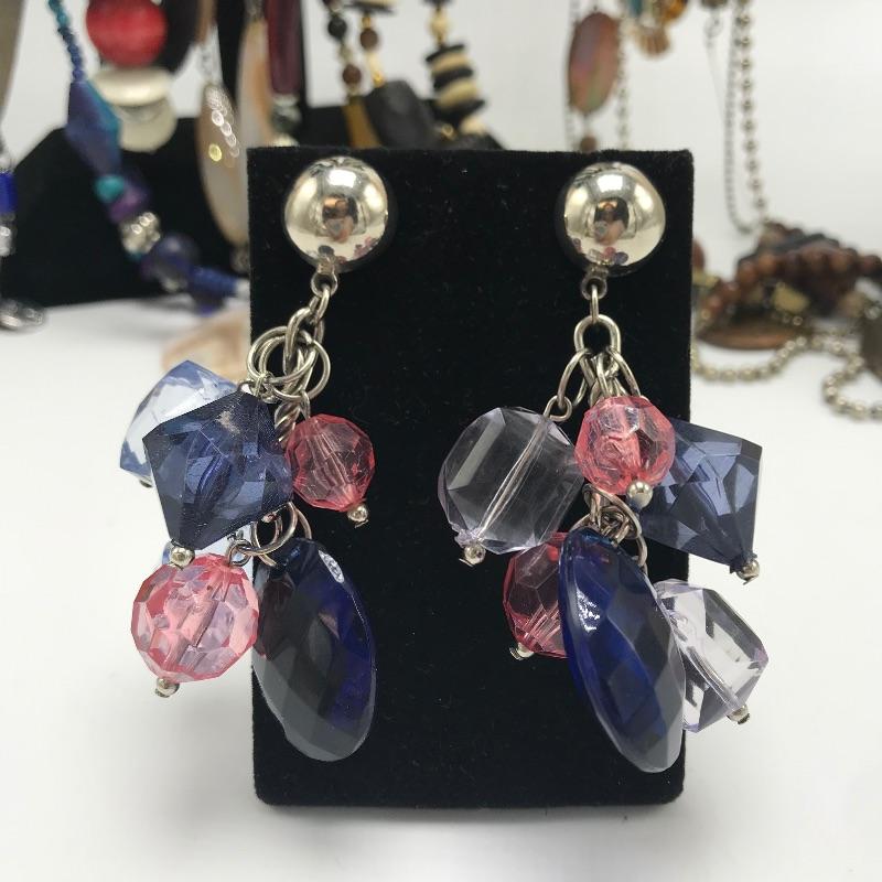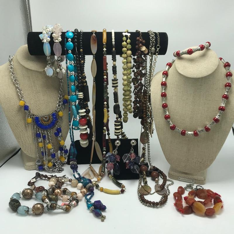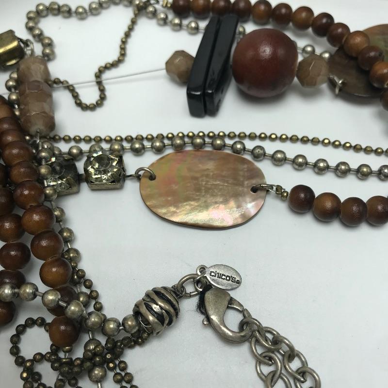 Let your colors shine! Large collection of chunk fashion jewelry with earthly elements! Necklaces, bracelets and a sparkly set of earrings including all sorts of materials like wood, stones, glass, shell and man-made materials too. See photos. One necklace is from Chico’s(The long multi strand one with beads-in pix), the others are unknown.