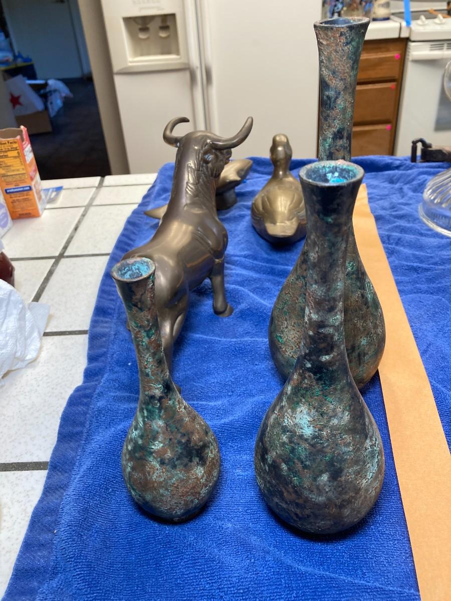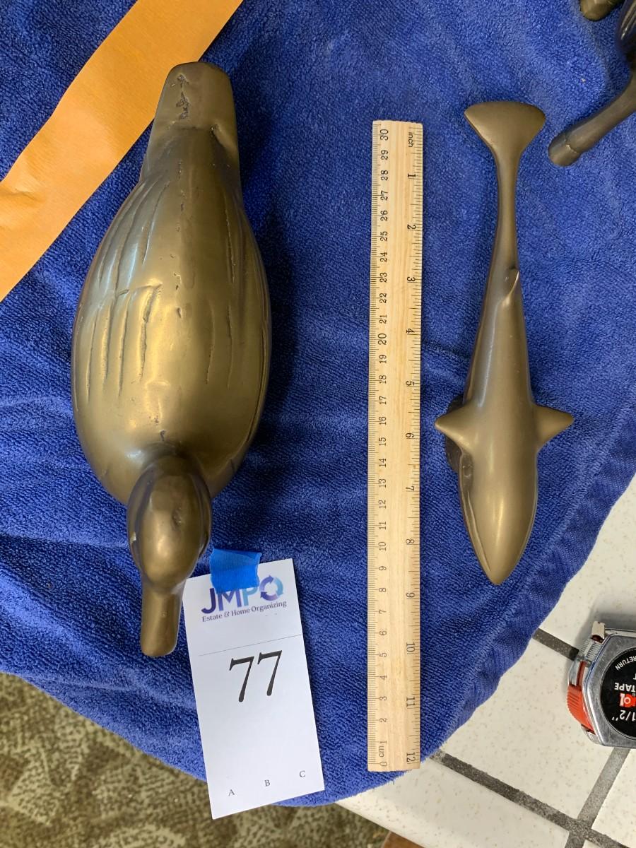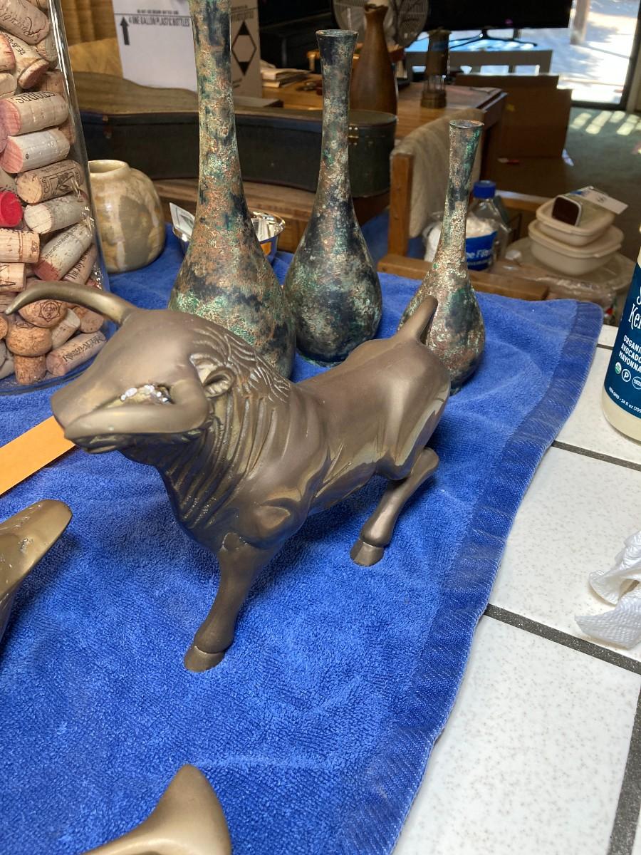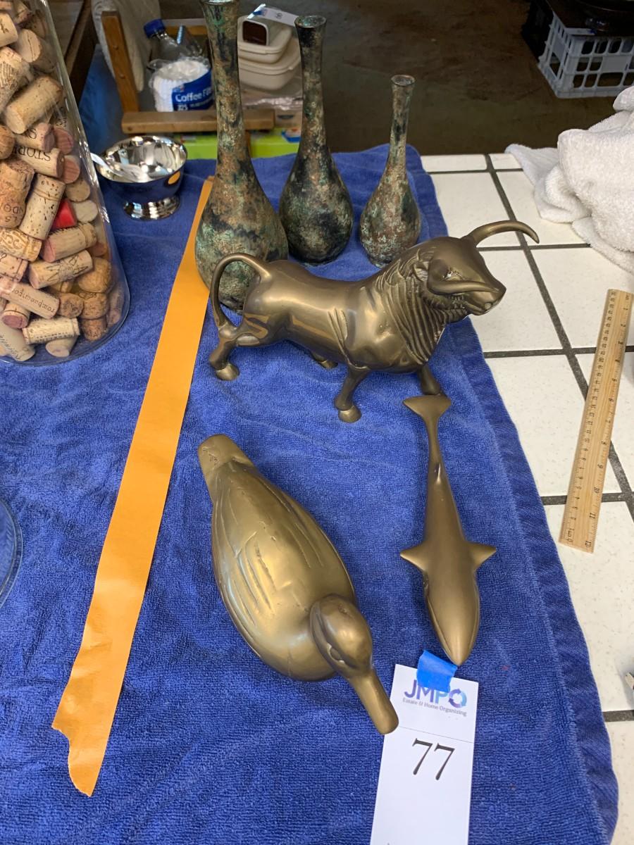 Set of 3 aged metal vases with corrosion. Brass bull 10"L. Brass whale 10"L. Brass duck 11"L.
