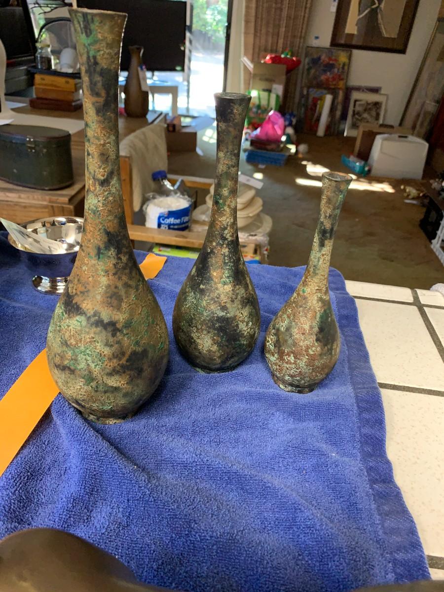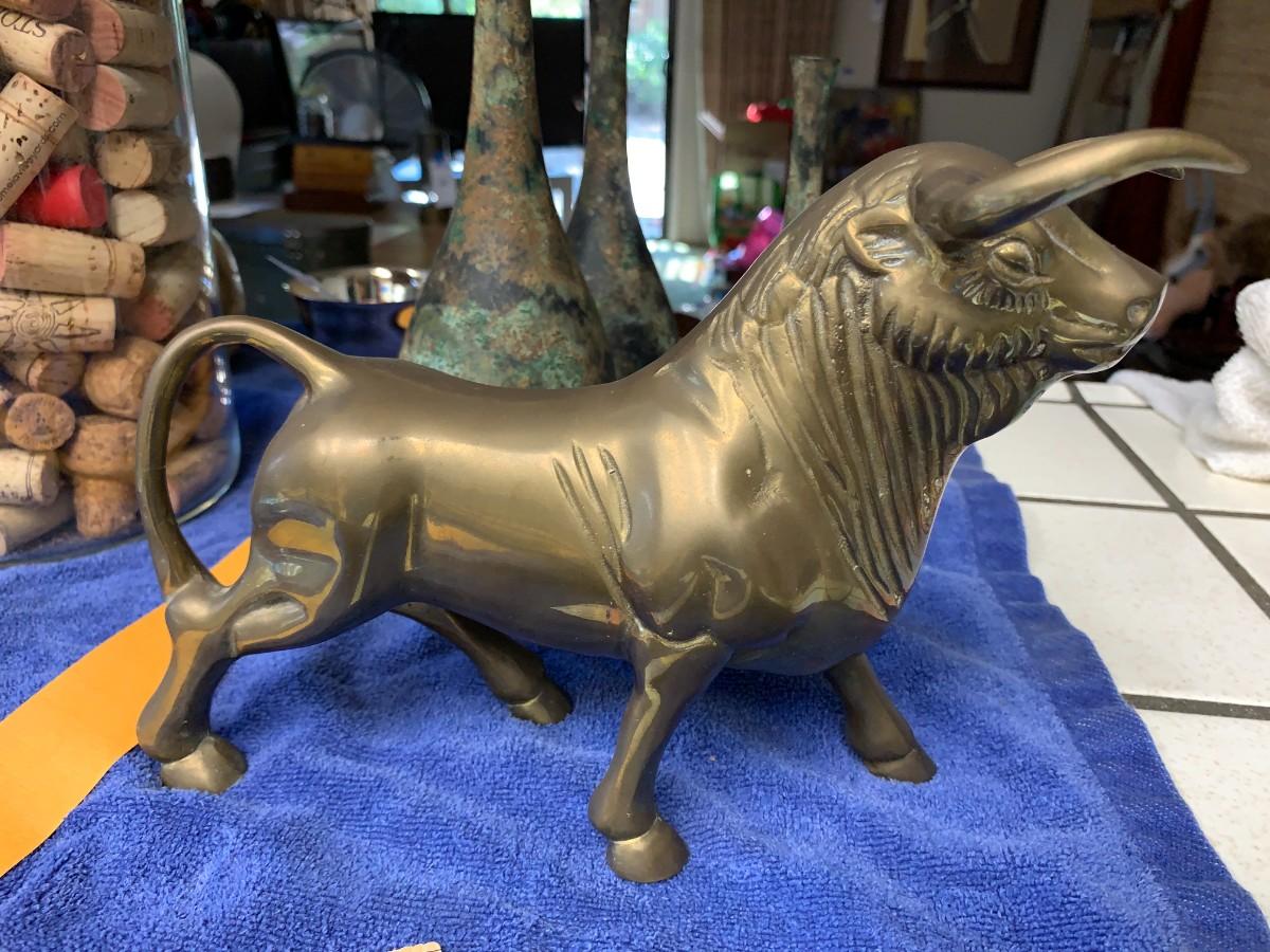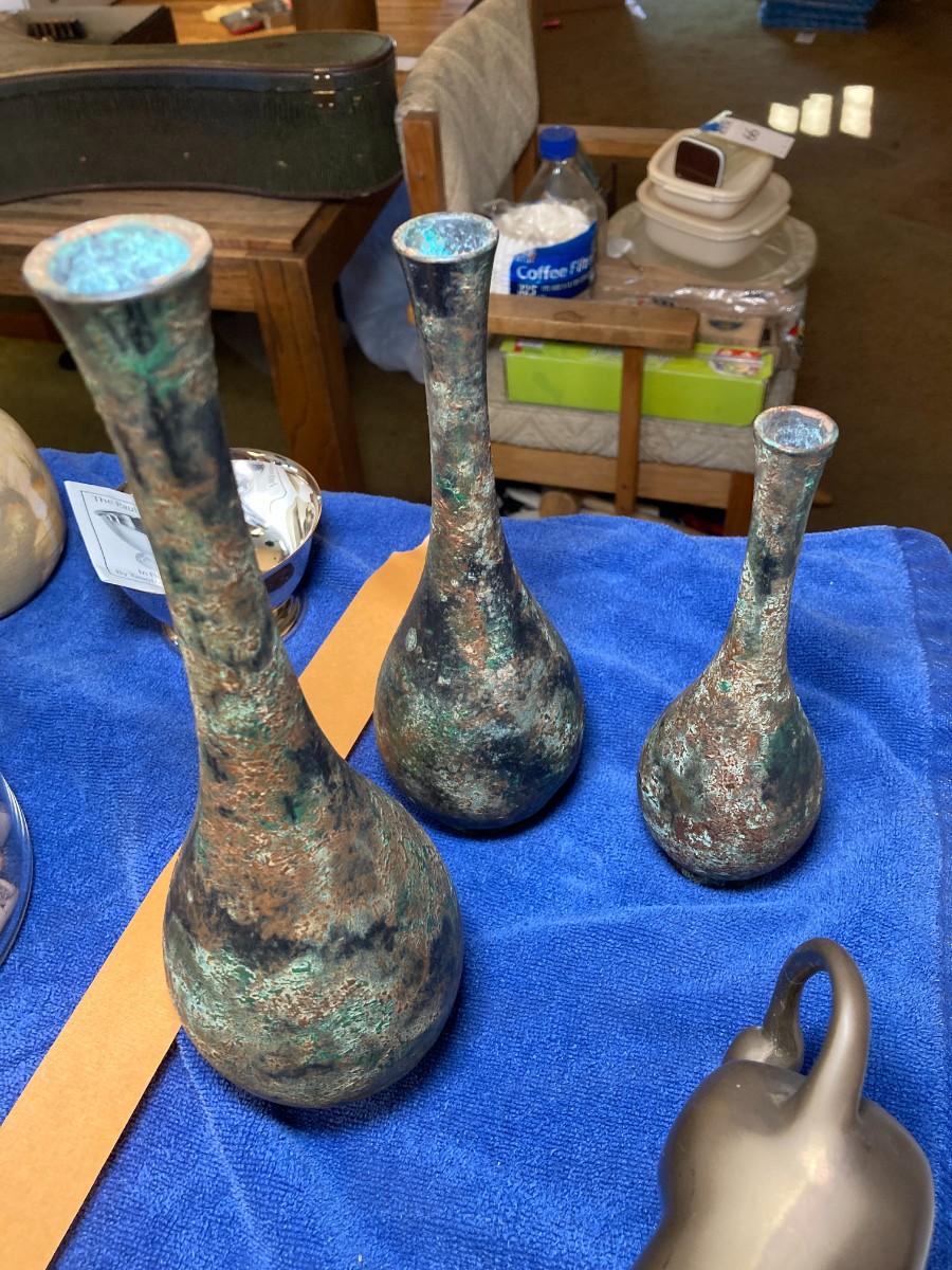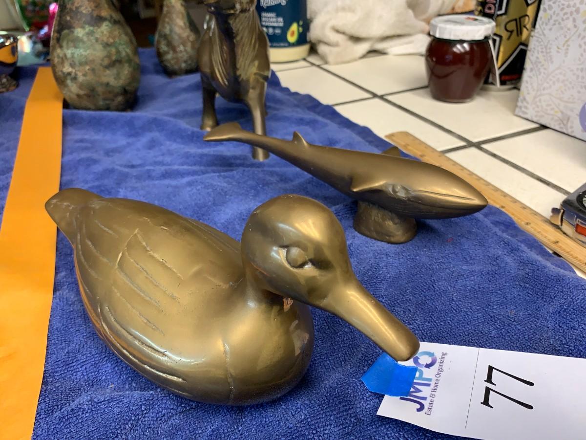 Set of 3 aged metal vases with corrosion. Brass bull 10"L. Brass whale 10"L. Brass duck 11"L.