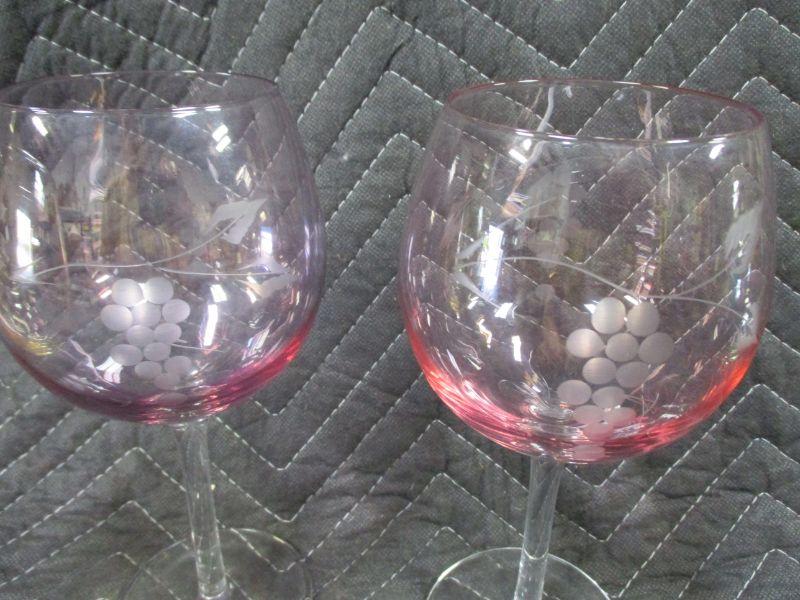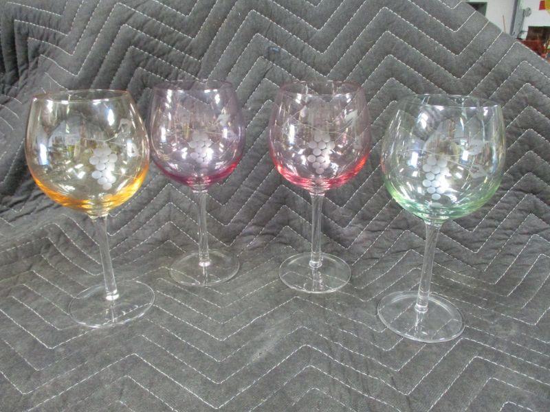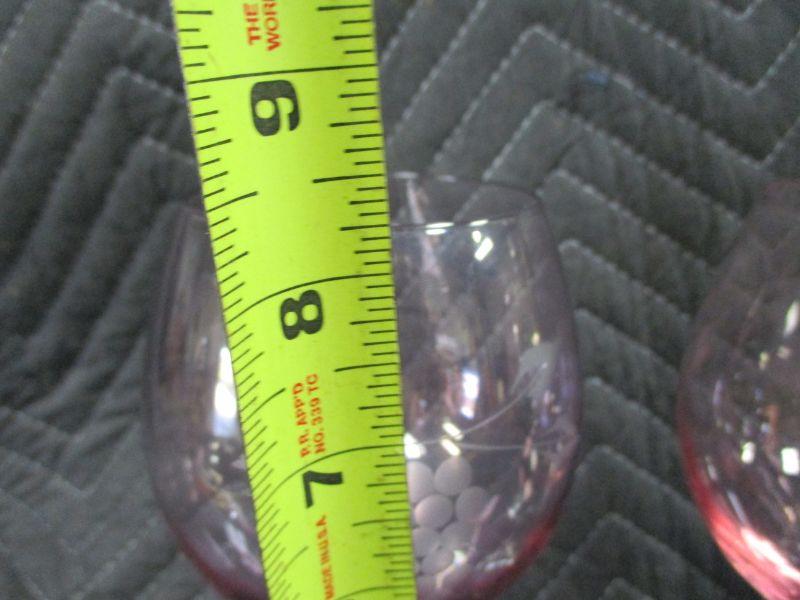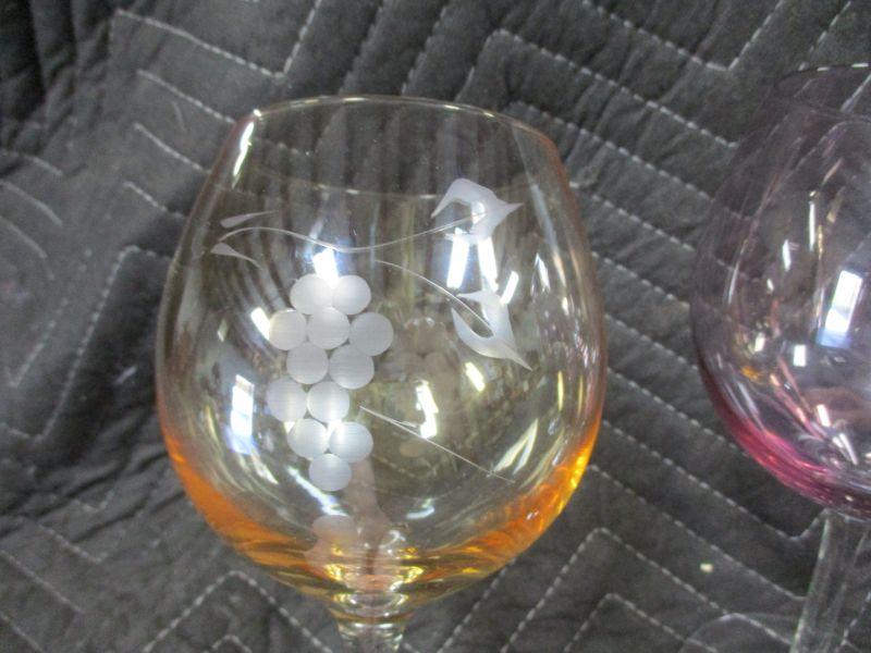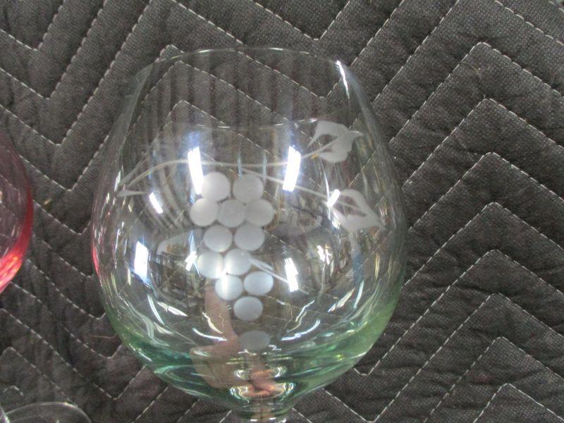 Lot 77 - Colorful Etched Grape On Vine Long Stem Wine Glasses