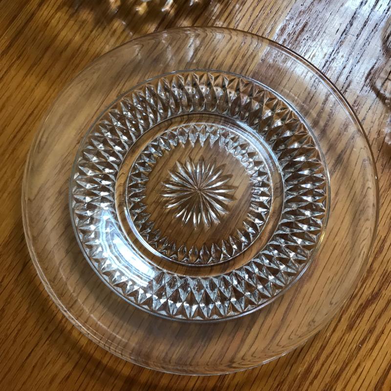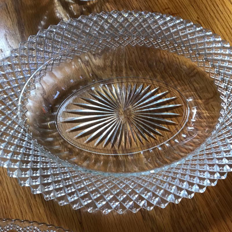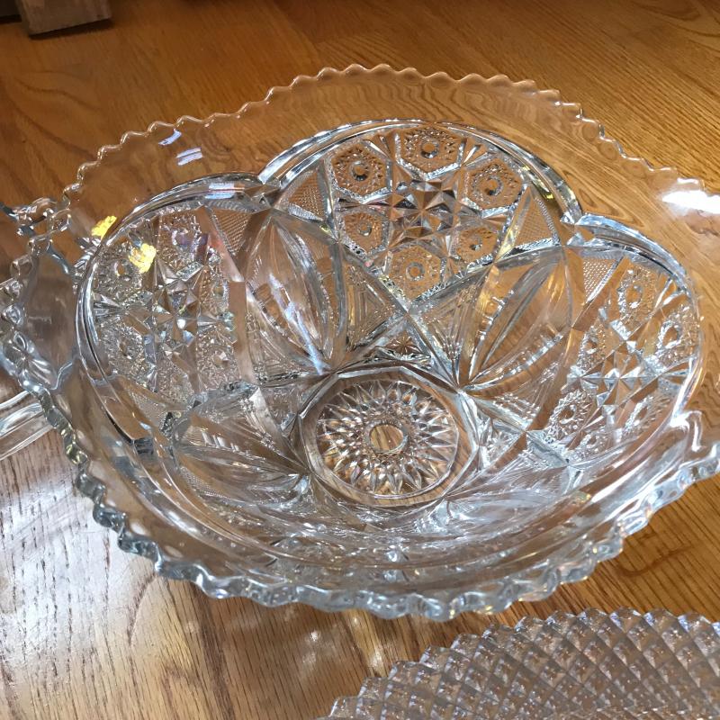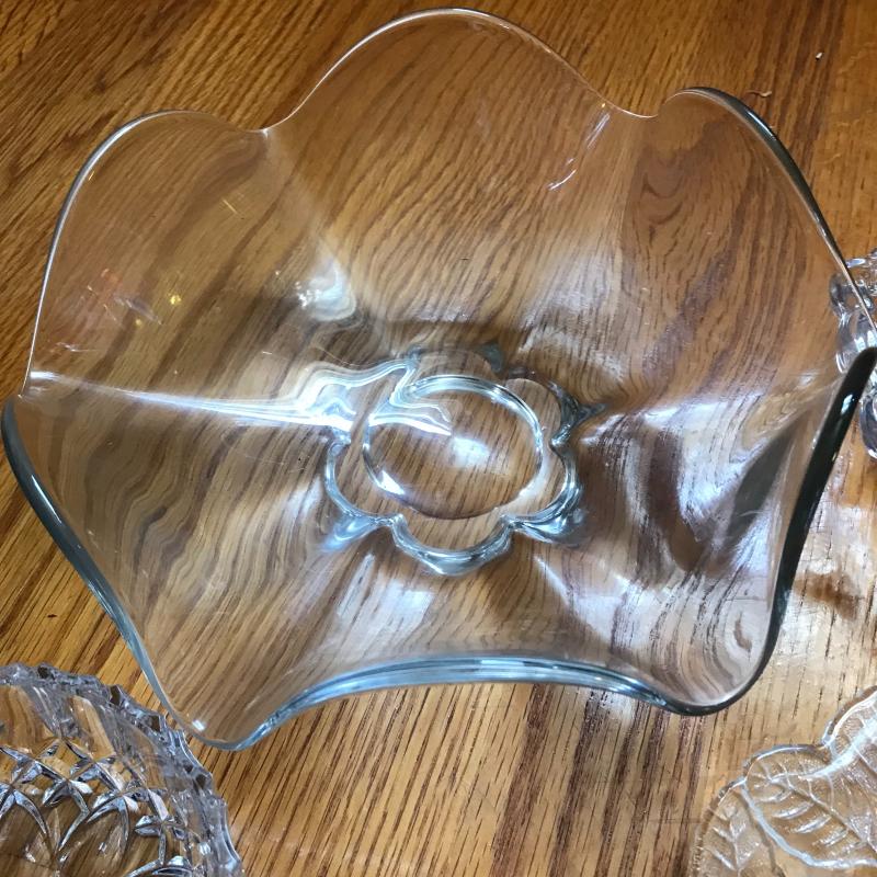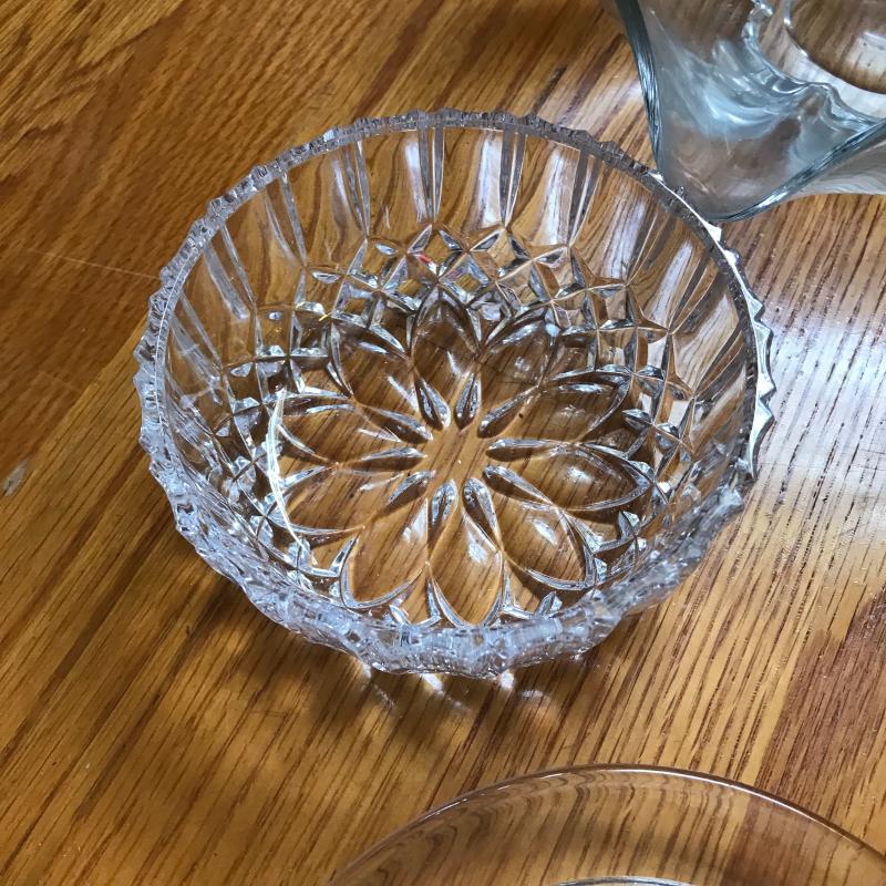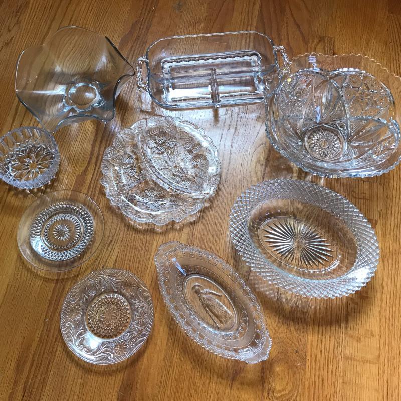 Nine assorted pieces of cut and smooth glass. Largest bowl is approx. 10” in diameter. See pics. No shipping available. Local pickup only in Asheville, NC.